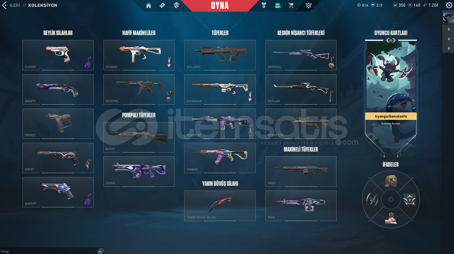 ALACAĞINIZ HESABIN MAİL ŞİFRE TÜM BİLGİLERİ DEĞİŞİR.GÖRSELDE GÖRDÜĞÜNÜZ HESAP TESLİM EDİLECEKTİR.SİLAH RENKLERİNİ SKİN OLARAK SAYMIYORUZ.SUNUCULAR TÜRKİYEDİR PİNGSİZ OYNANIR.DİĞER BÜTÇEYE UYGUN İSTEK SKİNLİ İLANLAR İÇİN BİZE ULAŞIN.