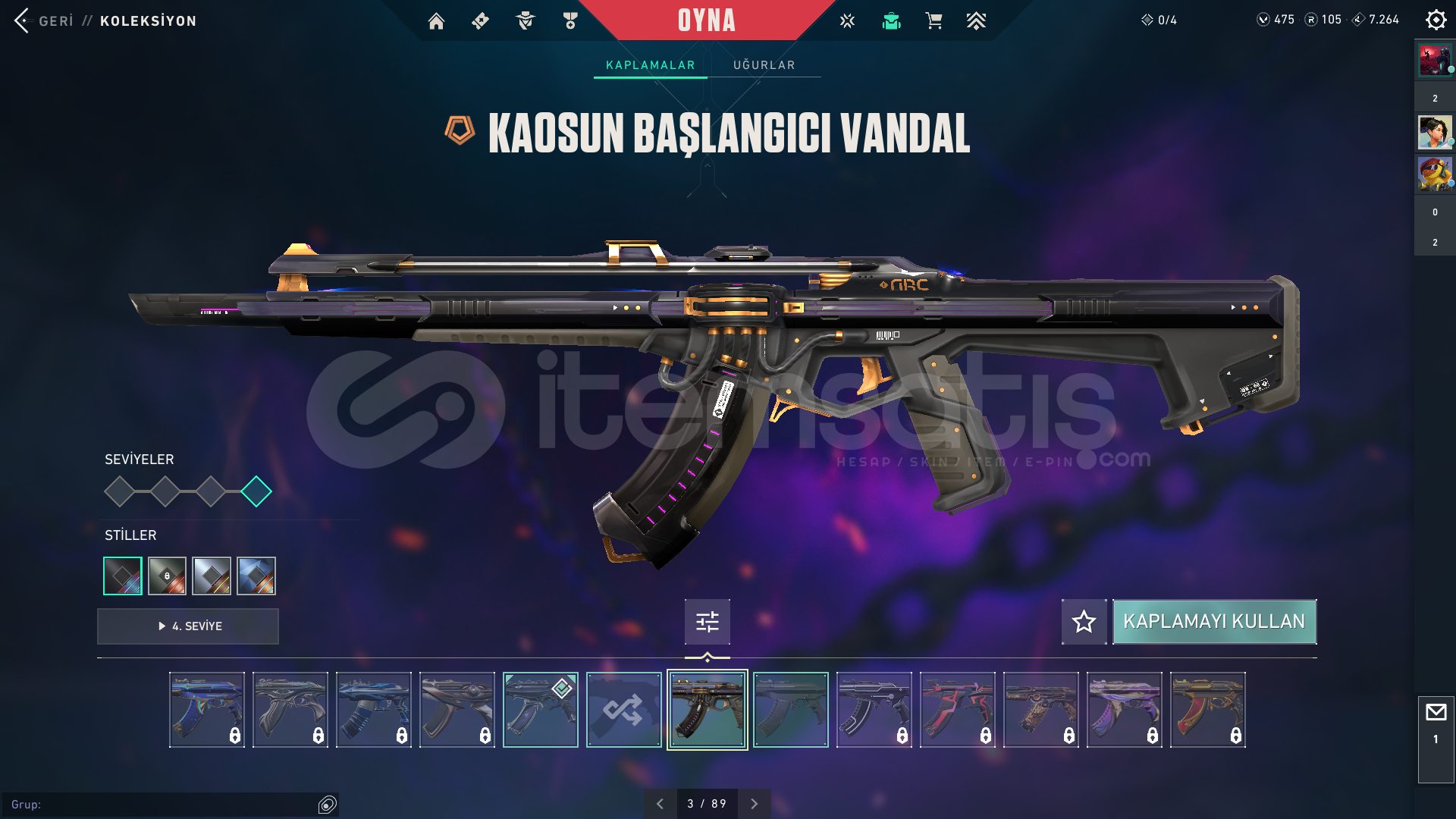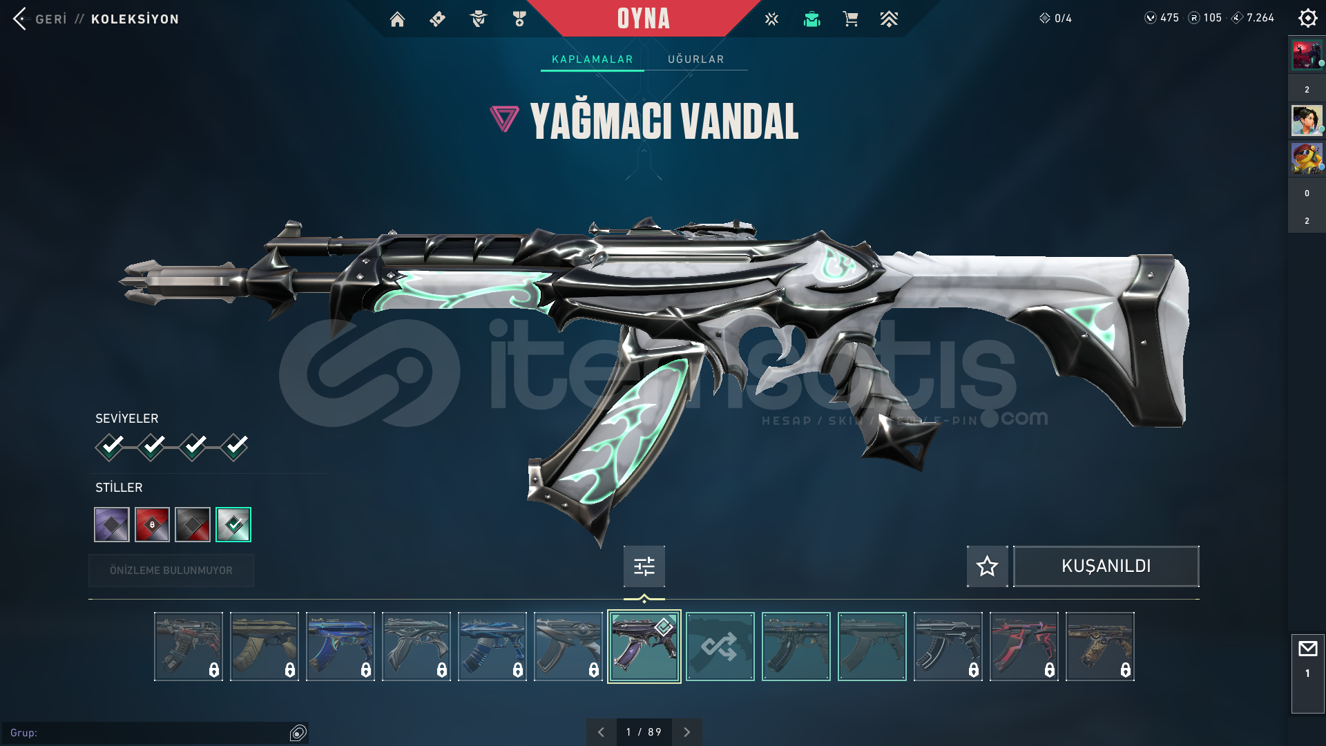 HESABIN İÇERİSİNDE KAOS VANDAL+YAGMACI VANDAL VARDIRHESABIN İÇERİSİNDE TOPLAM 10 ADET SKİN VARDIRRANKI GÜMÜŞ 2 DİRİÇERİSİNDE 475 VP VARDIR