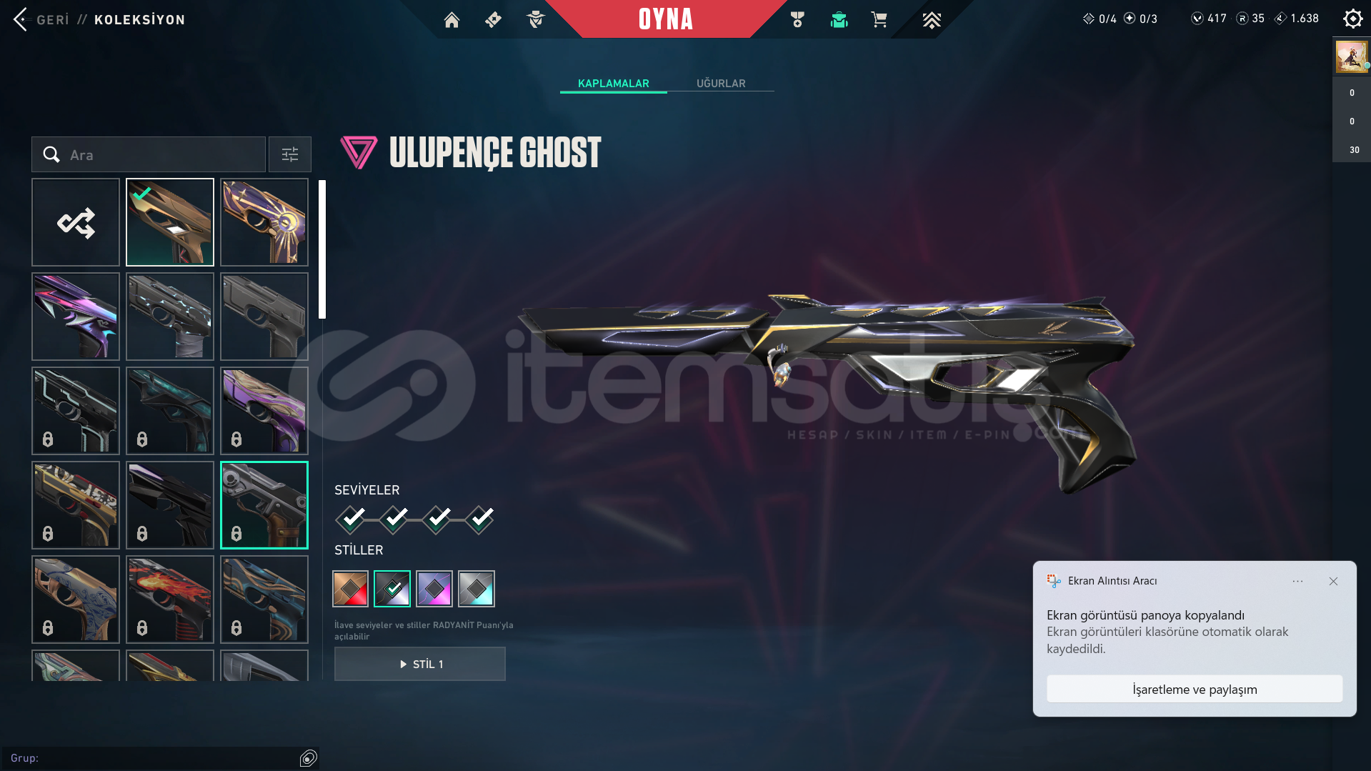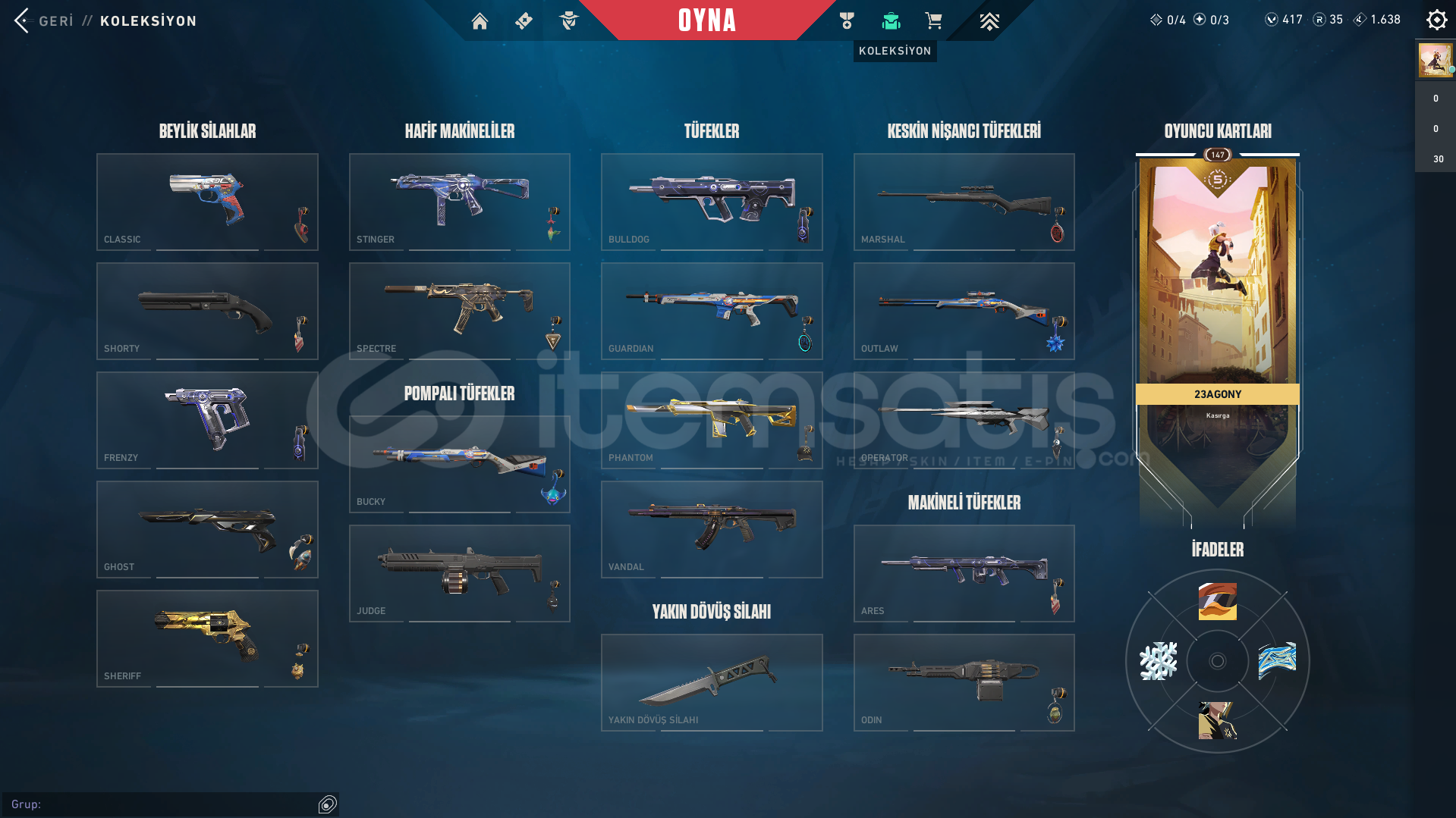 VALORANT HESABI.İÇİNDEKİLER YAZILANLARLA BİRE BİR AYNIDIR.KAYITLI ÜLKE: TRSUNUCU: TRRANK: GÜMÜŞ 3SKİNLER: EXO KAOS NEPTÜN ONİ VANDAL ASİL YILDIZ BELASI PHANTOM YILDIZ BELASI OPERATOR ULUPENÇE GHOST UZAYLI AVCISI BIÇAK UZAY GEÇİDİ BIÇAKLARI