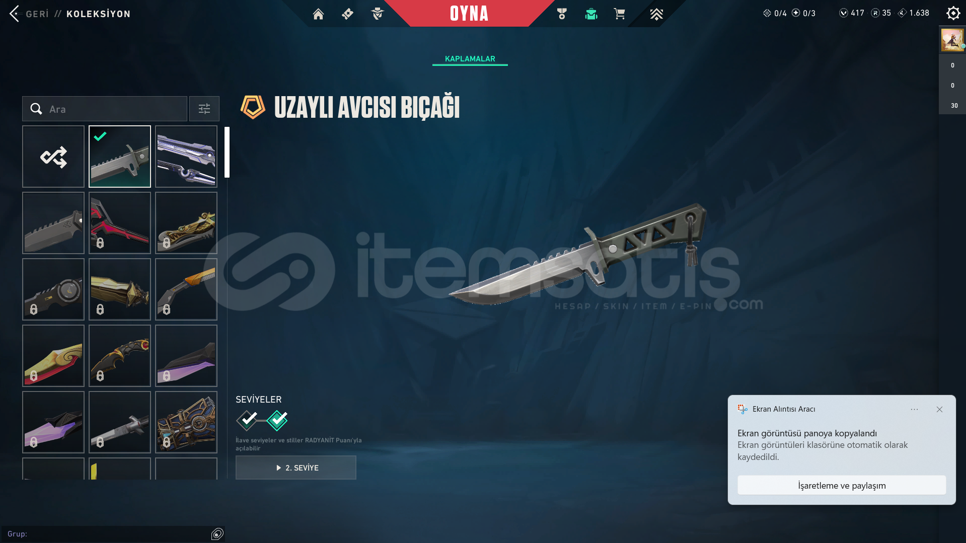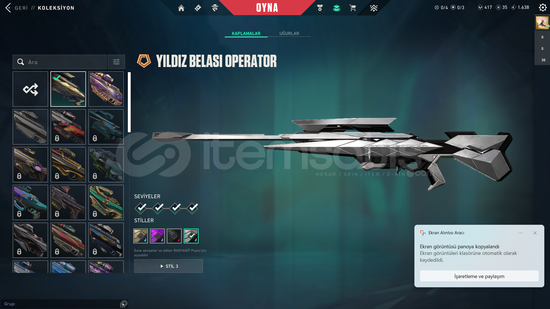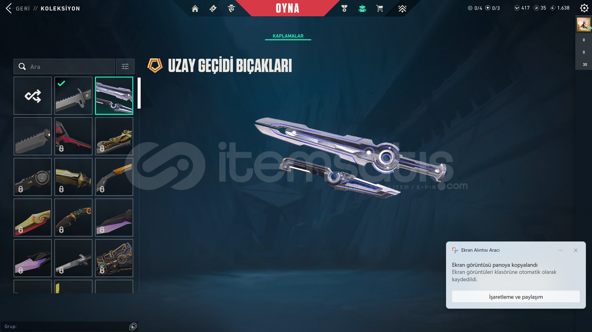 SKİNLER: EXO KAOS NEPTÜN ONİ VANDAL ASİL YILDIZ BELASI PHANTOM YILDIZ BELASI OPERATOR ULUPENÇE GHOST UZAYLI AVCISI BIÇAK UZAY GEÇİDİ BIÇAKLARI
