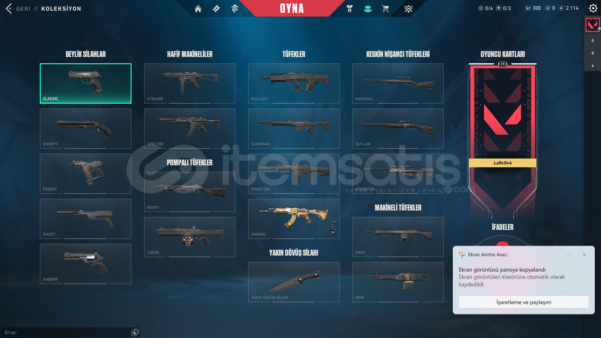 VALORANT HESABI.İÇİNDEKİLER YAZILANLARLA BİRE BİR AYNIDIR.KAYITLI ÜLKE: TRSUNUCU: TRRANK: DERECESİZSKİNLER: SİHİRPUNK VANDAL