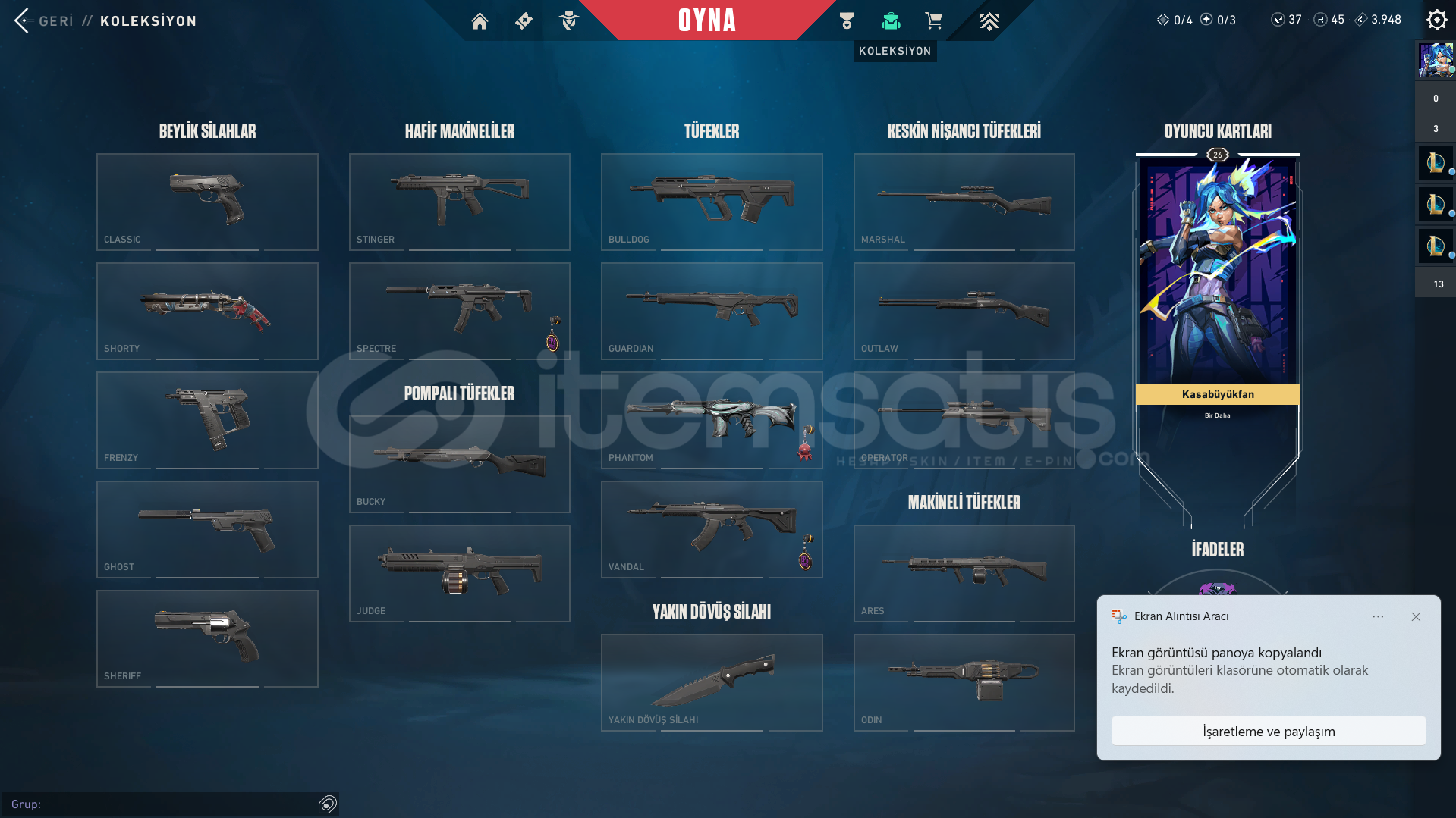 VALORANT HESABI.İÇİNDEKİLER YAZILANLARLA BİRE BİR AYNIDIR.KAYITLI ÜLKE: TRSUNUCU: TRRANK: DERECESİZSKİNLER: YAĞMACI PHANTOM