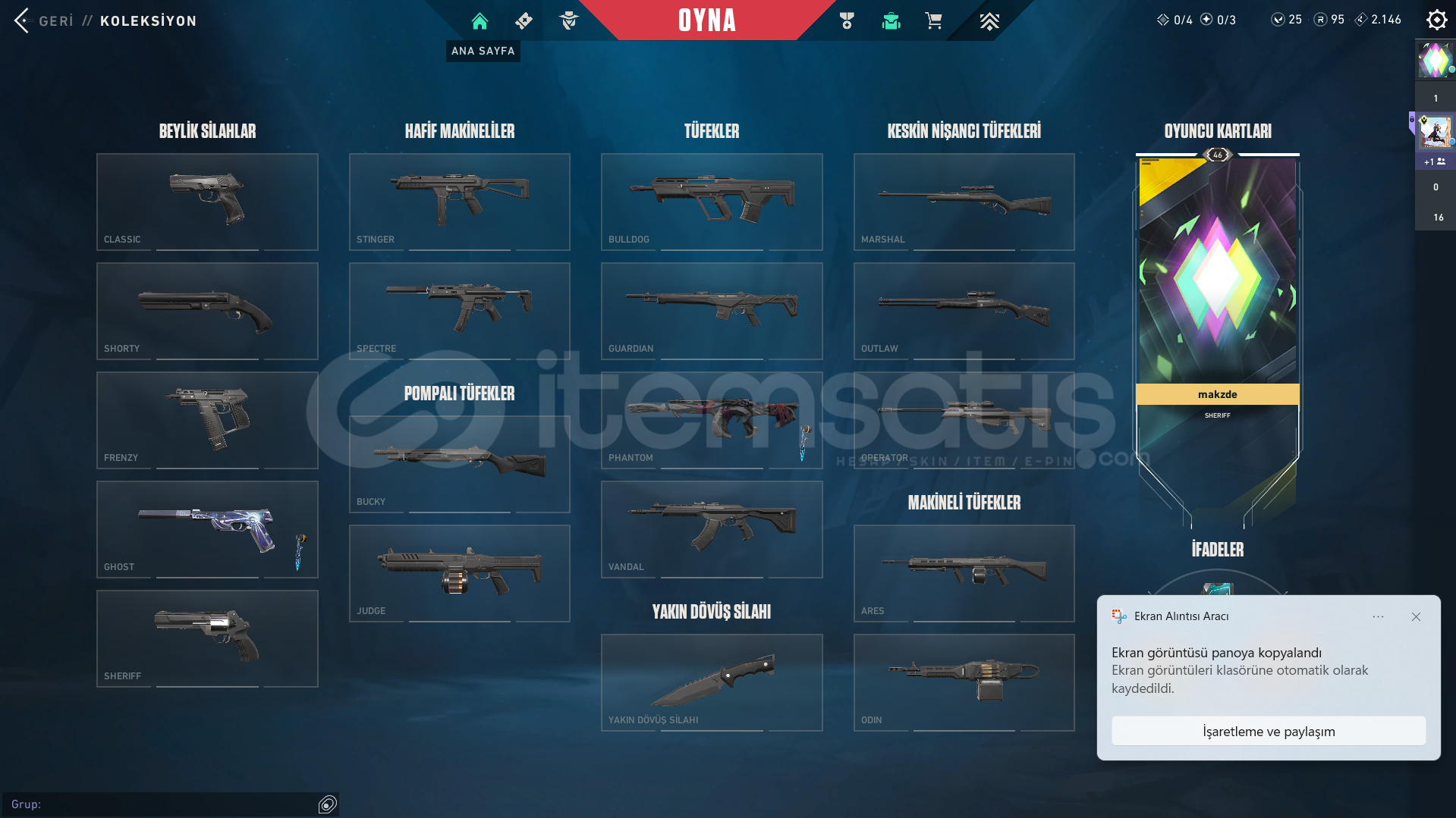 VALORANT HESABI.İÇİNDEKİLER YAZILANLARLA BİRE BİR AYNIDIR.KAYITLI ÜLKE: TRSUNUCU: TRRANK: GÜMÜŞ 1SKİNLER: ZİFİRİ PHANTOM