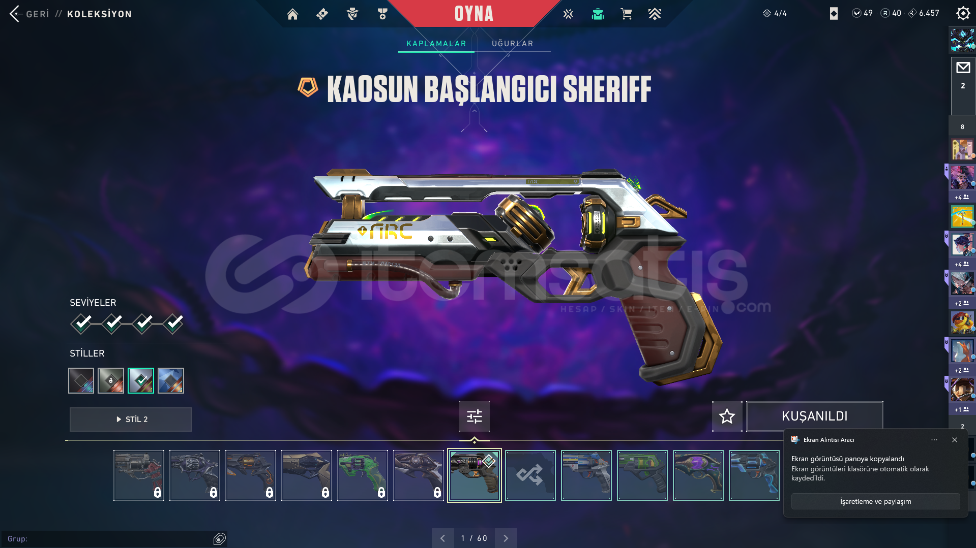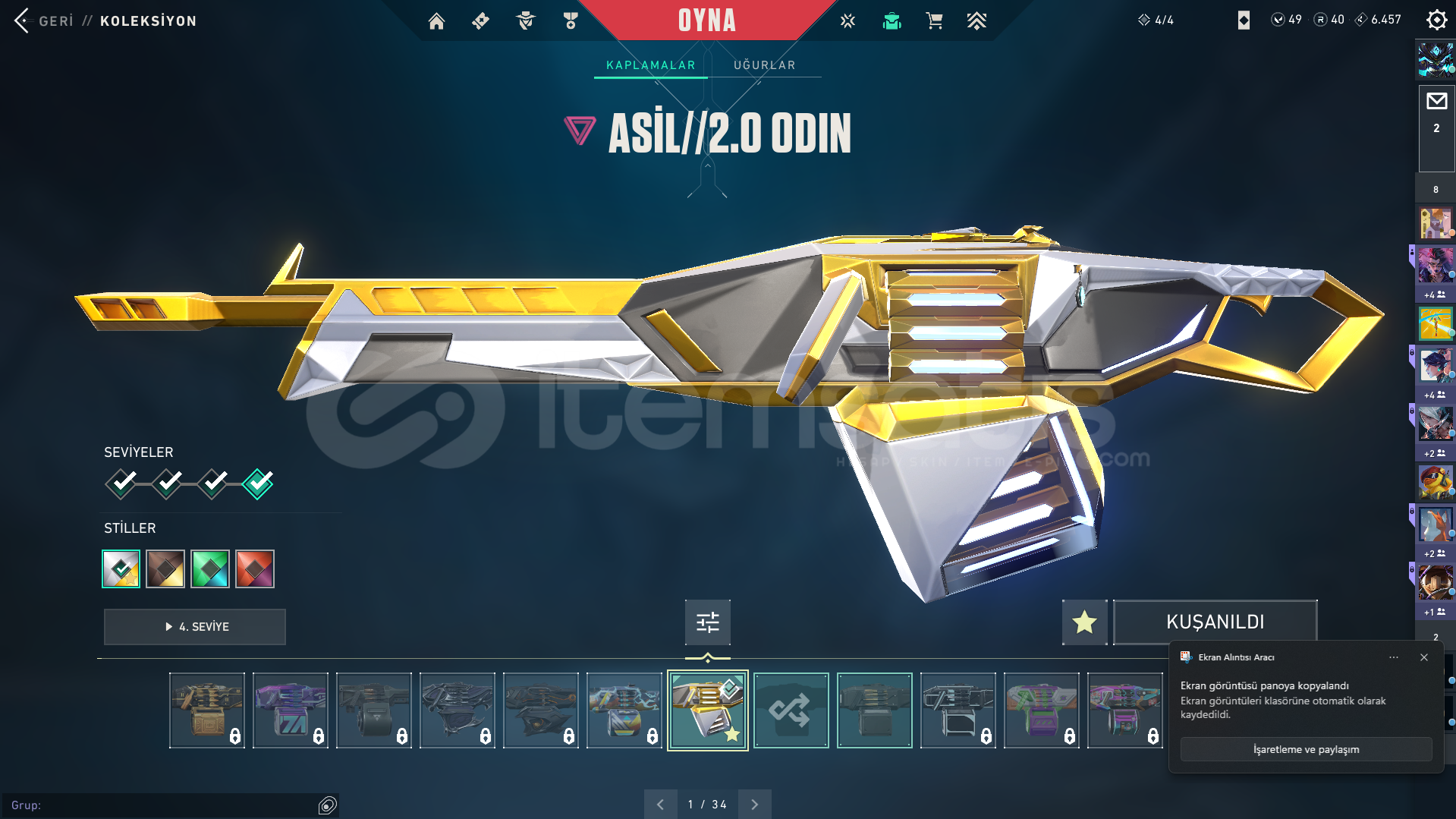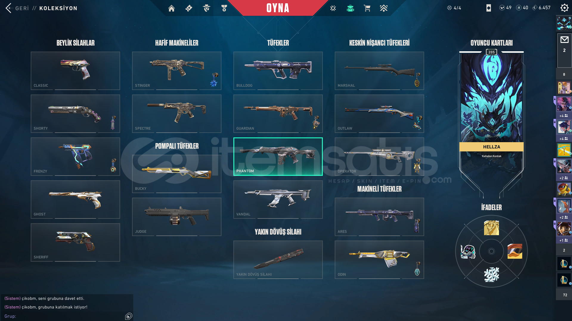 ✅ Mail: Mail değişimi yapılacaktır. ✅ Sunucu: Türkiye ✅ Level: 205 ✅ Rank: Gold 1 ✅ Toplam Skin: 39 ✅ Knife / Bıçak Sayısı: 2 ✅ Valorant Points (Envanter Değeri): ~20.925 VP ✅ Radiant Points (RP): 40 RP🎯 Öne Çıkan Skinler / KoleksiyonlarKuronami VandalRecon BalisongSentinels of Light VandalIon VandalPrimordium PhantomPrelude to Chaos SheriffPrime//2.0 Odin & BuckyMag...