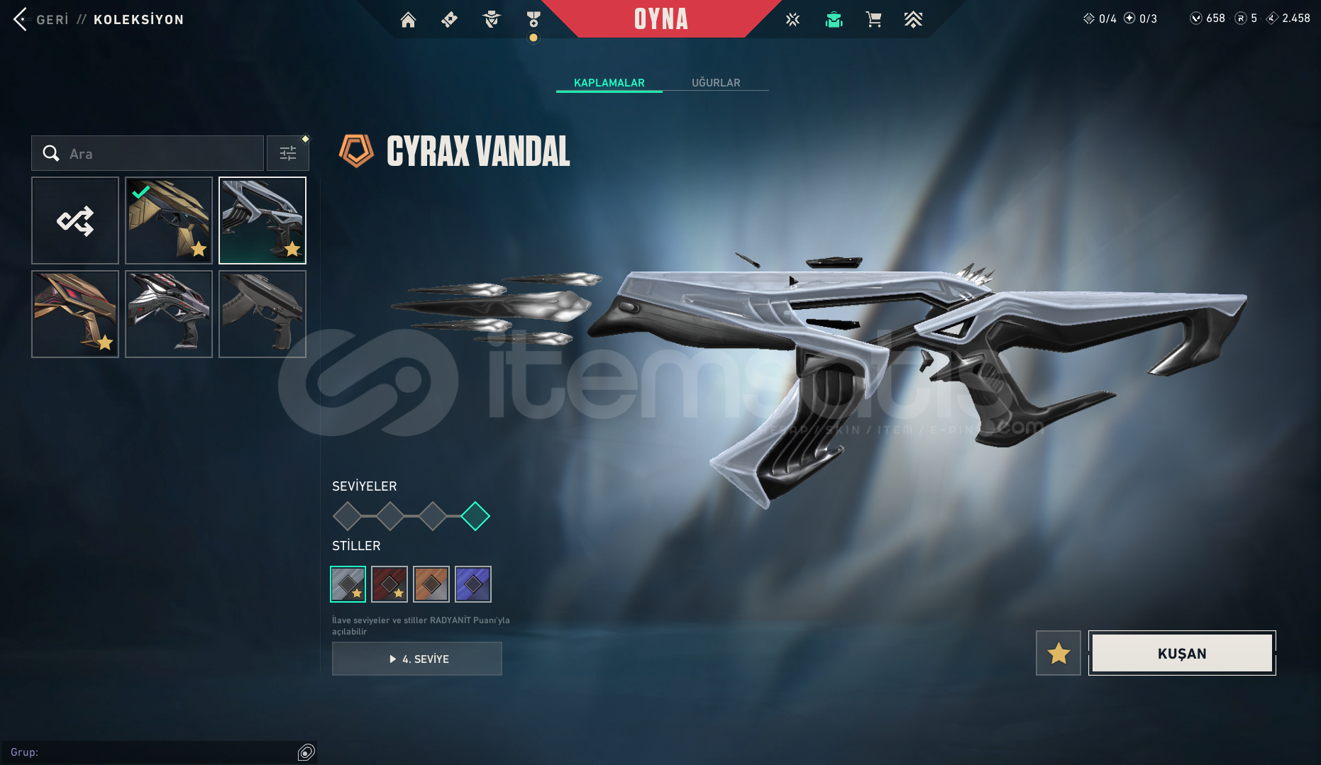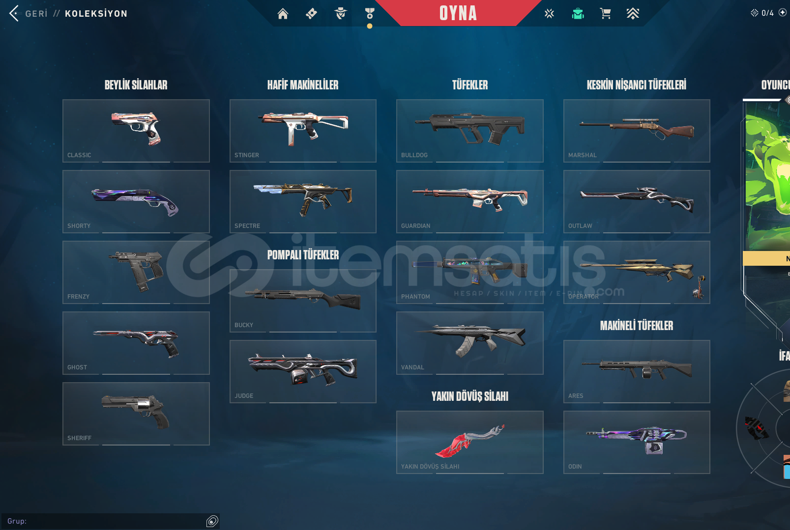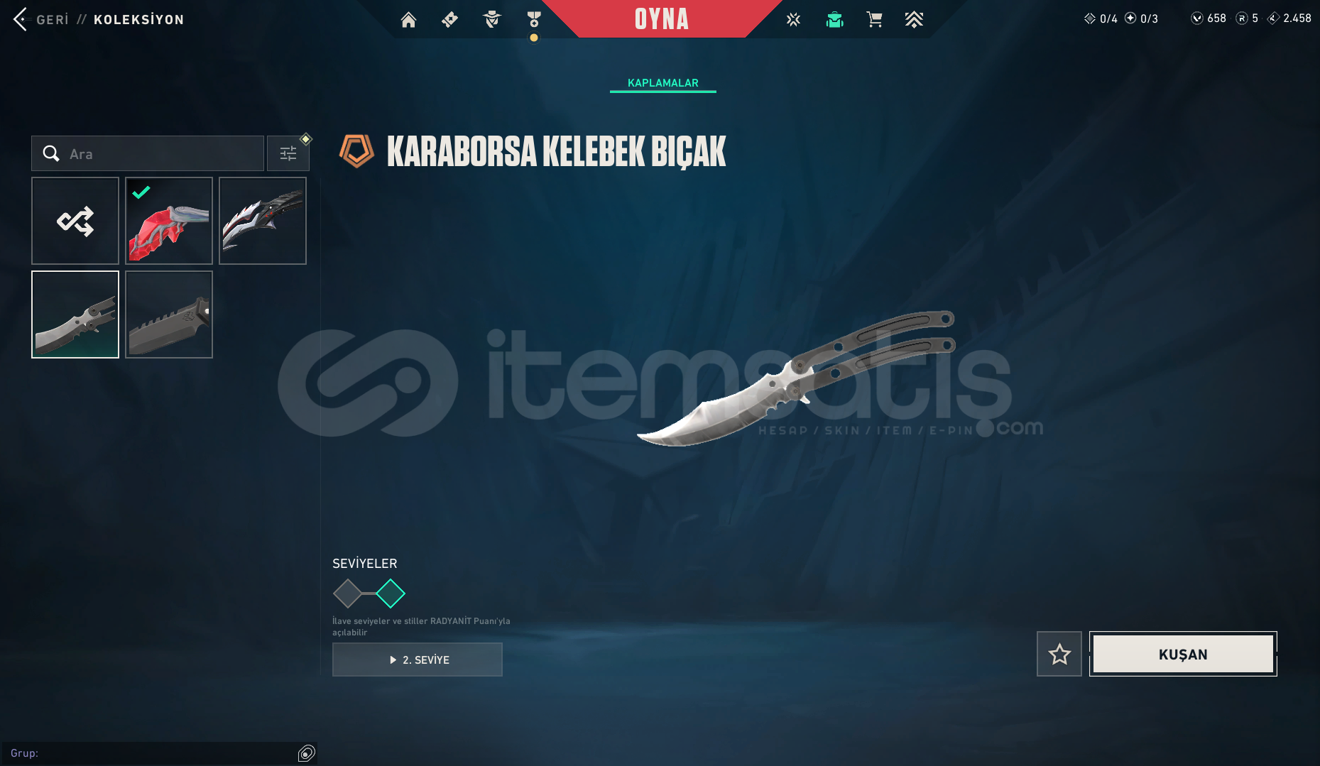 Hesabın içinde Karaborsa Kelebek ,Ulupençe Vandal ,Cyrax Vandal, battle pass Yıldız Belası Vandal,Neptün Phantom Gainin Gazabı Bıçak Işık Muhafızları Spectre Yıldız Belası Operatör Seri Tetik Marshal vardır.