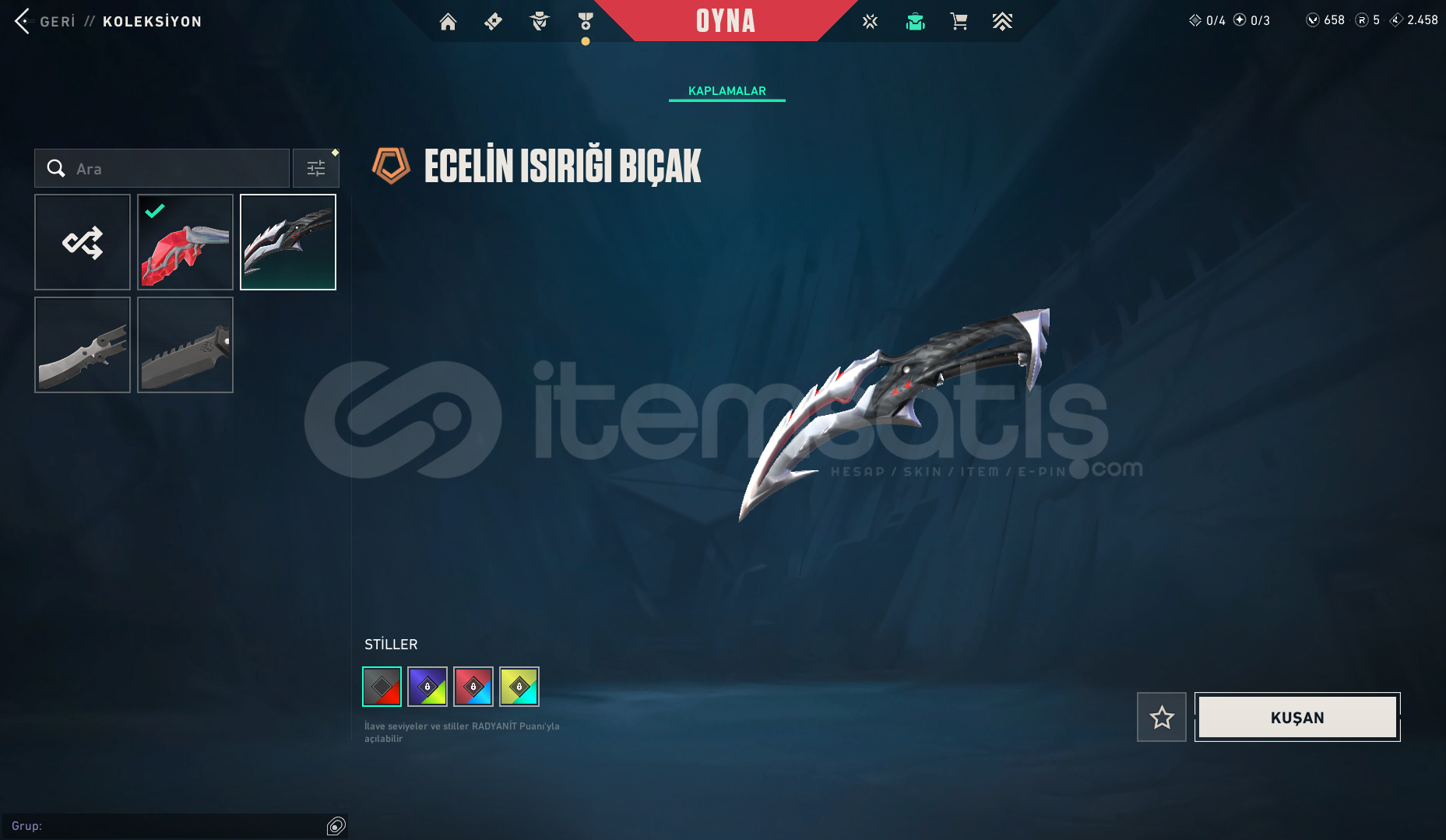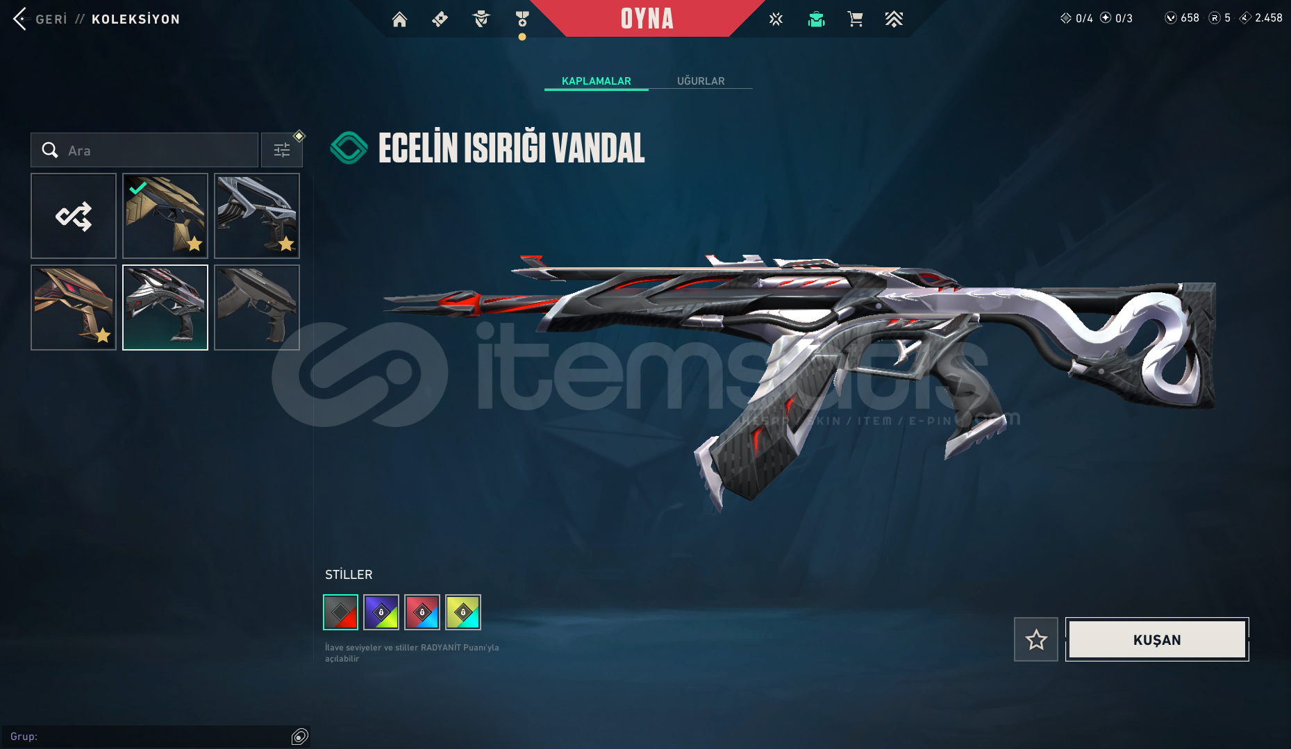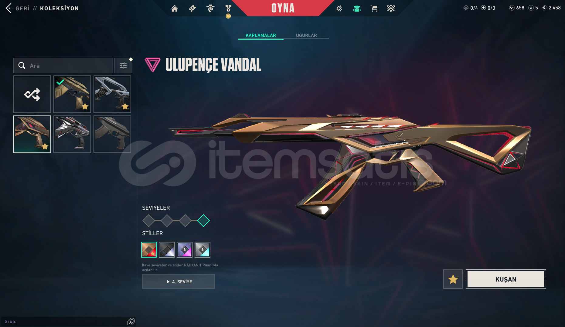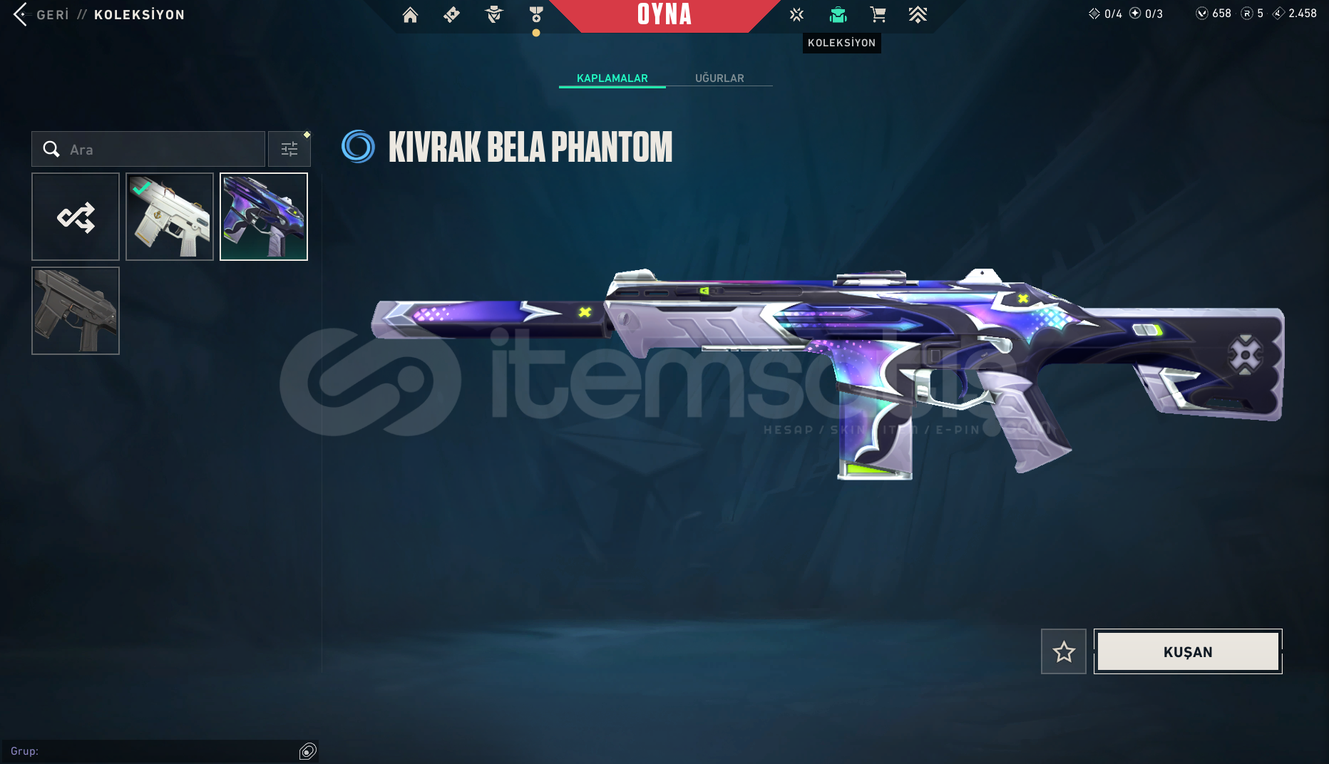 Hesabın içinde Karaborsa Kelebek ,Ulupençe Vandal ,Cyrax Vandal, battle pass Yıldız Belası Vandal,Neptün Phantom Gainin Gazabı Bıçak Işık Muhafızları Spectre Yıldız Belası Operatör Seri Tetik Marshal vardır.