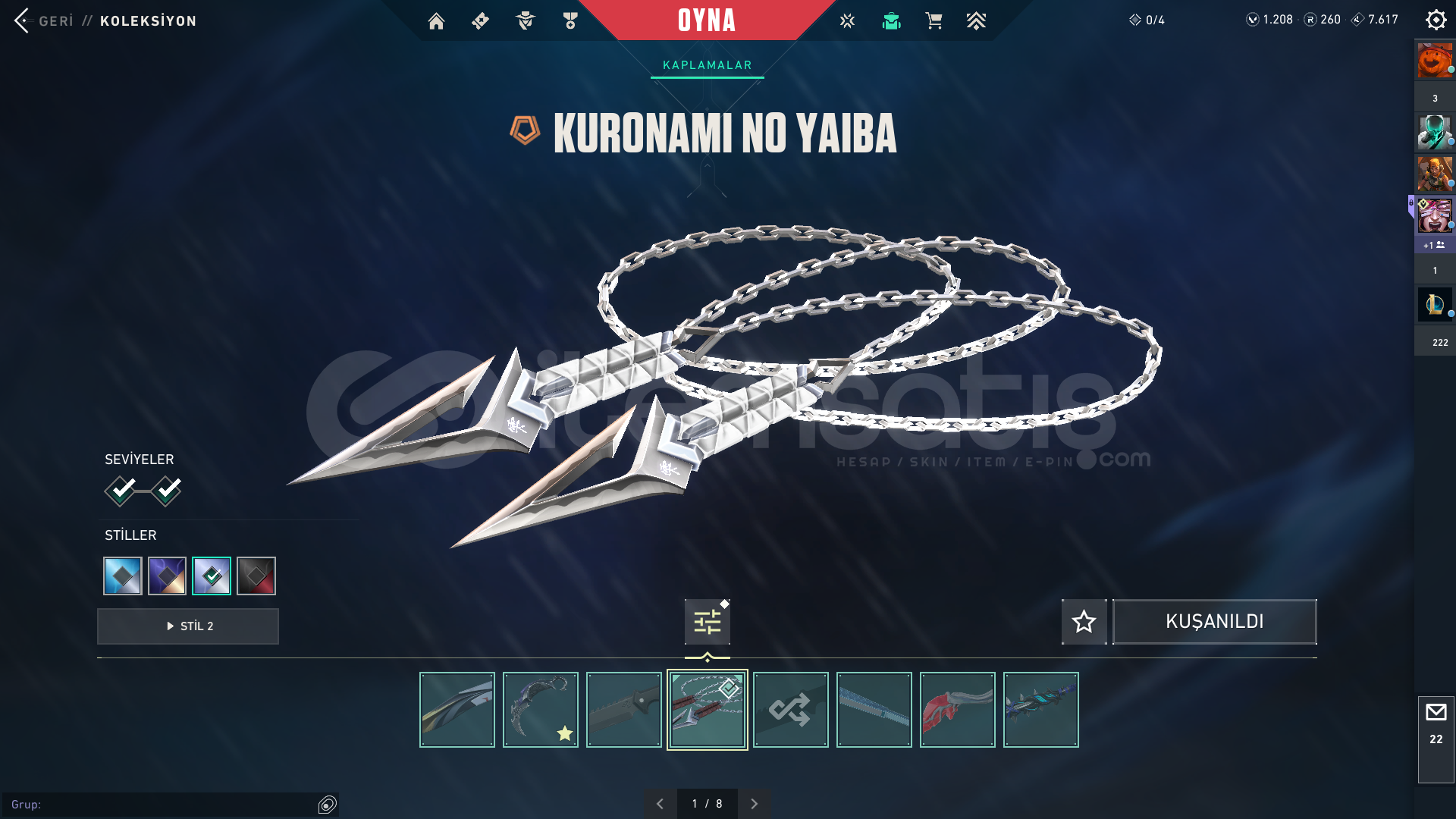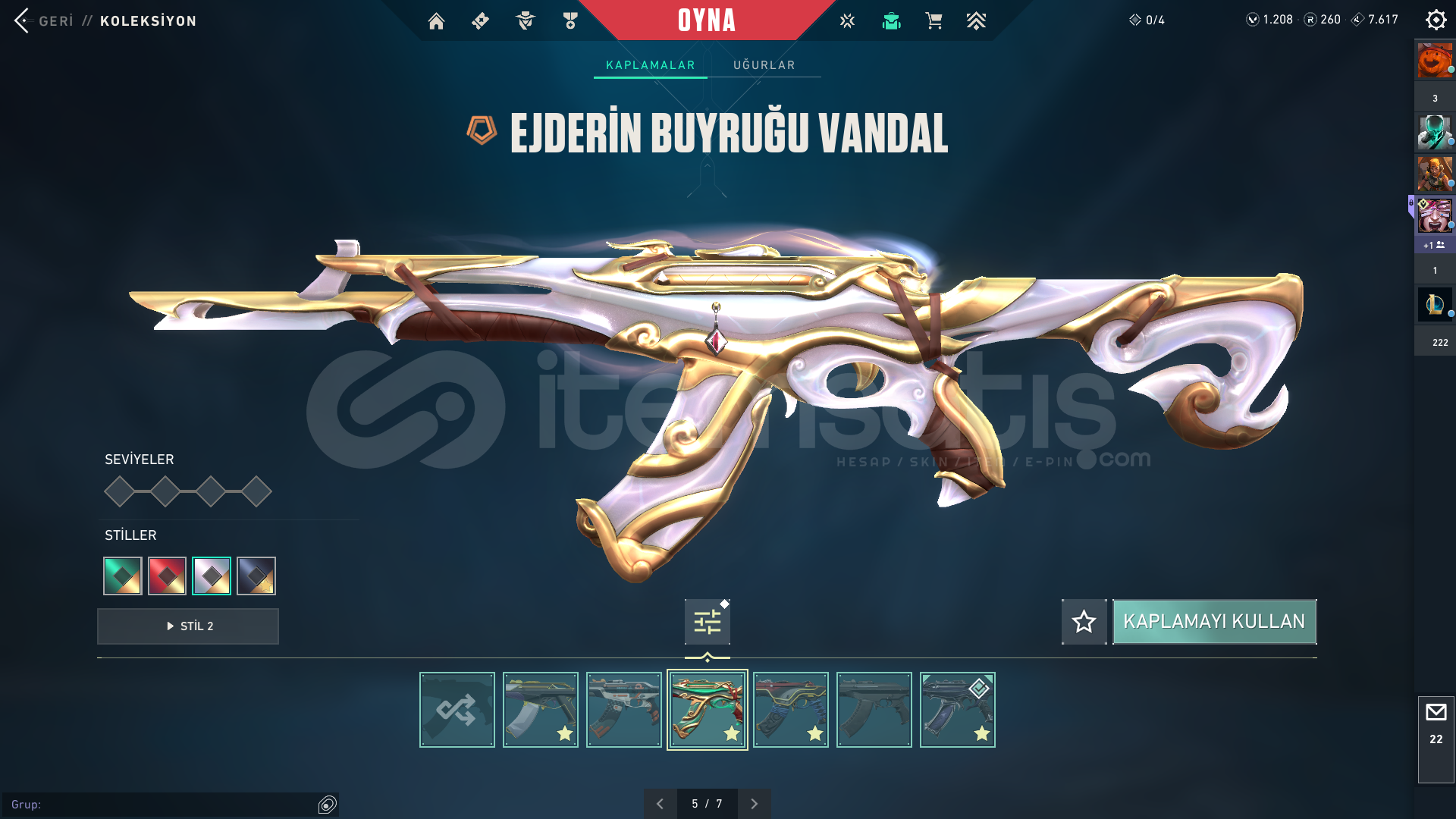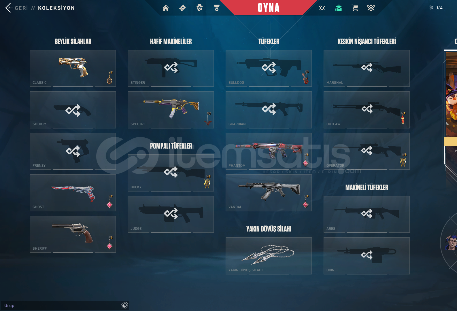 Yağmacı VandalAsil VandalEjderin buyruğu VandalOni VandalProtokol PhantomAsil SpectreGaia GhostSeri Tetik SheriffYitik ClassicYağmacı KarambitDenge YelpazeGaia 2.0 BıçakKuronami Bıçak*1200VP vardır.2 BattlePassBütün karakterler açık.Güncel Rank; Yücelik3Peak İmmortal2 125rr.Nakit ihtiyacımdan ve oyunu bıraktığım için satıyorum alıcısına hayırlı ...
