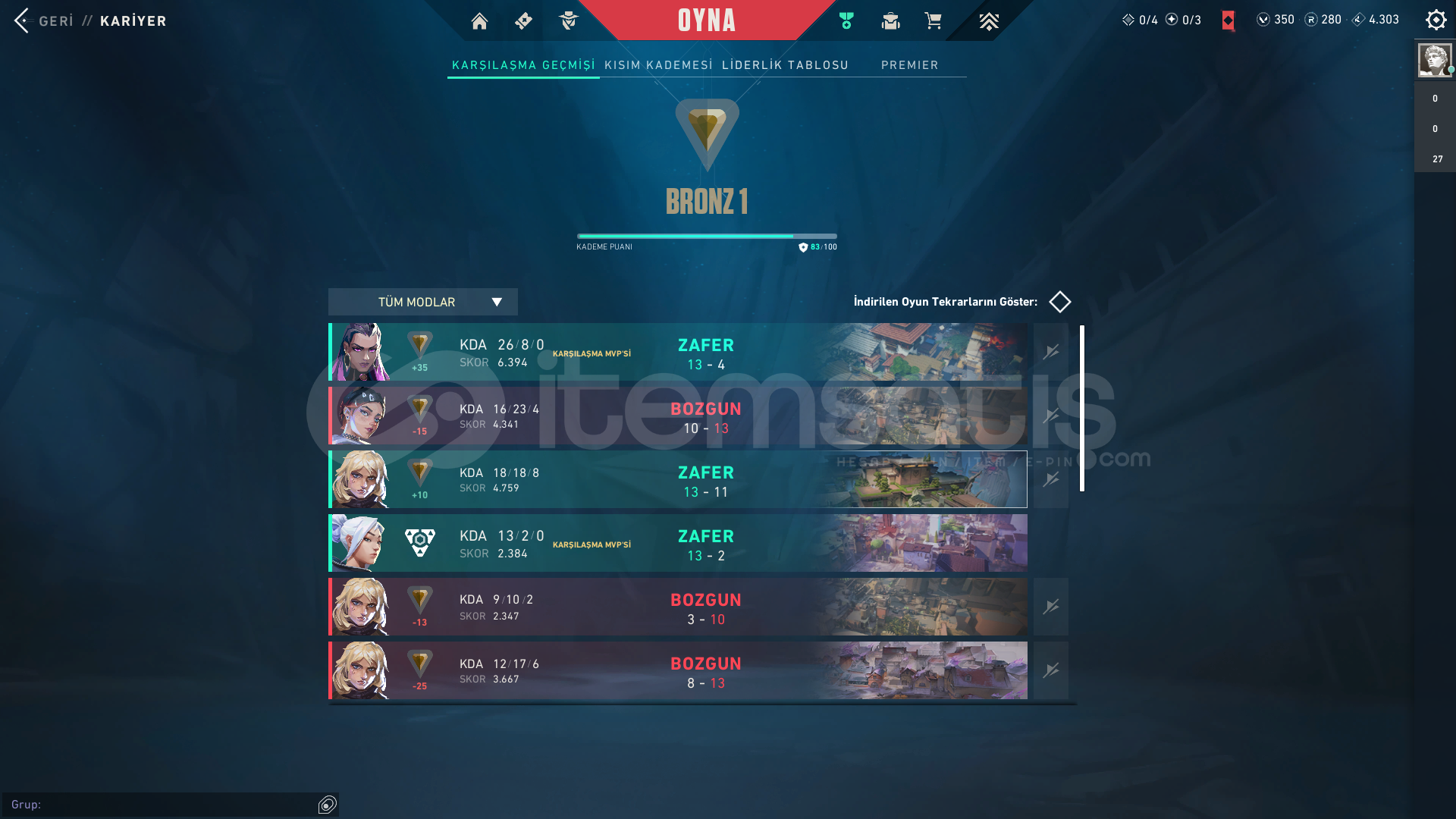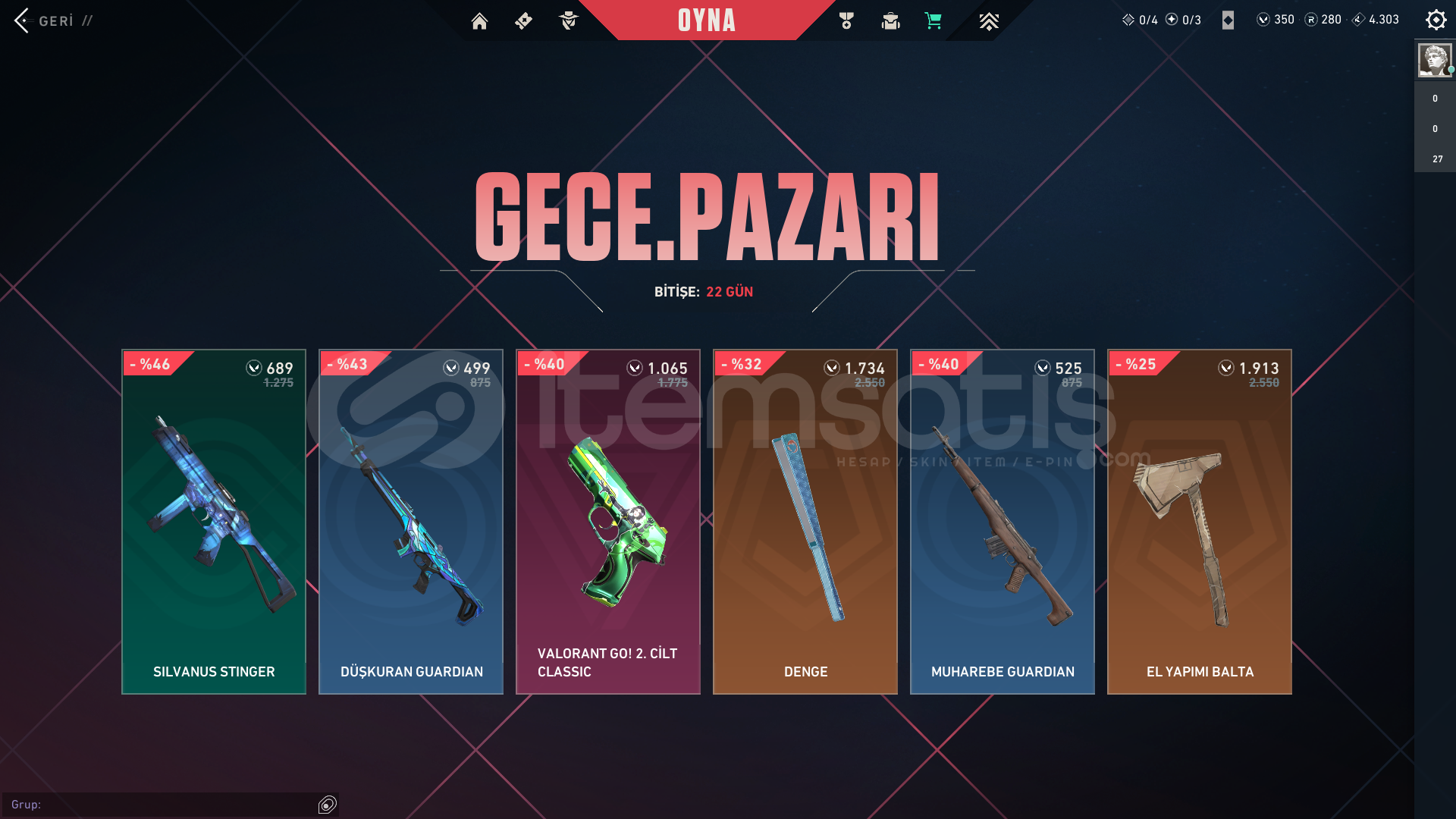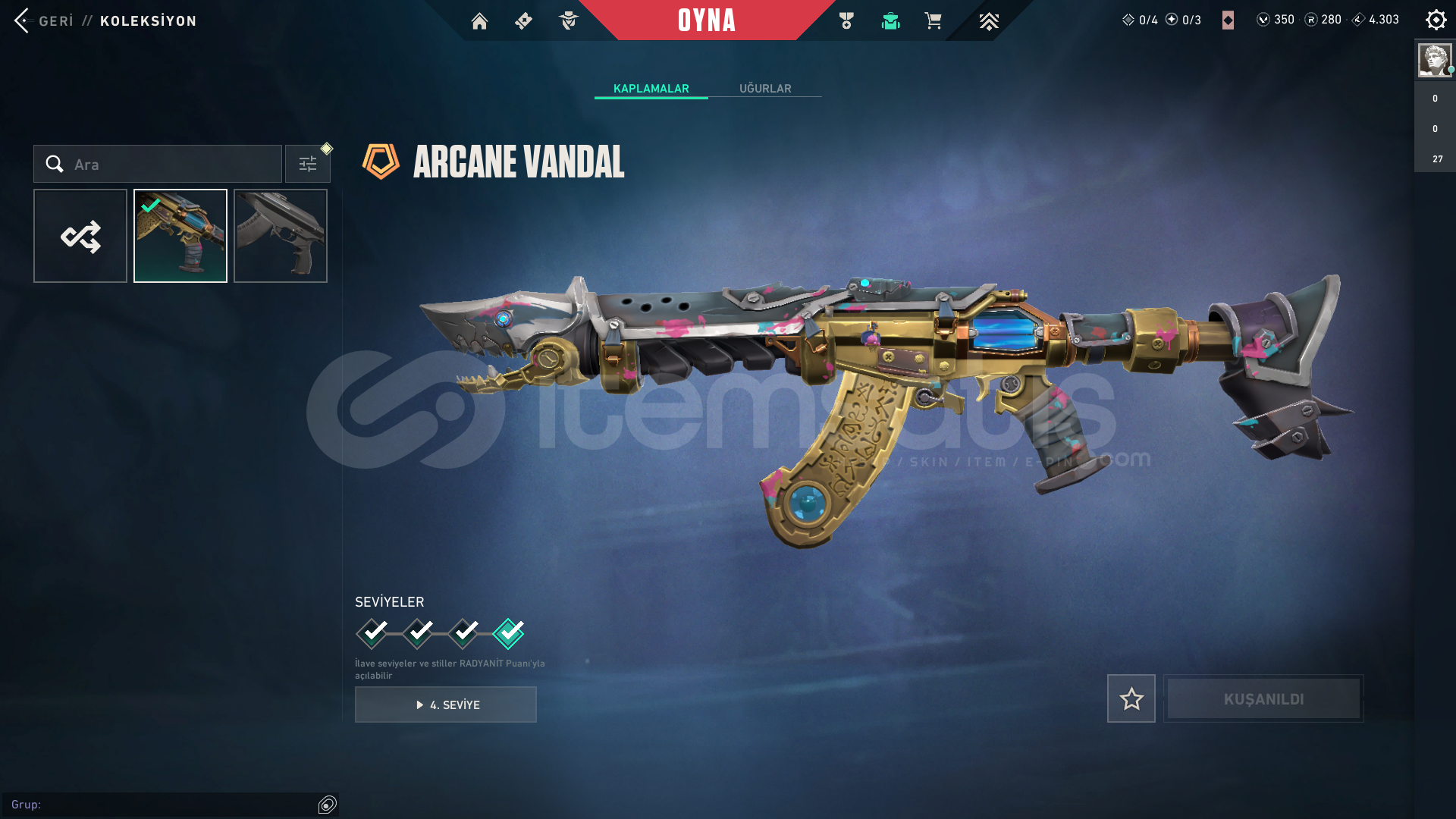 Bölge: TRSeviye: 60Kademe: Bronz 1VP: 350Radyanit: 280Skinler;Arcane VandalSatın alıp tüm işlemleri bitirip hesabı üstünüze aldığınız zaman siparişi onaylayıp bize destek olmak için alışveriş sırasındaki memnuniyetiniz hakkında değerlendirmede bulunup yorum gönderirseniz sevinirim.
