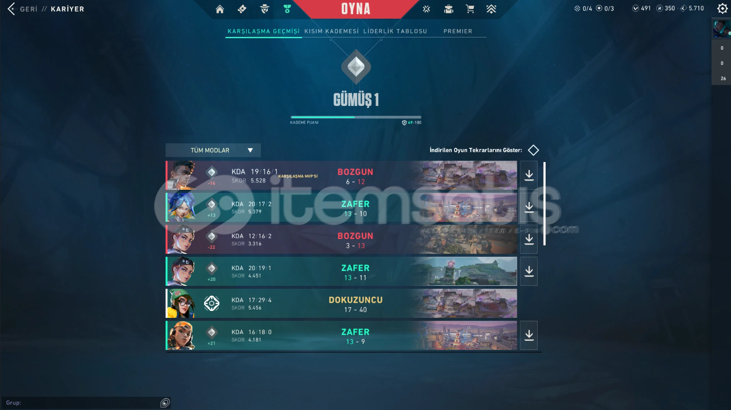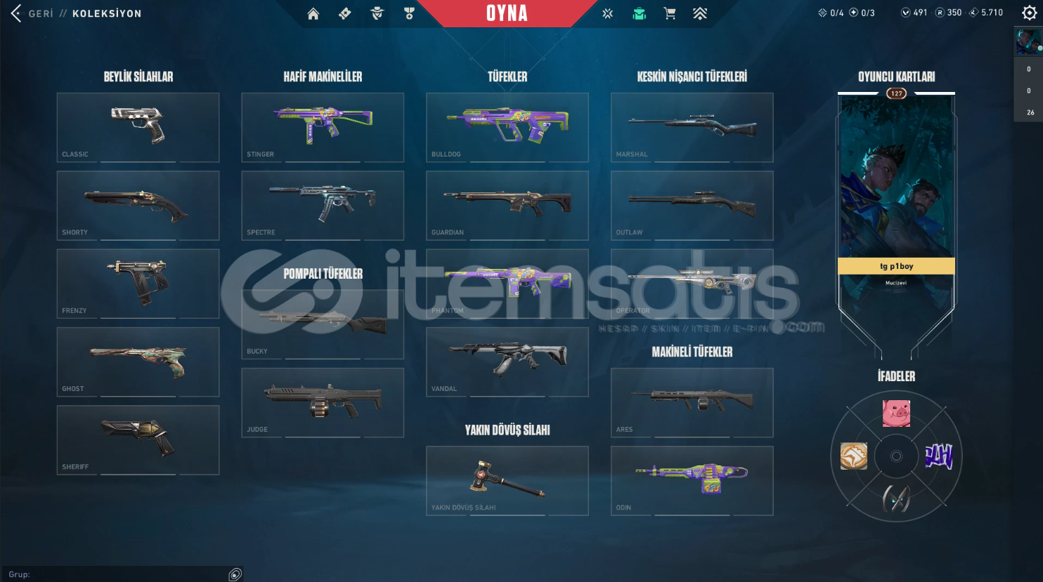 Bölge: TRSeviye: 127Kademe: Gümüş 1VP: 491Radyanit: 350Skinler;Himaye ÇekiçYağmacı VandalKöken OperatorFatih Ghostve 16 Adet Battle Pass Skin