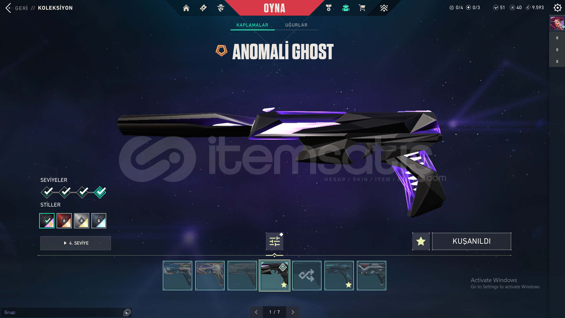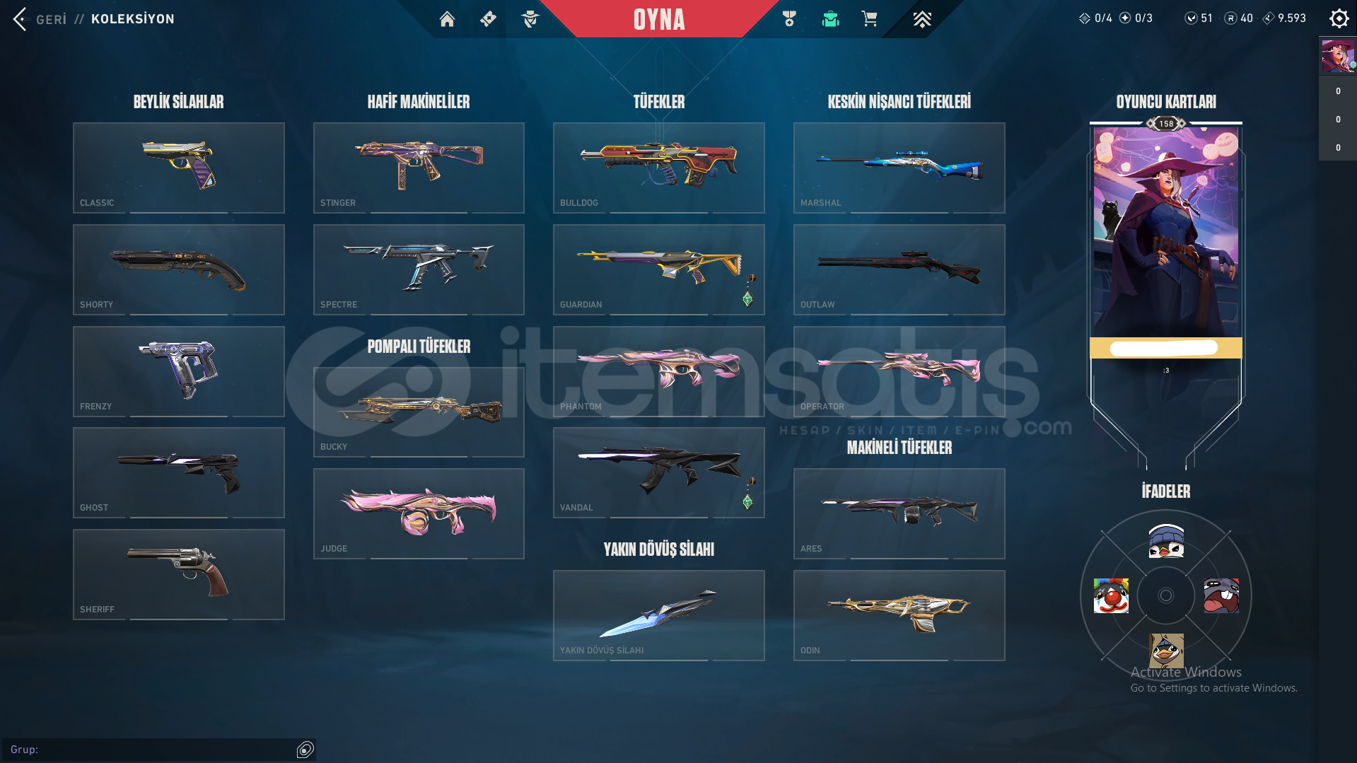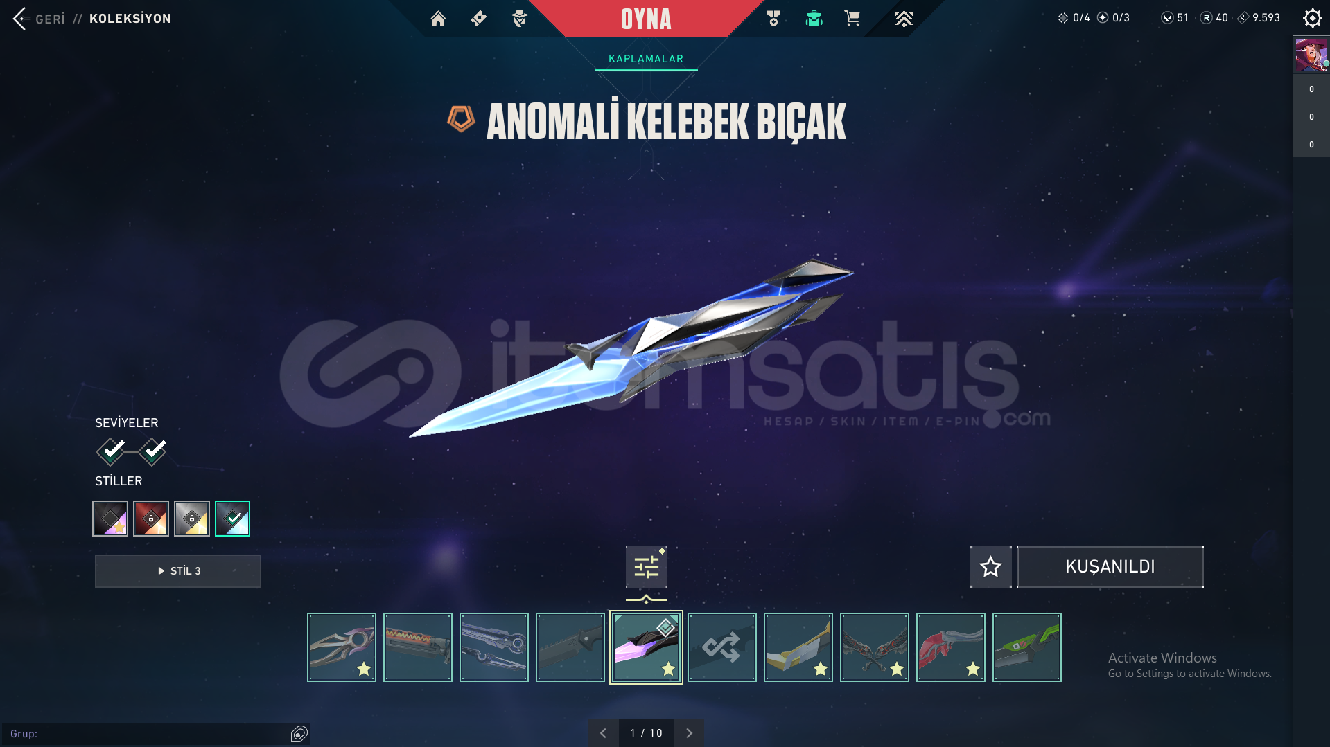 hesapta anomali vandal, ulupençe vandal, anomali kelebek, asil karambit, felaketin bıçakları, gaianın gazabı, sırçiçeği kunai, sırçiçeği phantom, anomali phantom, asil classic, kaos shorty, anomali ghost, afet ghost, seri tetik sheriff, anomali sheriff, sırçiçeği sheriff, kuronami spectre, anomali spectre, yağmacı spectre, aemondır bucky, sırçiçeği judge, oni bulldog, asil guardian, yıldız belası outlaw, sırçiçeği operator, anomali ares ve fatih odin bulunmaktadır