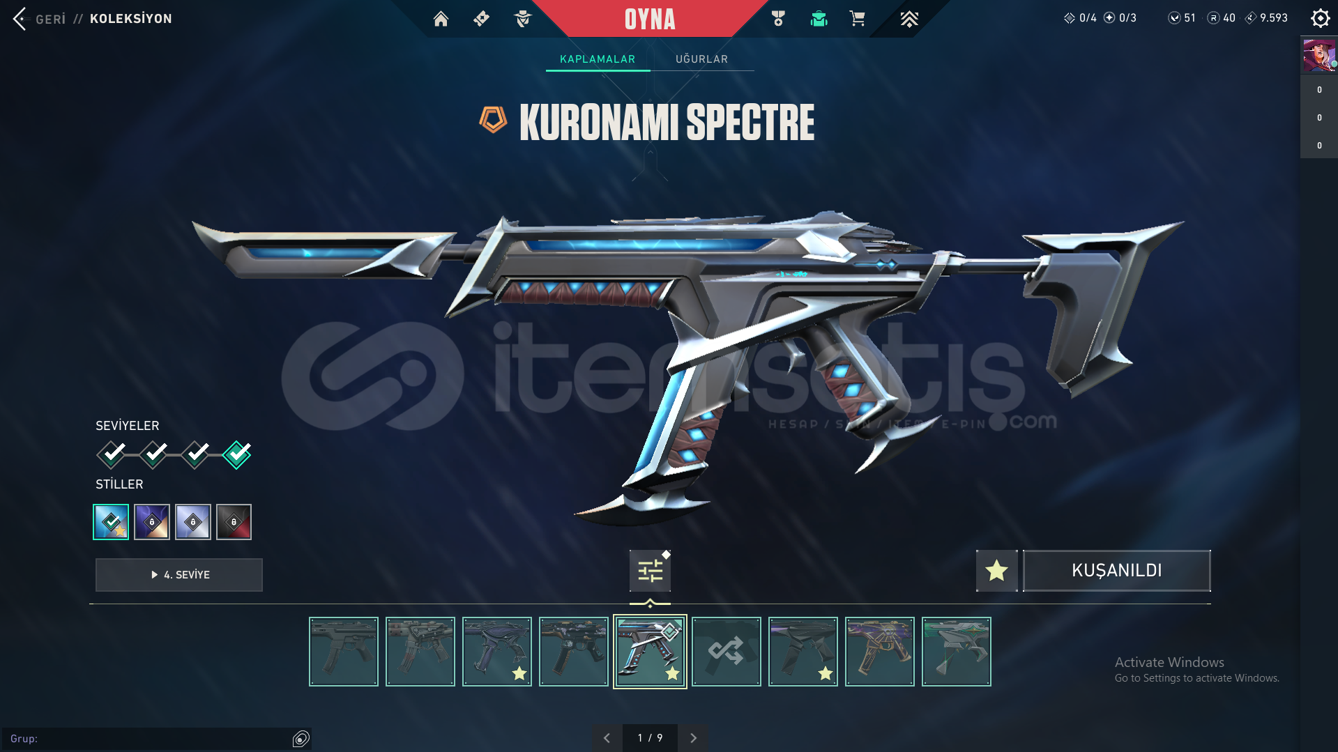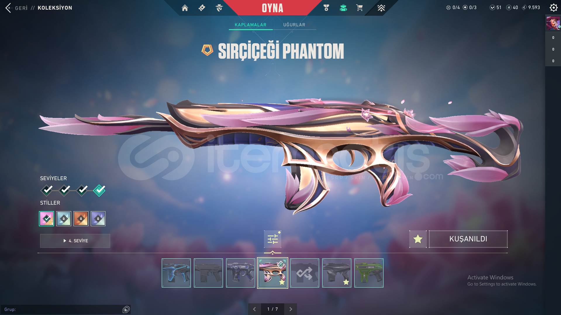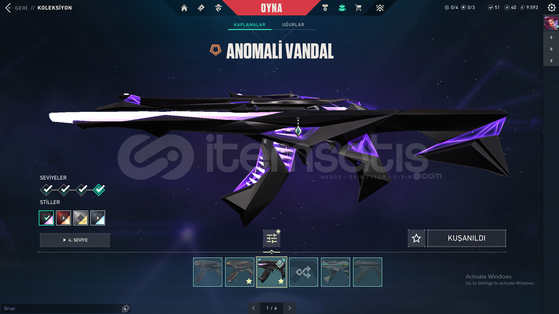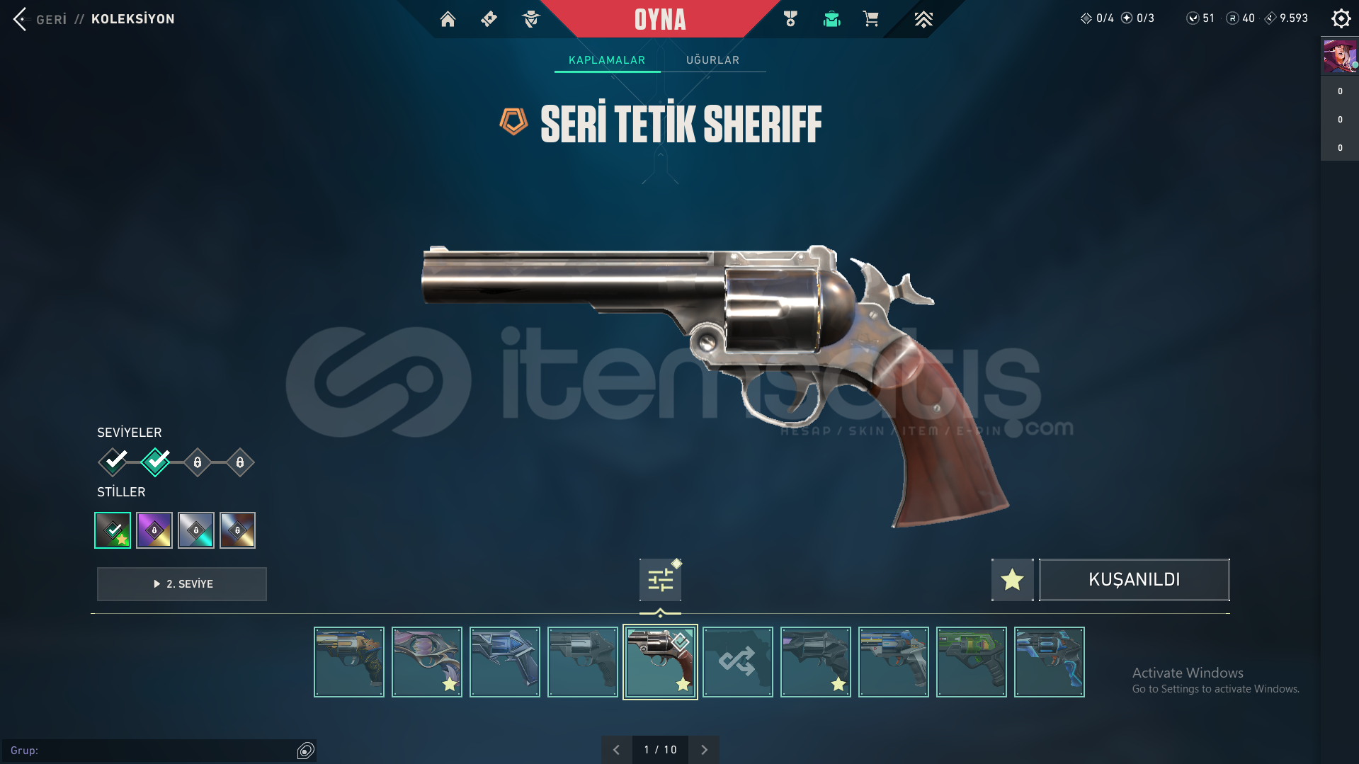 hesapta anomali vandal, ulupençe vandal, anomali kelebek, asil karambit, felaketin bıçakları, gaianın gazabı, sırçiçeği kunai, sırçiçeği phantom, anomali phantom, asil classic, kaos shorty, anomali ghost, afet ghost, seri tetik sheriff, anomali sheriff, sırçiçeği sheriff, kuronami spectre, anomali spectre, yağmacı spectre, aemondır bucky, sırçiçeği judge, oni bulldog, asil guardian, yıldız belası outlaw, sırçiçeği operator, anomali ares ve fatih odin bulunmaktadır