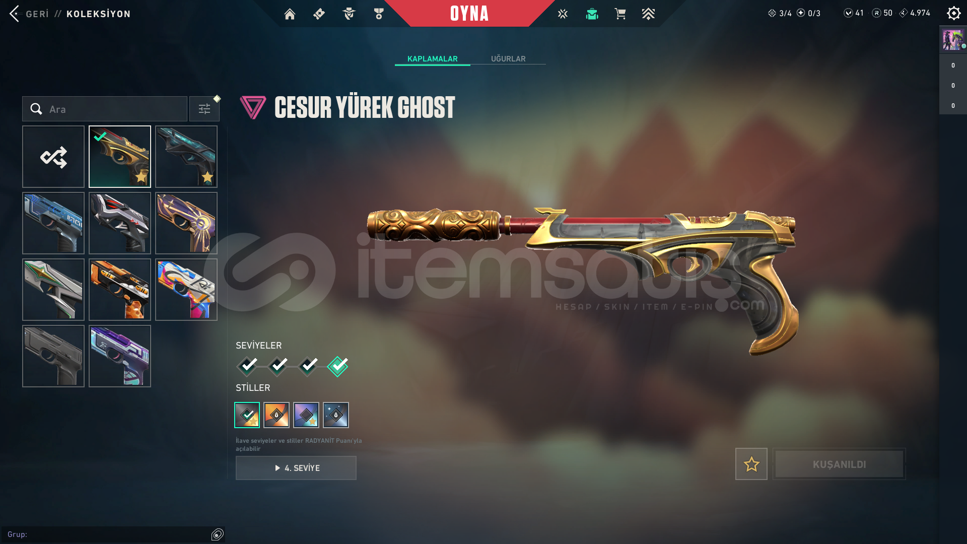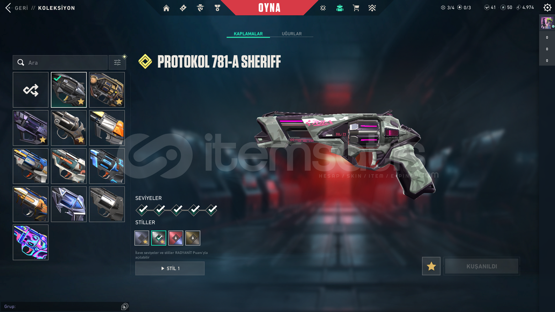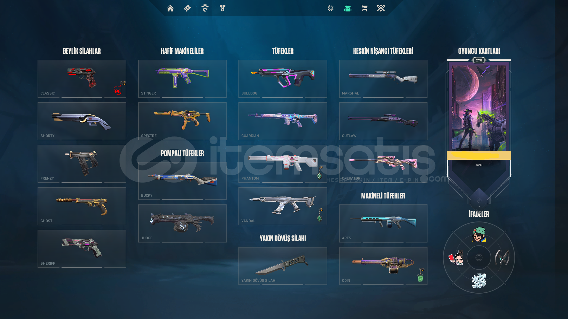 Oto teslimat nedir?Ben aktif olmasam bile satın alıp direkt bilgilere erişip tüm bilgileri üstünüze anlık olarak alabilirsiniz.Bölge: TRSeviye: 278Kademe: Platin 3VP: 41Radyanit: 50Skinler;Ejder JudgeRadiant Entertainment System PhantomProtocol SheriffEX.O SpectreVCT x JDG ClassicSeri Tetik SheriffEX.O SheriffSeri Tetik OdinSeri Tetik PhantomEX.O VandalEjderin Buyruğu VandalUlupençe KnifeAsil//2.0 KarambitSeri Tetik MarshalArcane VandalChampions 2023 VandalSihirpunk KelebekEX.O Bıçakİyon Karam...