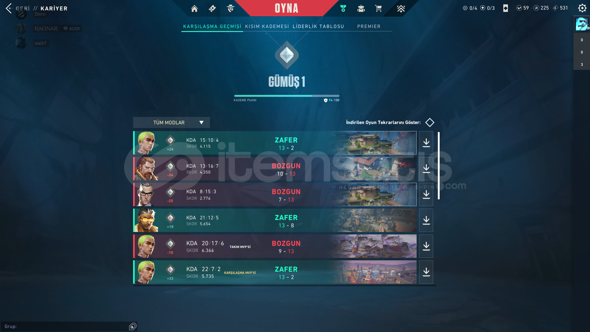 Ürün Hakkında Bilgi;İLANI SATIN ALDIĞINIZDA 7/24 OTOMATİK OLARAK TESLİM EDİLİR.RANK - GÜMÜŞ 1HESAP SEVİYESİ - 45SKİN SAYISI - 2VP SAYISI - 59+ 100.000 BAŞARILI İŞLEM İLE GÜVENLE ALIŞVERİŞ YAPABİLİRSİNİZ