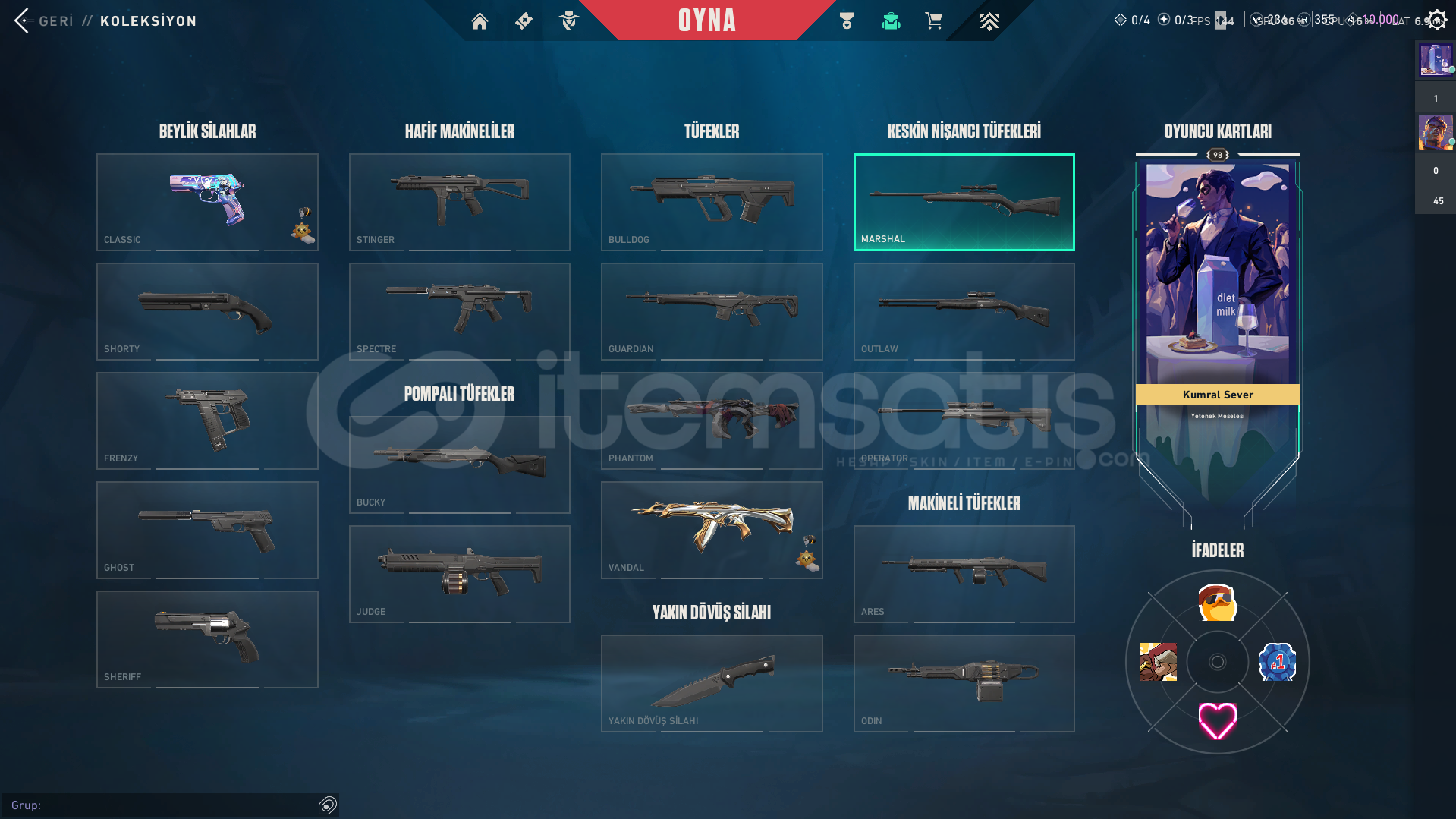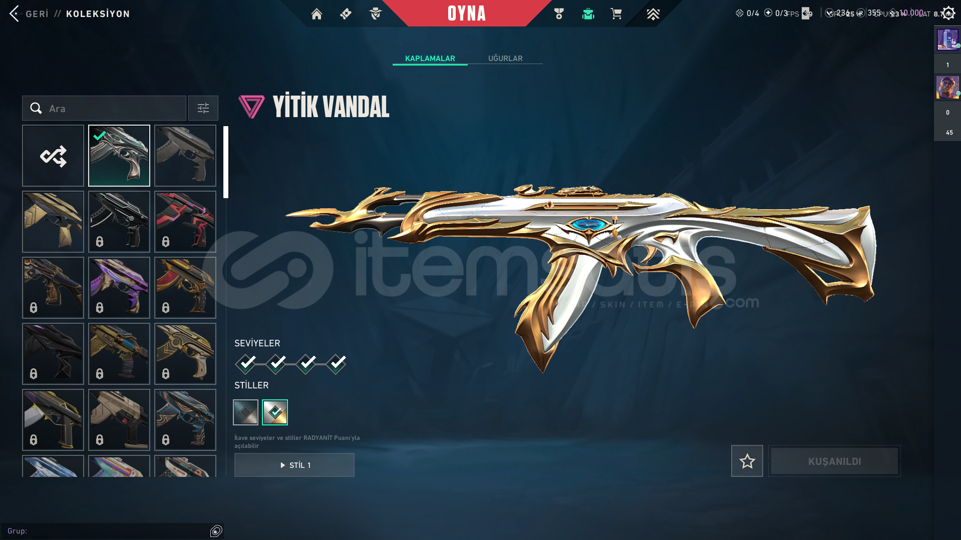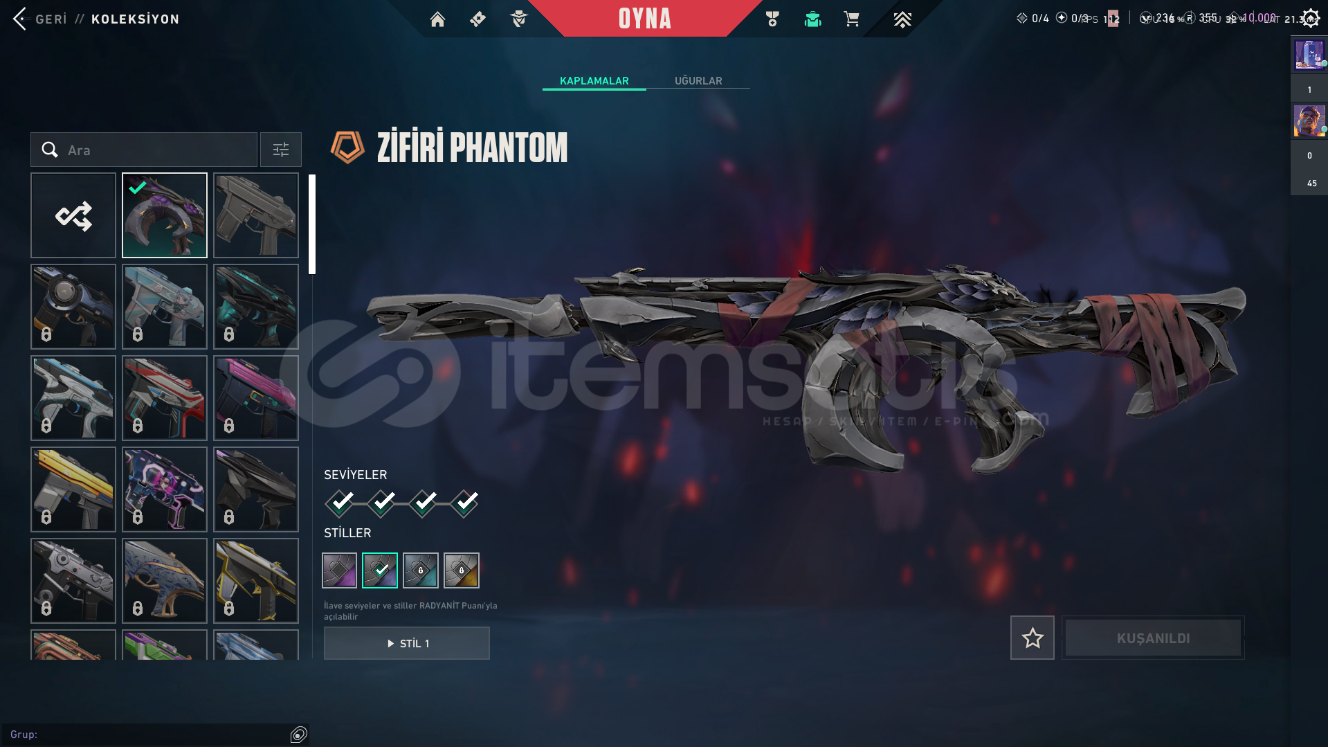 hesapta 3 tane skin var zifiri phantom yitik vandal yıldız belası vandal hesapta 1 tane karakter acık değil oda veto yeni gelen onun haricinde hepsi acık hesapta 355 radyant var 236 vp ve 10k kingdom kredisi var tertemiz max gold 2 gördü premier hiç oynanmadı sorunuz varsa yazın cevaplayabilirim parya ihtiyacım olduğu icin satıyorum fiyat pahalı geldiyse indirim yapılır
