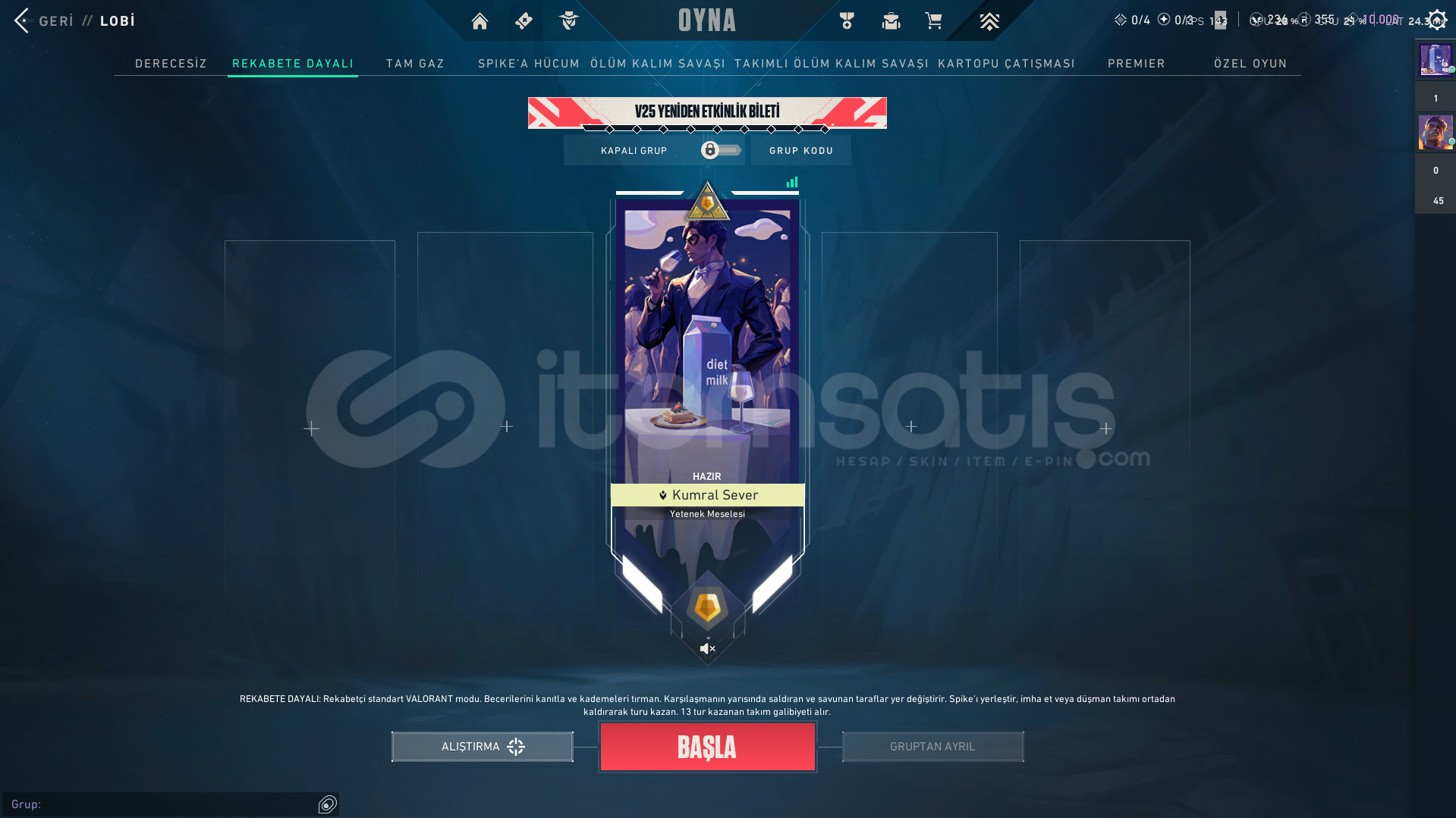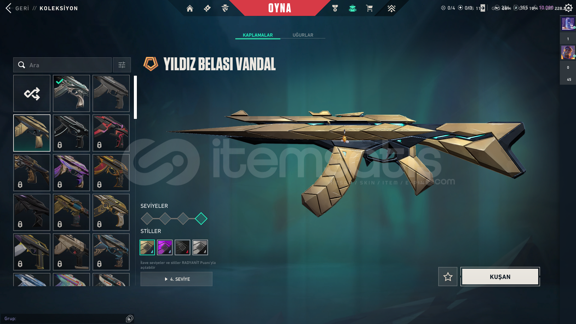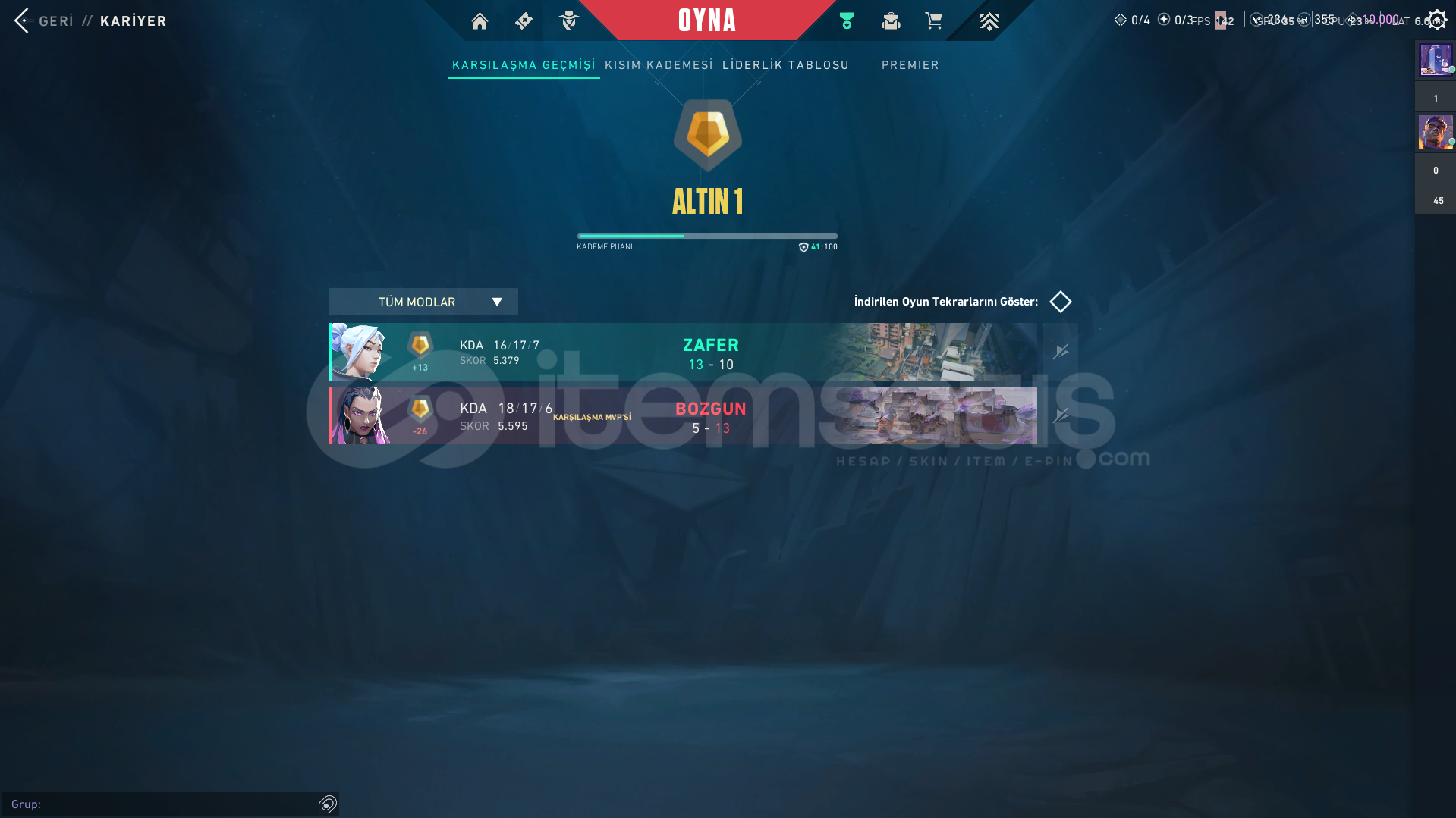 hesapta 3 tane skin var zifiri phantom yitik vandal yıldız belası vandal hesapta 1 tane karakter acık değil oda veto yeni gelen onun haricinde hepsi acık hesapta 355 radyant var 236 vp ve 10k kingdom kredisi var tertemiz max gold 2 gördü premier hiç oynanmadı sorunuz varsa yazın cevaplayabilirim parya ihtiyacım olduğu icin satıyorum fiyat pahalı geldiyse indirim yapılır