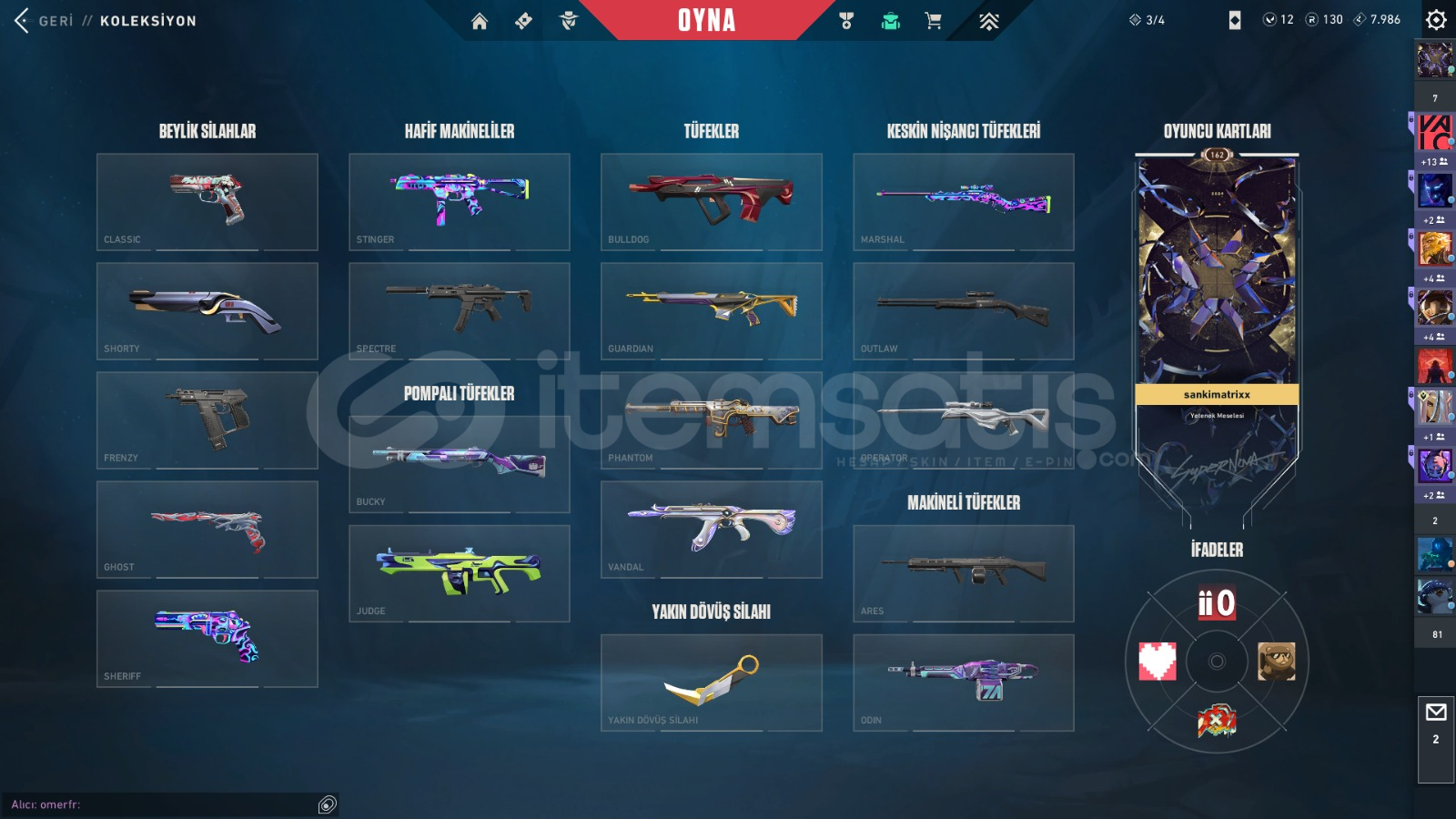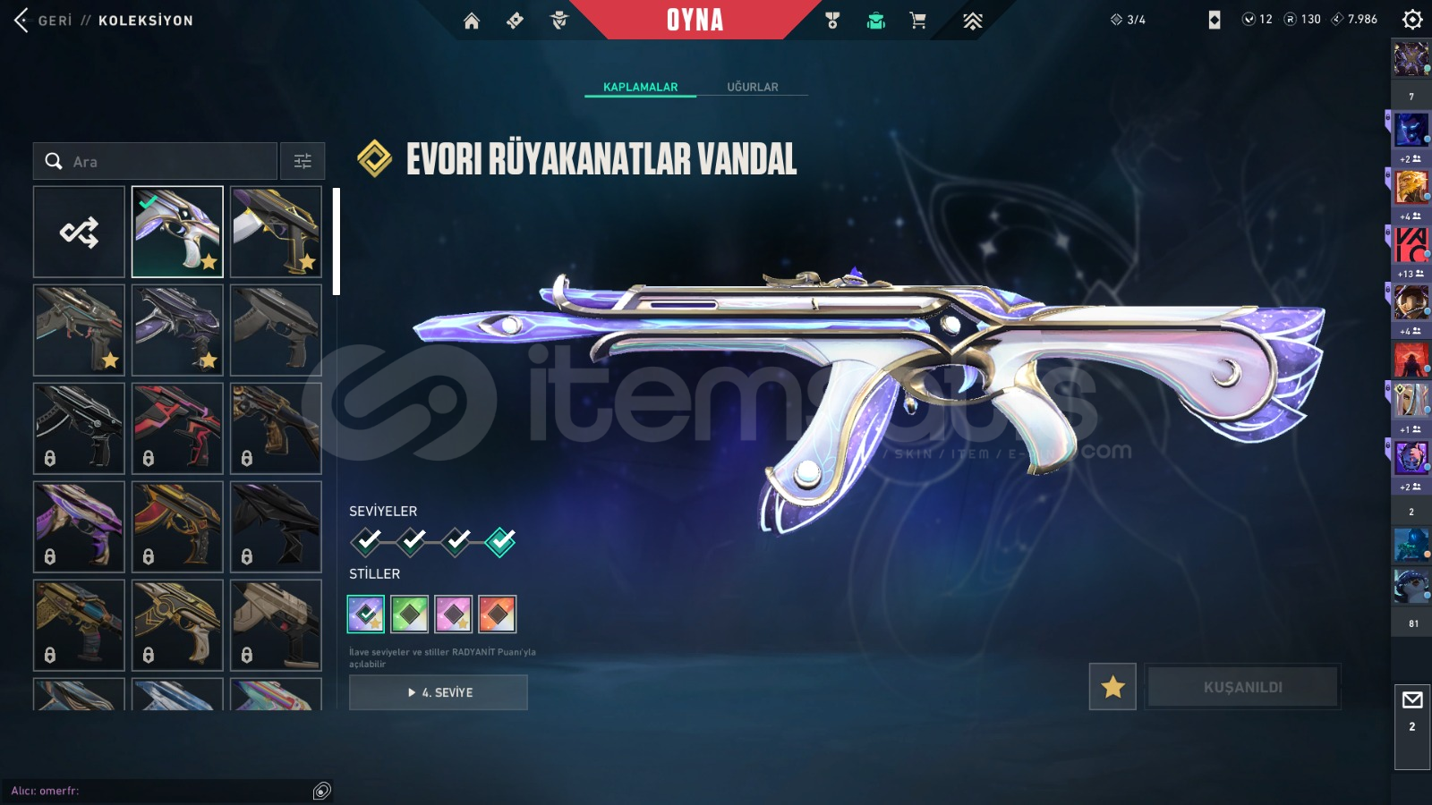 Asil karambitYağmacı vandalSoğuk çelik vandalEvori rüya kanatları vandalAsil vandalOni phantomAsil guradianİyon operatörGaia ghost1x battle pass vardırDiamond uğurlu vardır (Peek rankdır)Hesap 150 seviyedirTelefon no doğrulaması vardı kalktı.Mail değişikliği yapılacaktır.EMEK HESABIDIR