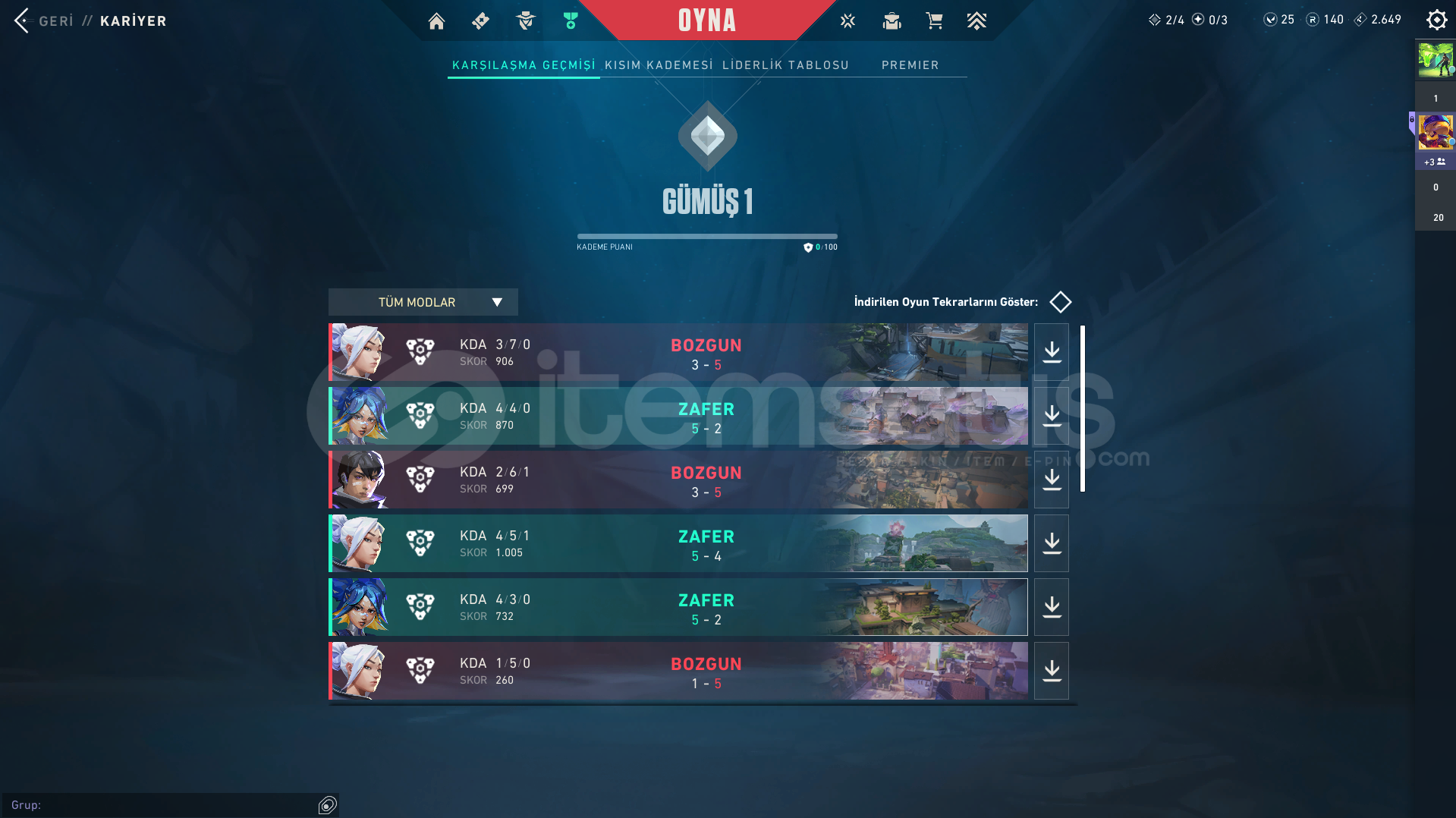 Ürün Hakkında Bilgi;İLANI SATIN ALDIĞINIZDA 7/24 OTOMATİK OLARAK TESLİM EDİLİR.RANK - GÜMÜŞ 1HESAP SEVİYESİ - 50SKİN SAYISI - 2VP SAYISI - 25+ 100.000 BAŞARILI İŞLEM İLE GÜVENLE ALIŞVERİŞ YAPABİLİRSİNİZ