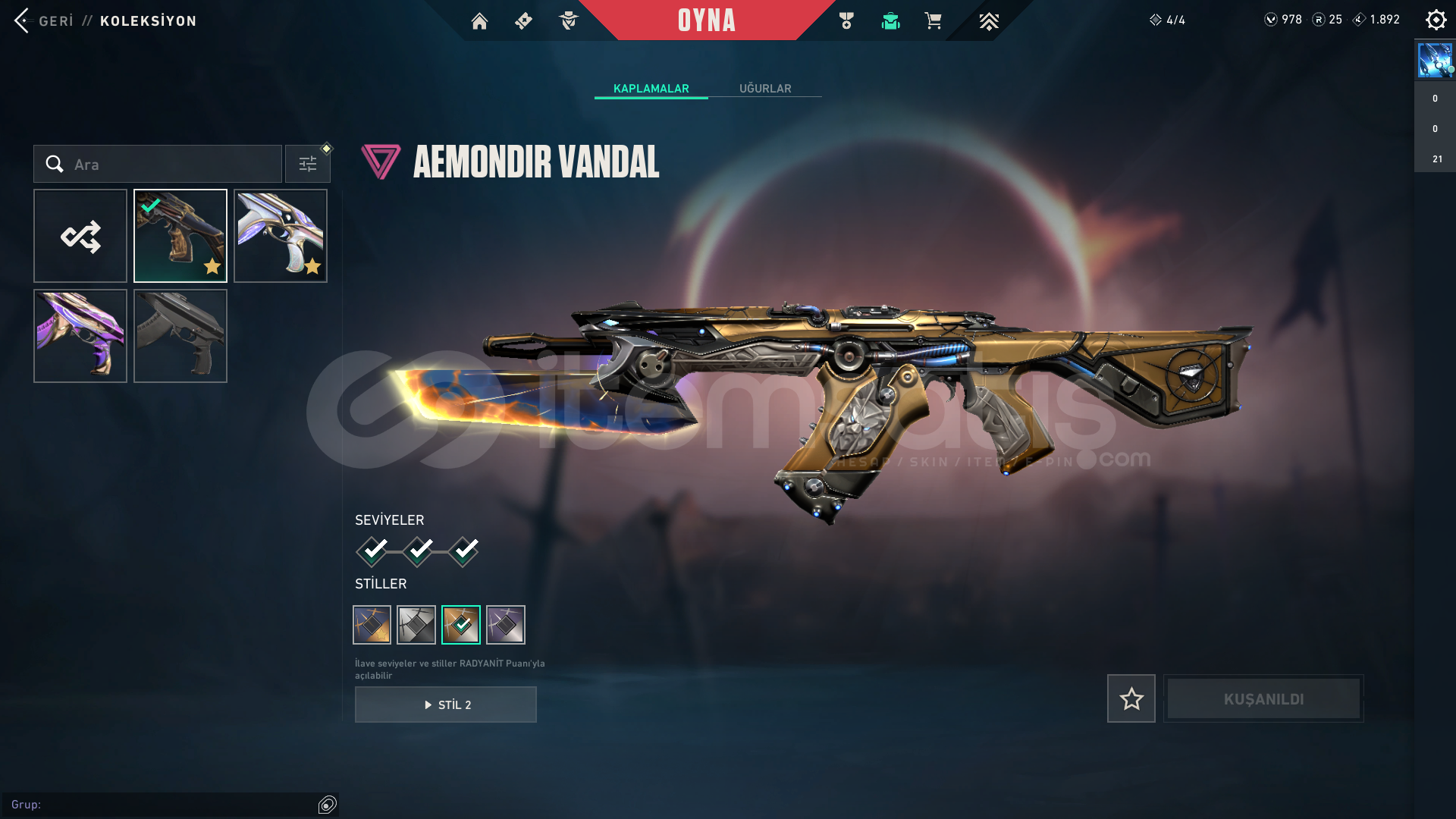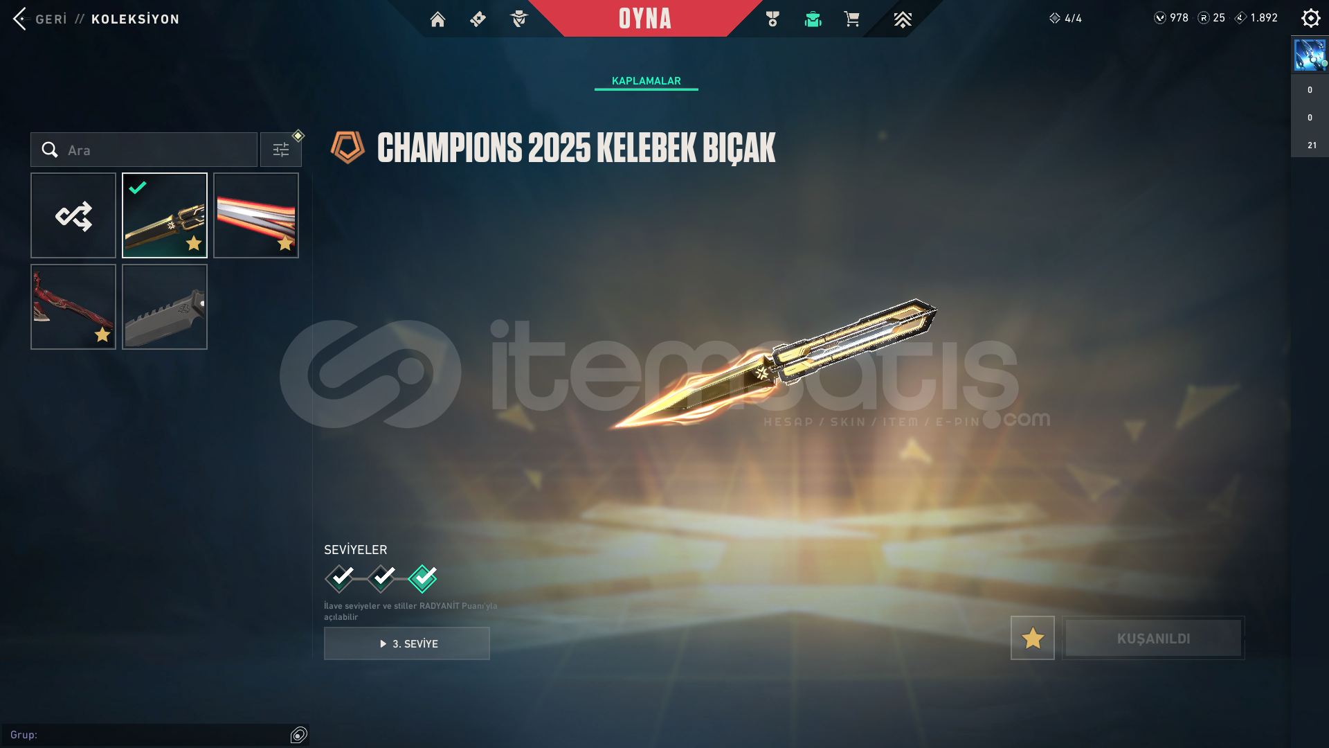 Hesapta AEMONDIR VANDAL, EVORİ VANDAL, CHAMPİON 2025 KELEBEK, VAHŞİÇENE BALTASI, FATİH GHOST VE BİR SÜRÜ SKİN  bulunur.