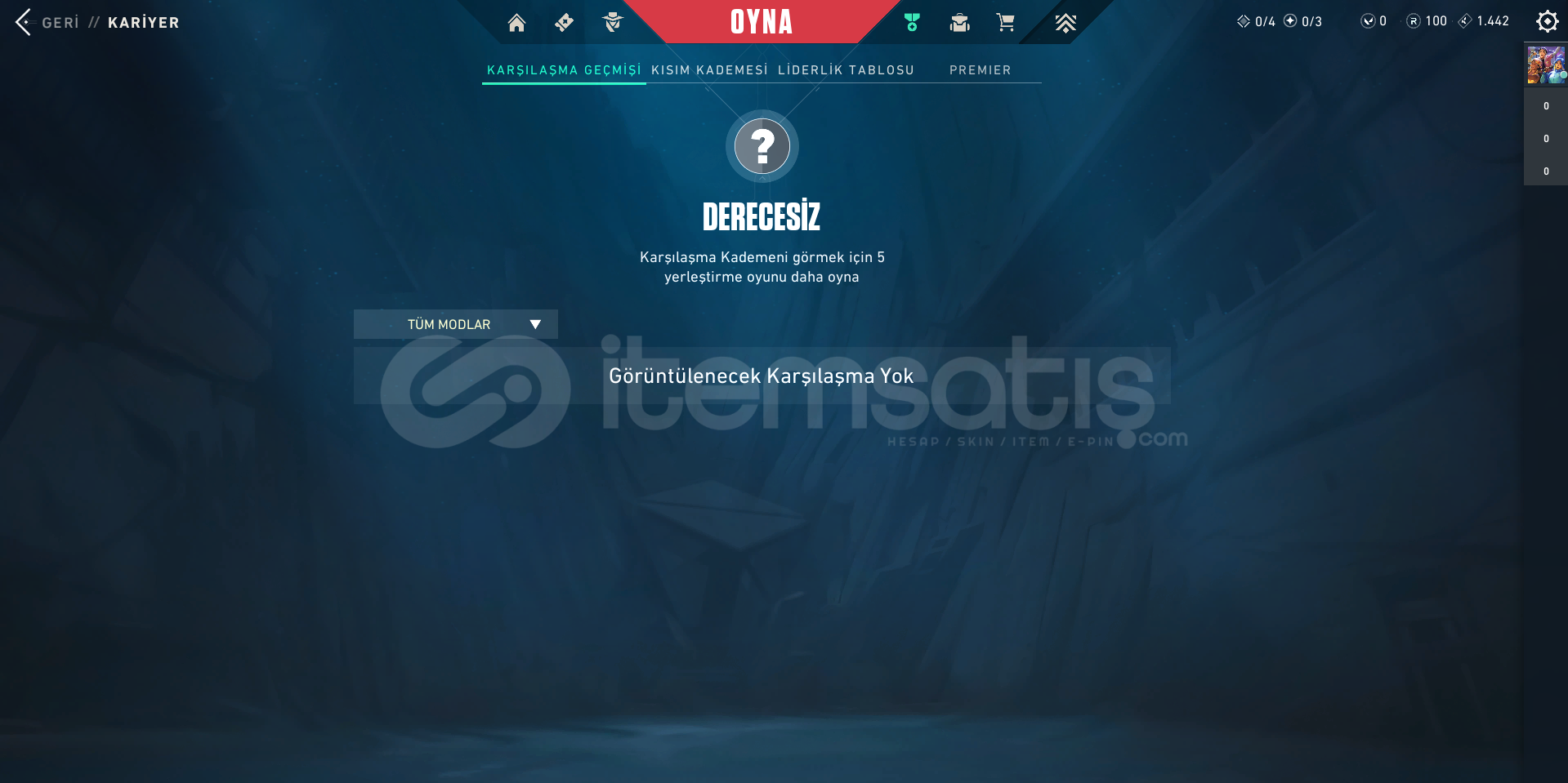 Hesabımız UNRANKED dir rankını açmak için 5 MAÇ oynamanız gerekmektedir peak rankı PLAT 1 dir.