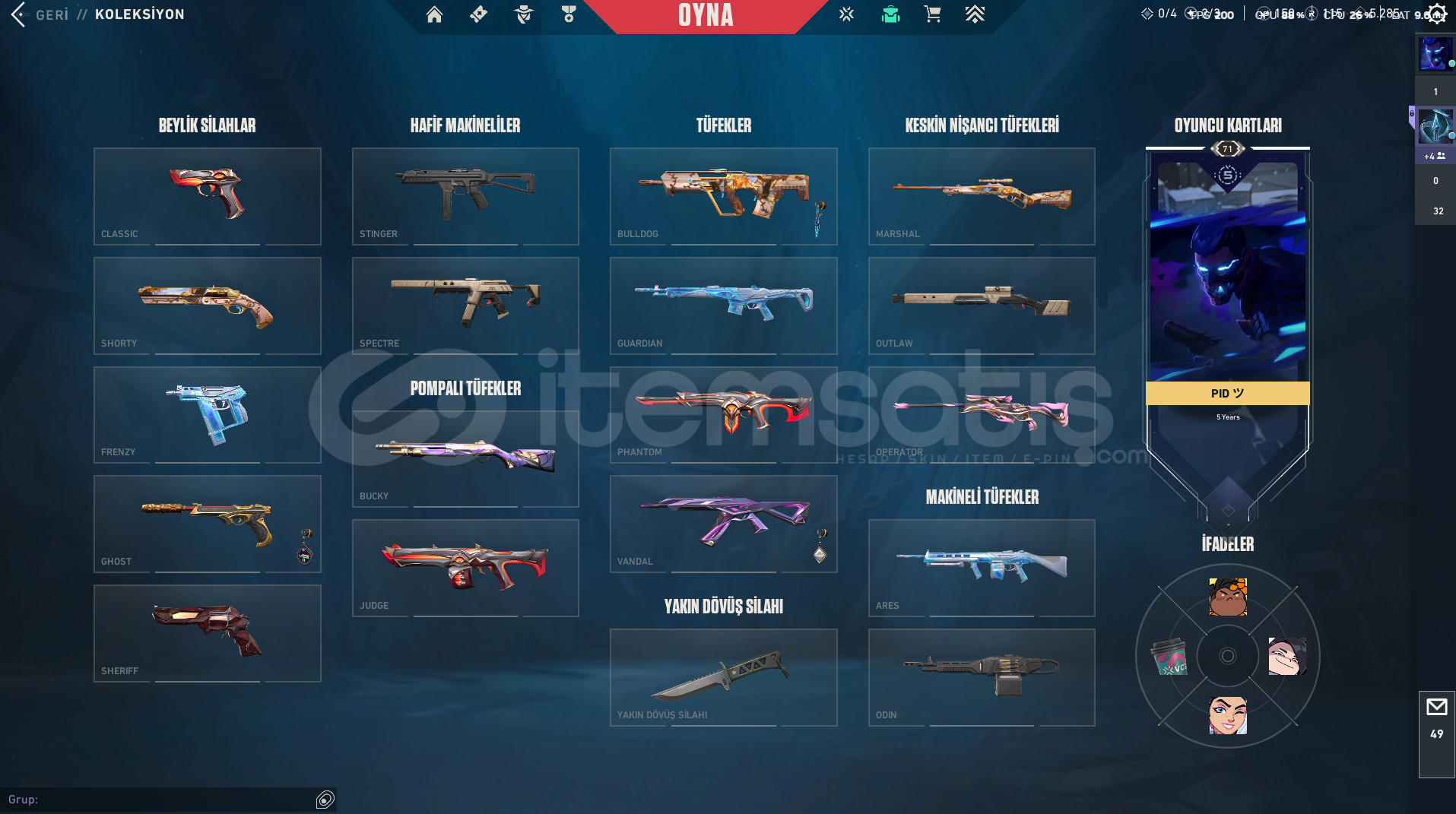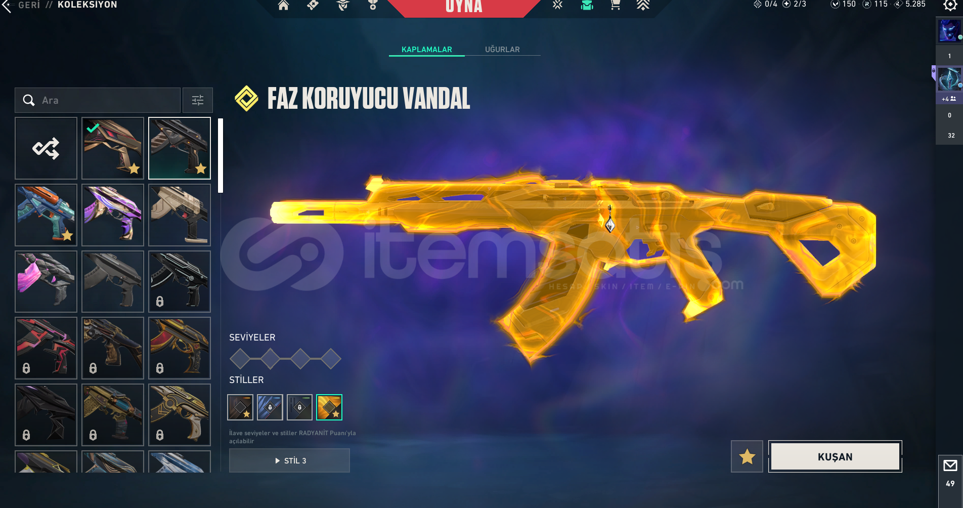 📌 AÇIKLAMA (Madde Madde – 100–500 kelime aralığında)Hesap Türkiye sunucusundadır ve tamamen bana aittir.Mail değişim garantilidir, hesap devri sorunsuz şekilde yapılacaktır.Hesapta toplamda 6 özel Vandal bulunur:Faz Koruyucu VandalUlupençe VandalDolmırin İntikamı VandalSplashX VandalAlbeni VandalAtlas VandalYakın dövüş olarak Uzaylı Avcısı Bıçak h...