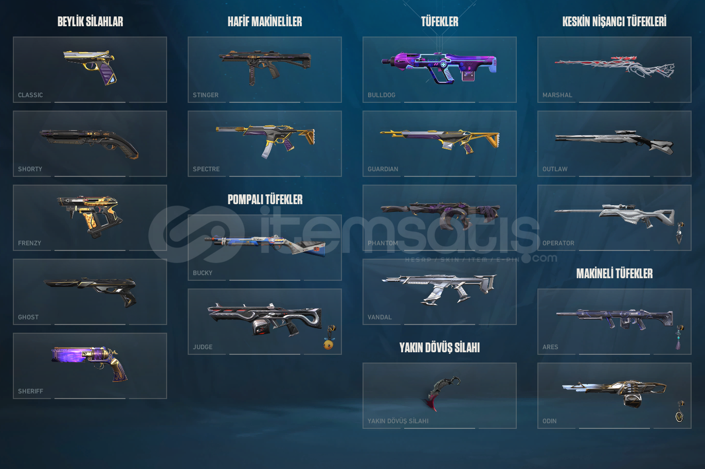HESAPTA 24 TANE YUKSELTILEBILIR SKİN VARAsil ClassicKaos ShortyDelipop FrenzyUlupençe GhostYağmacı ve Seri Tetik SheriffKaos Stinger Anamoli ve Asil SpectreRES BulldogAsil GuardianIşık Muhafızı ve Zifiri PhantomKuronami ,Asil ,GAİA ,Cesur Yurek ,ARCANE VandalYağmacı Karambit Sır Çiçeği KunamiGaia MarshalYıldız Belası Outlawİon OperatörIşık Muhafızı OdinHESABA 12K YATIRILM...