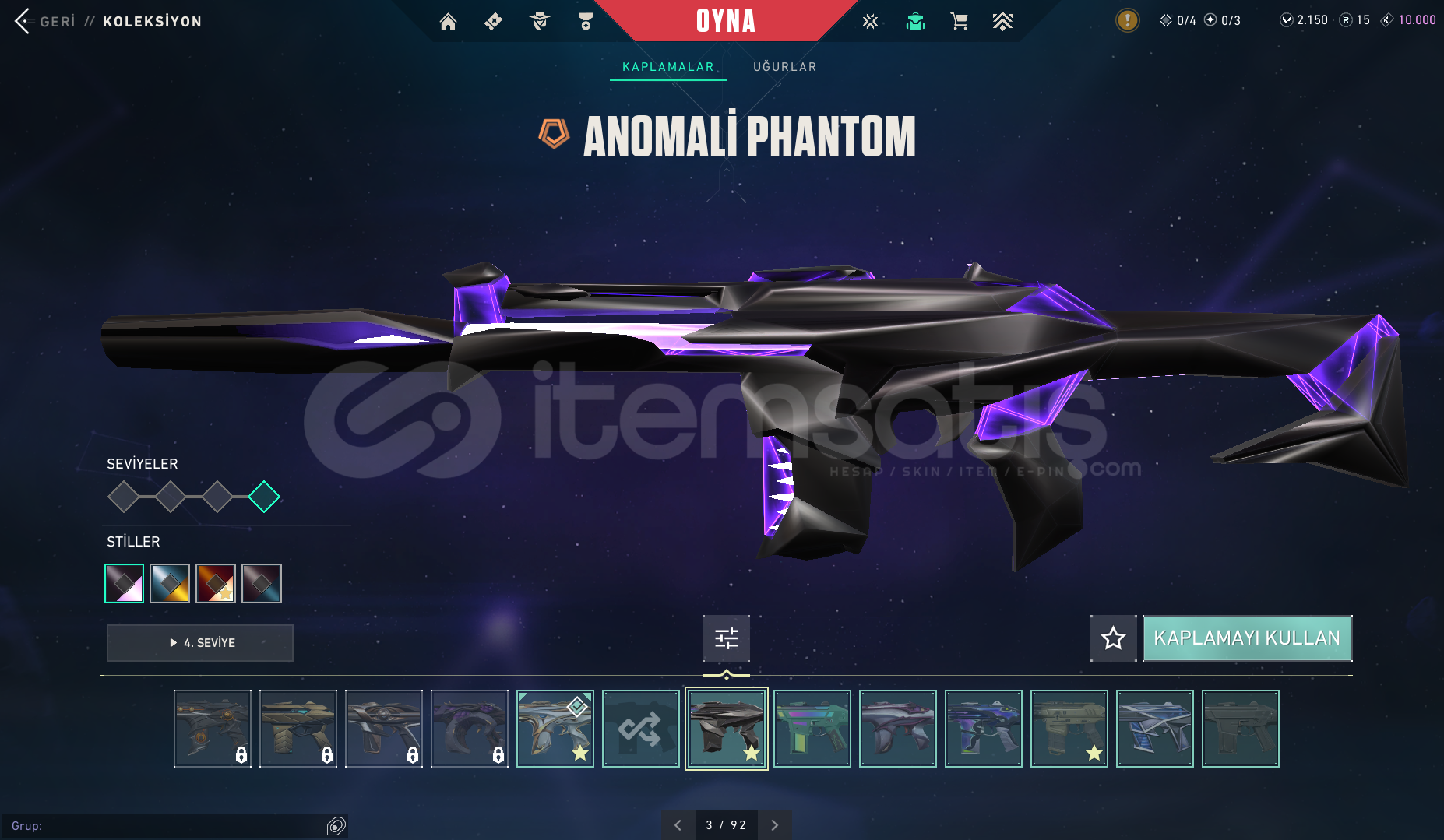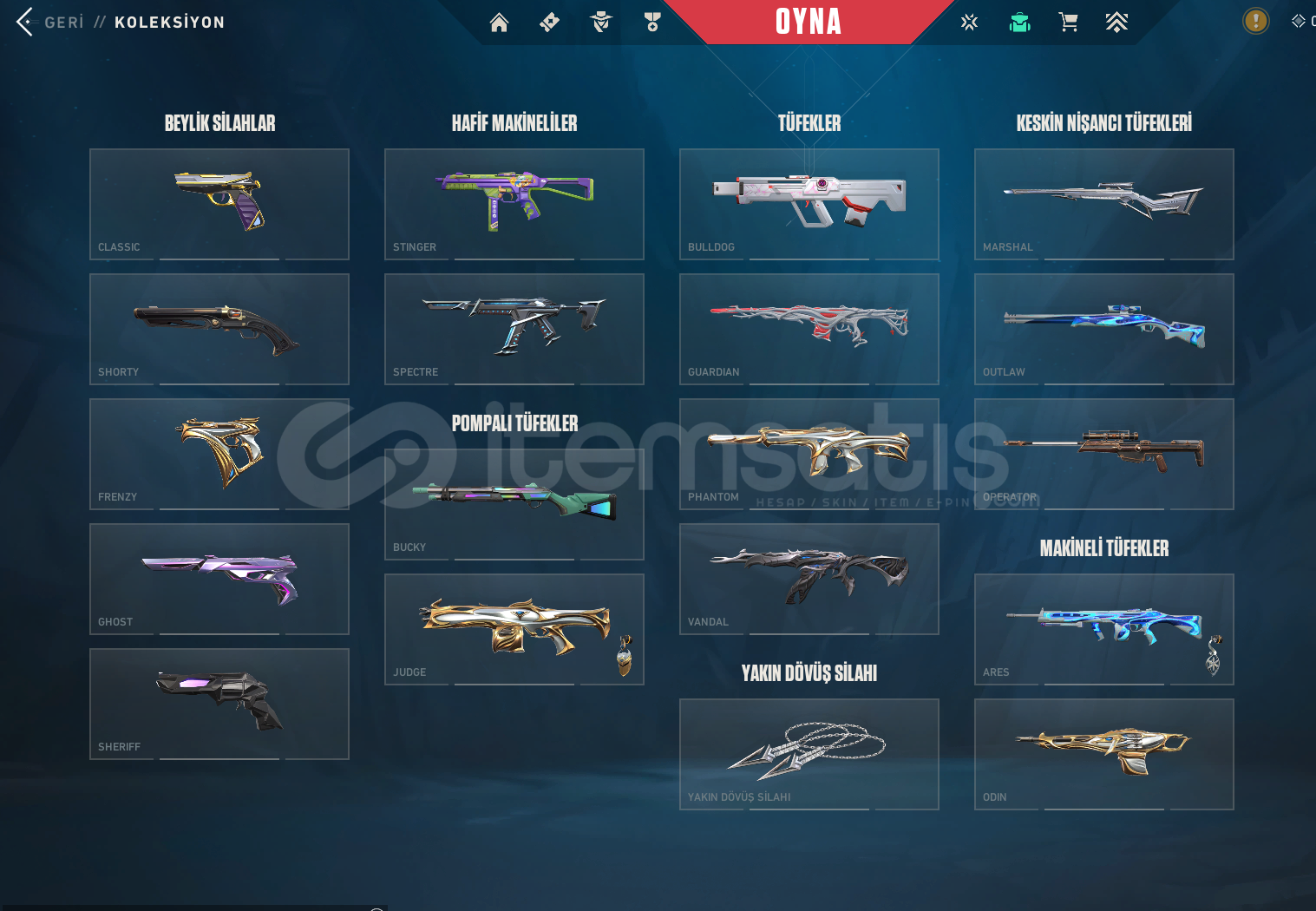 hesapta 2150 vp vardır toplam 13.5k tl yatırılmış hesaprankı dia 3Classic = AsilShorty = battlepassFrenzy = FatihGhost = UlupençeSheriff = anomali- kuronamiStinger = Battle PassSpectre = kuronamiBucky = battlepassJudge = fatihBulldog = spectrumGuardian = gaia nın intikamıPhantom = fatih - anomali - özel harekatVandal = felaketin kalbi - evrim - kaos - kuronami - neptün - oni - rgx 11z pro - soğuk çelik - ulupençe - ya...