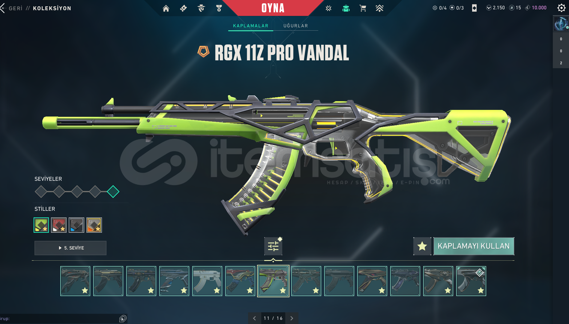 hesapta 2150 vp vardır toplam 13.5k tl yatırılmış hesaprankı dia 3Classic = AsilShorty = battlepassFrenzy = FatihGhost = UlupençeSheriff = anomali- kuronamiStinger = Battle PassSpectre = kuronamiBucky = battlepassJudge = fatihBulldog = spectrumGuardian = gaia nın intikamıPhantom = fatih - anomali - özel harekatVandal = felaketin kalbi - evrim - kaos - kuronami - neptün - oni - rgx 11z pro - soğuk çelik - ulupençe - ya...