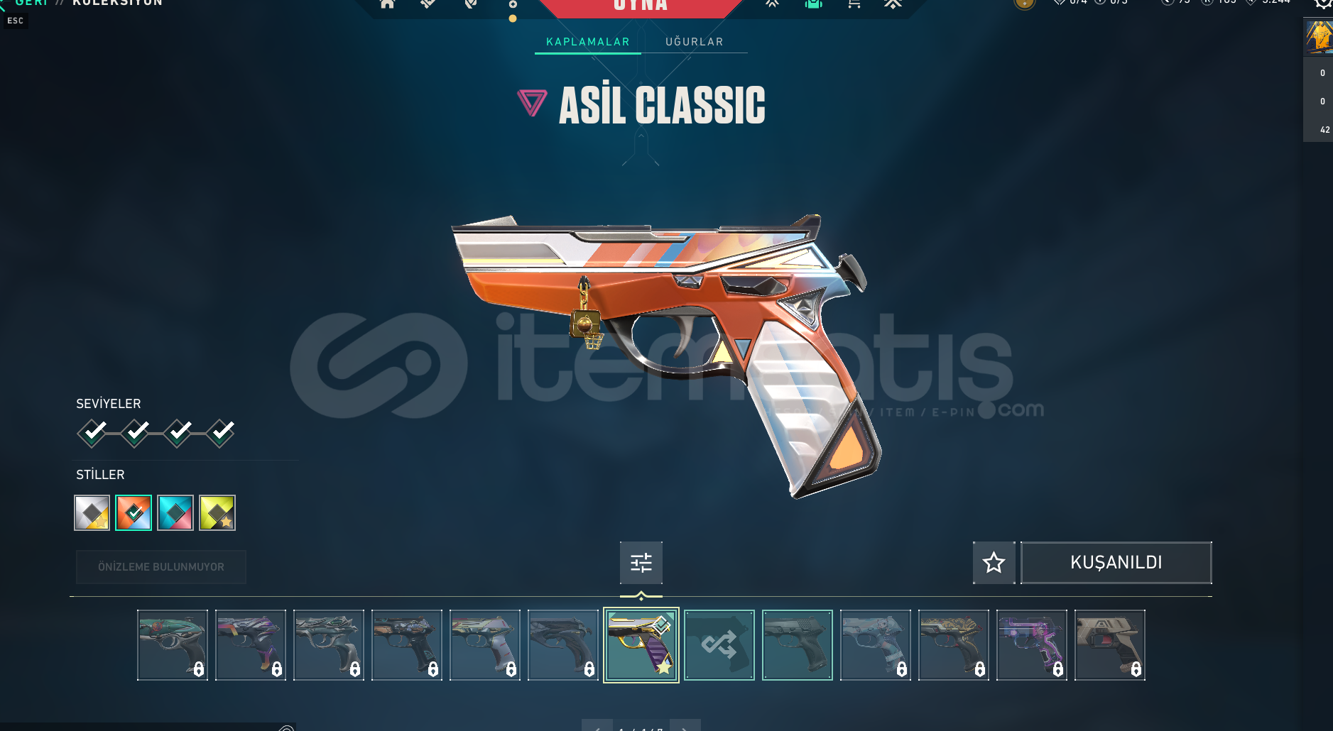 öğrenciyim nakit ihtiyacı sebebiyle satılık. ilk ve tek sahibiyim hesabın maili üstünüze geçirilecektir. SKİNLER:ASİL CLASSİC (TÜM GELİŞTİRMELERİ AÇIK)ASİL V2.0 KARAMBİT (TÜM GELİŞTİRMELERİ AÇIK)SİHİRPUNK SHERİFF (TÜM GELİŞTİRMELERİ AÇIK)RUH AZABI SPECTRE (TÜM GELİŞTİRMELERİ AÇIK...