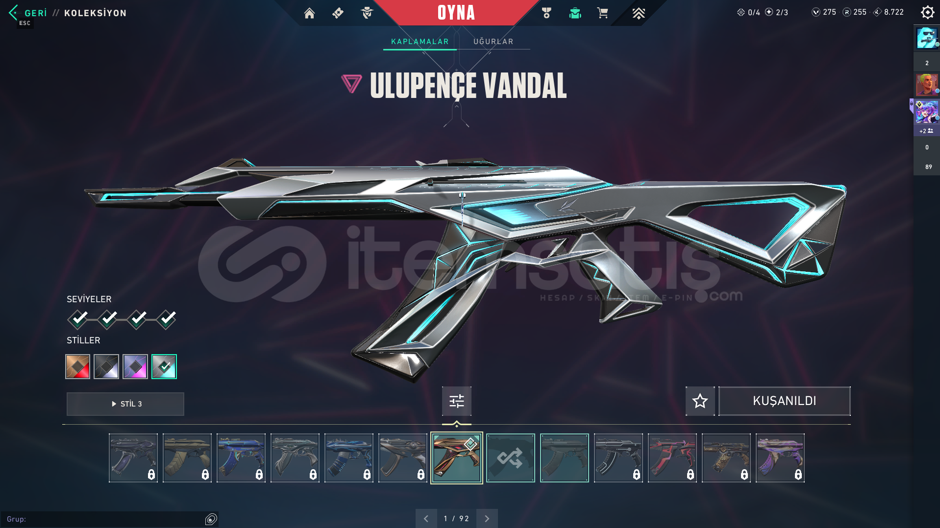 Valorant skinli E-Postalı hesaptırULUPENÇE VANDAL BULUNAN HESAPTIR.Rank: DERECESİZSunucu: TRMağaza: TRMailli hesaptır bilgileri size devredilmektedir, mevcut bilgileri kendi bilgileriniz ile değiştirebilirsiniz.Ürünler fotoğraftakiler ile bire bir aynı hesaptır, farklı hesap değildir