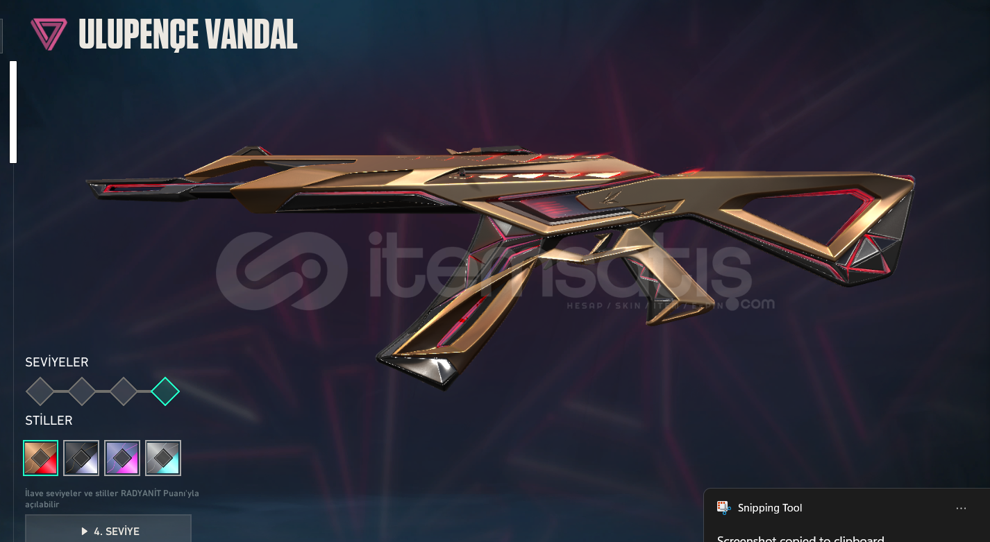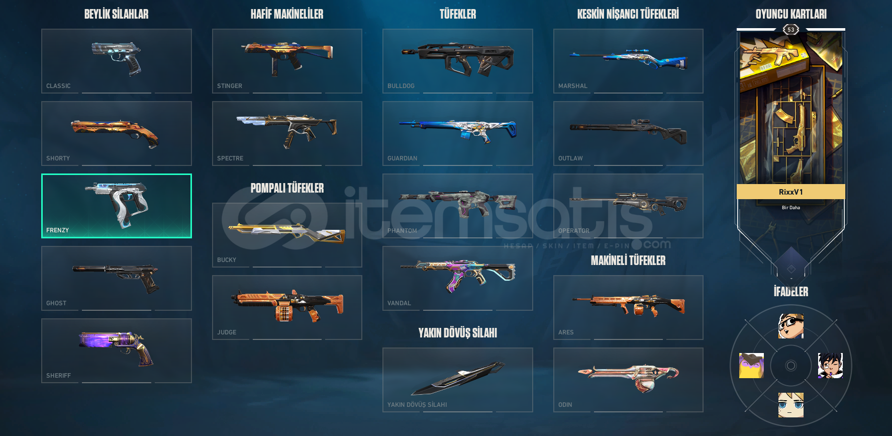 HESAPTA DERECELİ OYNANMAMIŞTIR, 30 +SKIN BUNUN 23'Ü DEĞERLİ OLMAK ÜZERE SATILIKTIR.EVORI, FAZ KORUYUCU, ULU PENÇE VE BATTLEPASS SKINLERI BULUNMAKTADIR.Faz koruyucu Bulldog Protokol Phantom Asil Bucky Işık muhafızları Spectre Evori Spectre Faz Koruyucu Ghost Cesur yürek Ghost Evori Ghost Ulupençe Ghost Seri tetik Sherrif Delipop Vandal Ejderin Buyruğu Vandal Evori Rüyakanatlar Vandal Faz koruyucu Vandal Ejder Ateş...