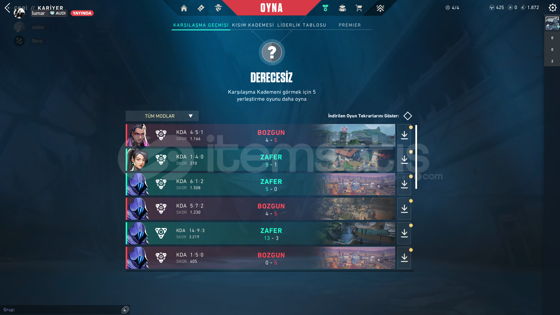 Ürün Hakkında Bilgi;İLANI SATIN ALDIĞINIZDA 7/24 OTOMATİK OLARAK TESLİM EDİLİR.RANK - UNRANKEDHESAP SEVİYESİ - 18SKİN SAYISI - 1VP SAYISI - 425+ 100.000 BAŞARILI İŞLEM İLE GÜVENLE ALIŞVERİŞ YAPABİLİRSİNİZ