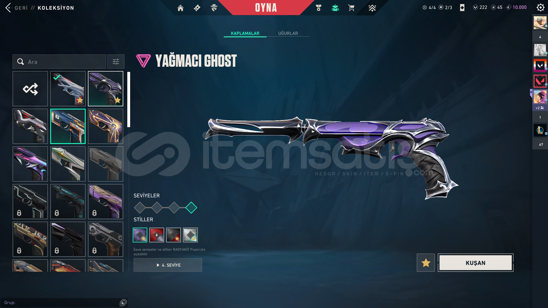 10 VANDAL (kuronami,gaia,felaketin kalbi,ejderin buyruğu,asil,yağmacı,yıldız belası,sürat canavarı,cesur yürek,rgx)3 PHANTOM (asil,helezon,yitik)hepsi full seviye2 BIÇAK(VCT KARAMBİT,radyant krizi sopa)hepsi full seviye2 GHOST (gaia,yağmacı)hepsi full seviye1 SHERİFF(zamanın ötesi) full seviyeMaks yücelik 3 gördüm şuan elmas 3HESABAB 14 BİN TL YATIRILDI
