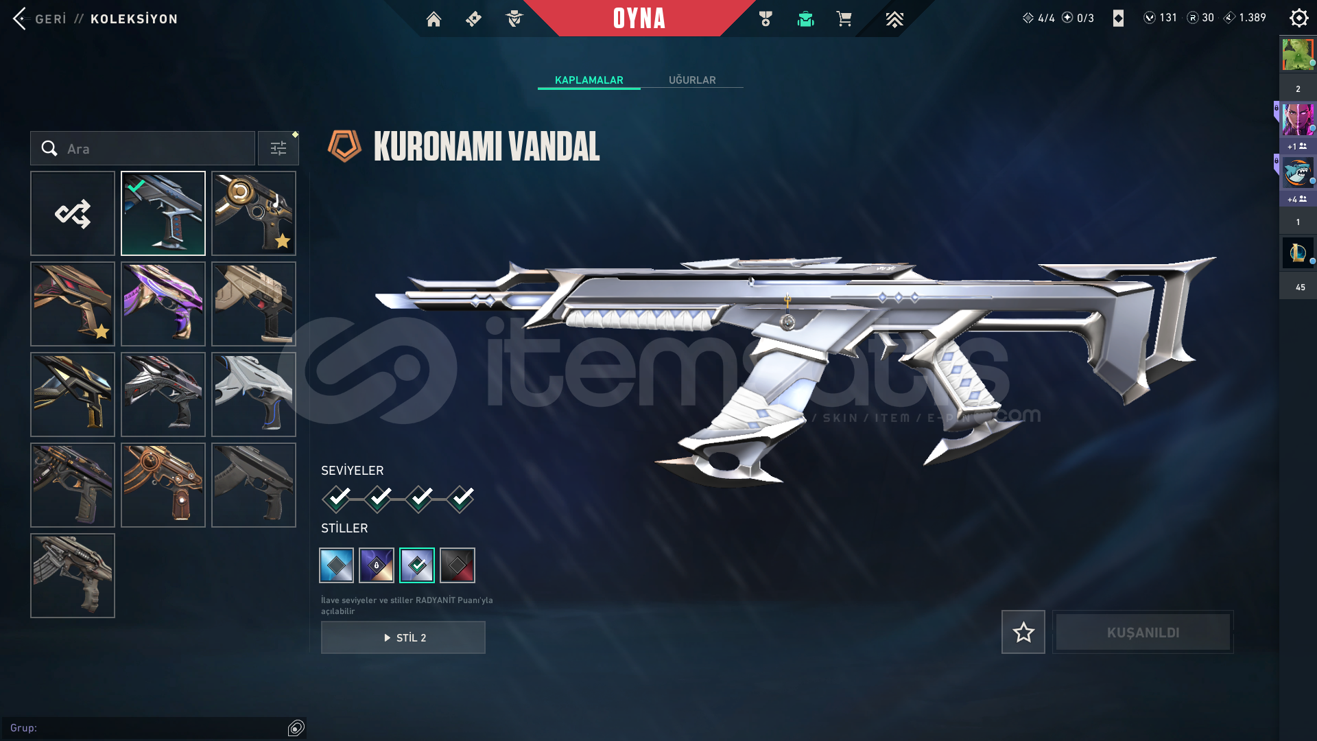 Vandallar: kaos,ulupençe,,kronomi,2025 champions,iyon,sinirpunk,köken +3 battel pass Phantom : asil,iyon stinger: kaos Sheriff: ıyon, ejderin buyrugu Ghost: evori Classsic:spectrum Operator: sırçiçeği Ares: anaomali Odin: seri tetik Bıcaklar; oni katana,iyonkarambit, özel harekat kelebek spectre:iyon HESAP EN ÇOK GOLD 3 OLDU 210 SEVIYEDİR İSİM DEĞİŞİKLİK HAKKI VAR BU KADAR SKİNE KARŞI FIYATI UYGUN TUTULMUŞTUR