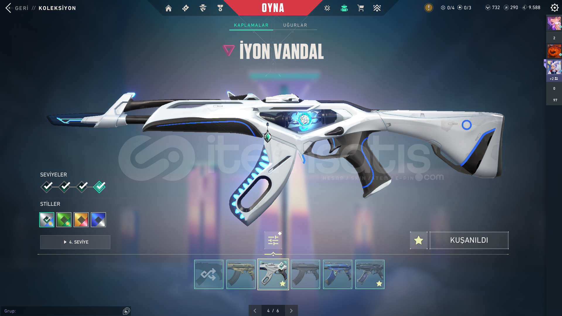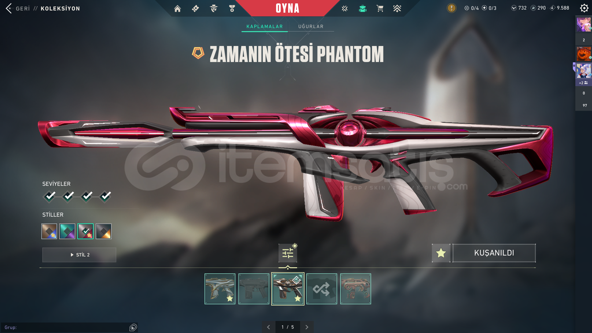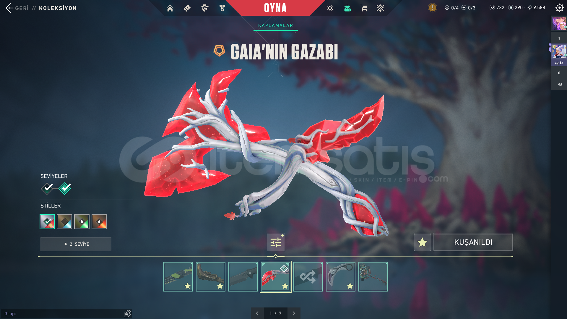 Bitirilmiş 1 Battlepass ve ek olarak 730 VP bulunmaktadır, 290 Radyanit puanı vardır istediğiniz skini kolayca geliştirebilirsiniz.