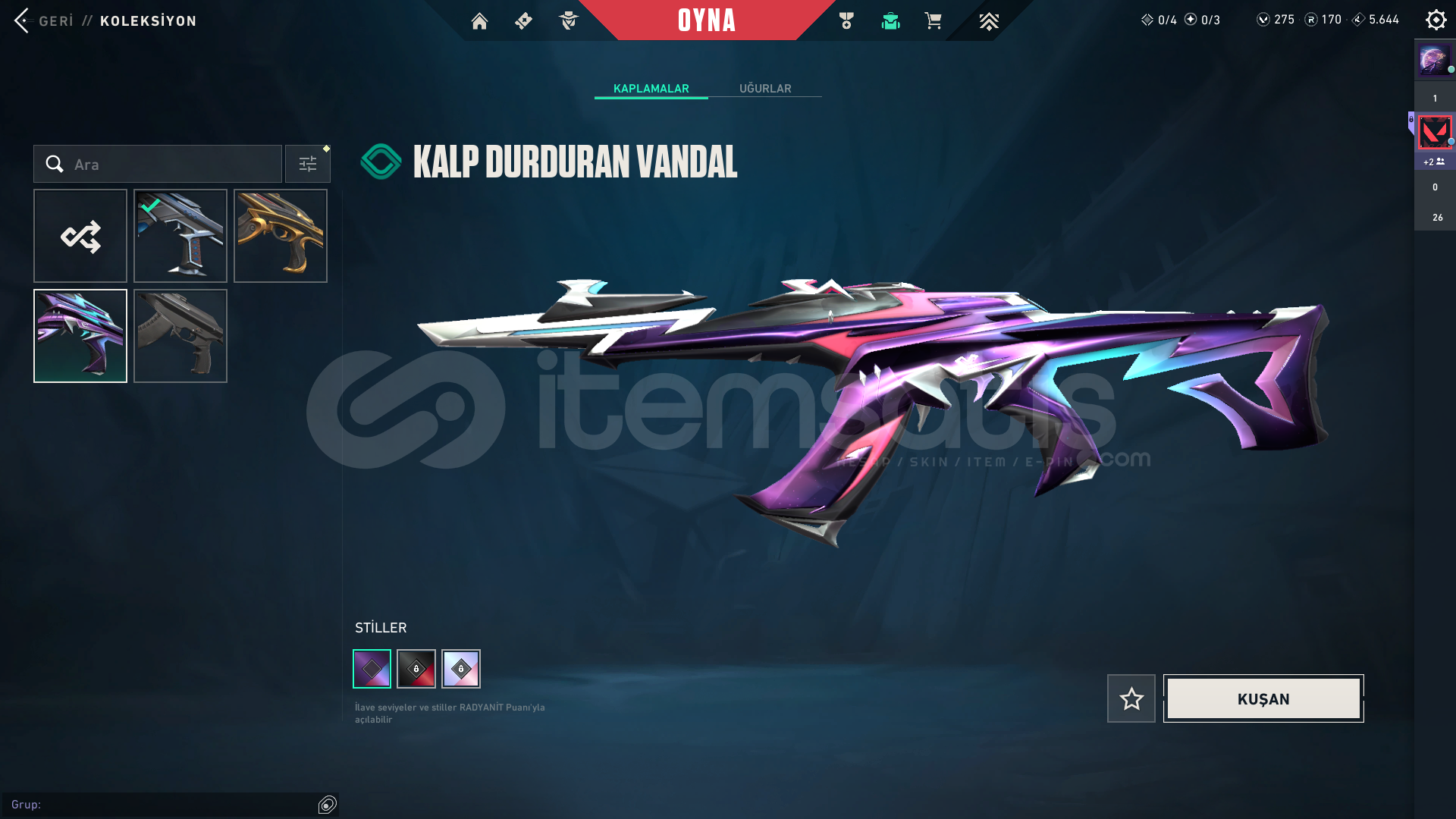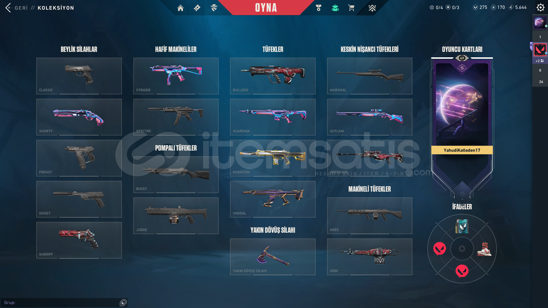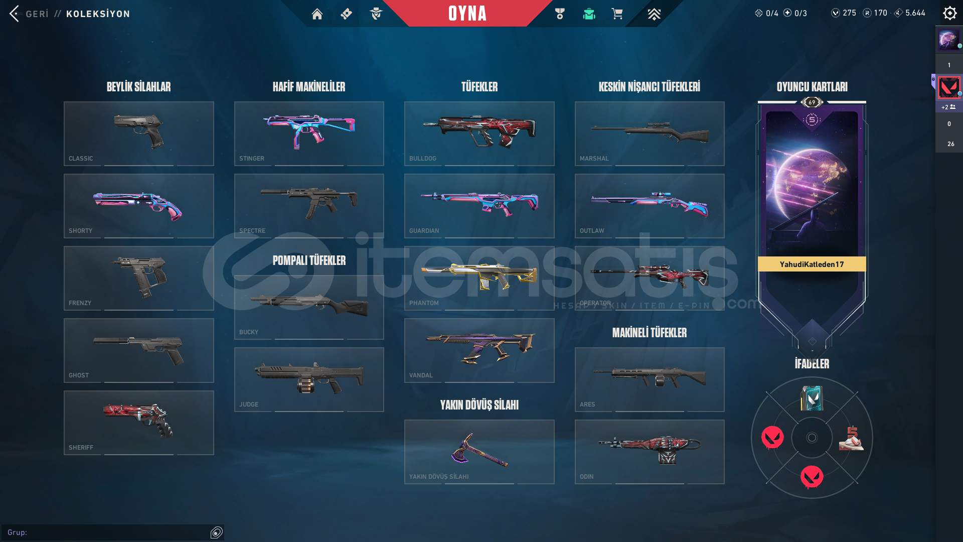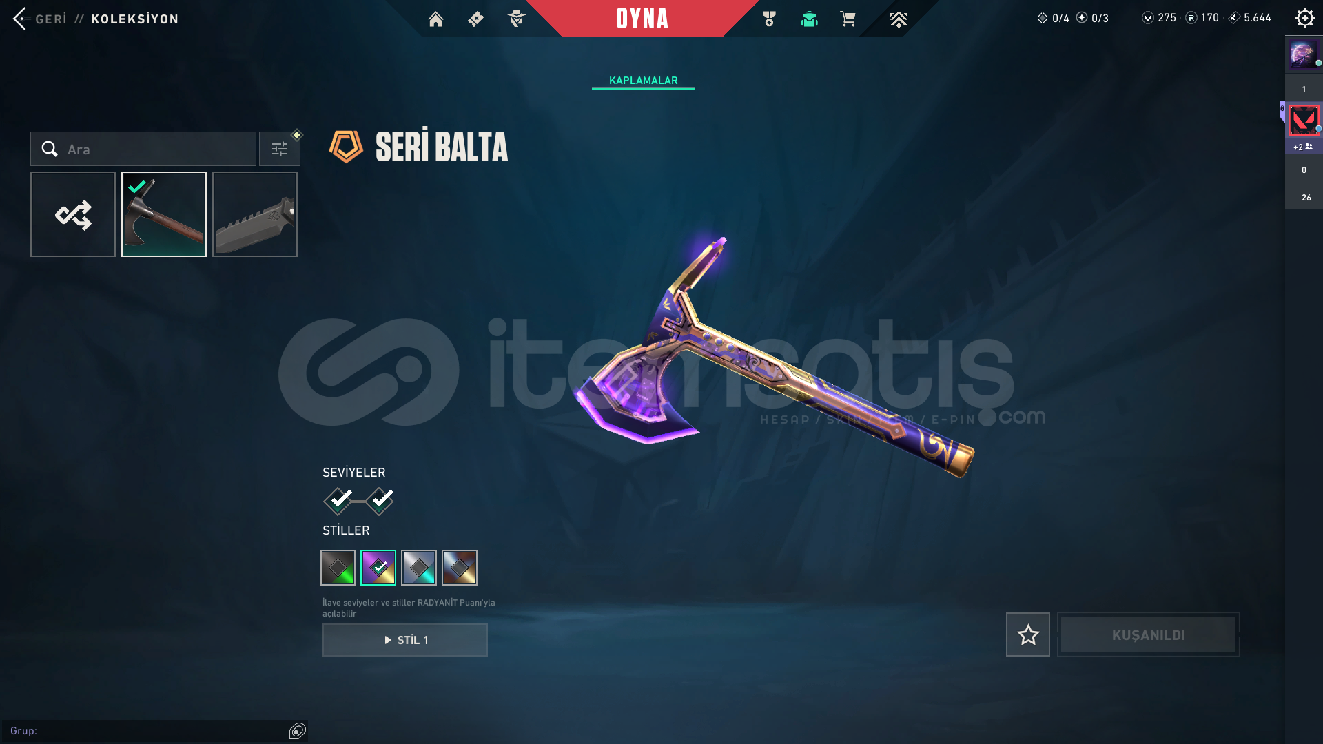 Merhaba arkadaşlar valorantı bıraktığım için hesabımı satıyorum hesabımda olan skinler şunlardır; seri tetik balta + şuanki botlepass bıçağı, vandalda ise kuronomi vandal + cesur yürek vandal + şuanki botlepass vandalı, phantomda asil phantom vardır hesab bu kadar dia 1 temiz hesap hiç bir banı yoktur,hesaba 2730 lira yatırmışım zaten