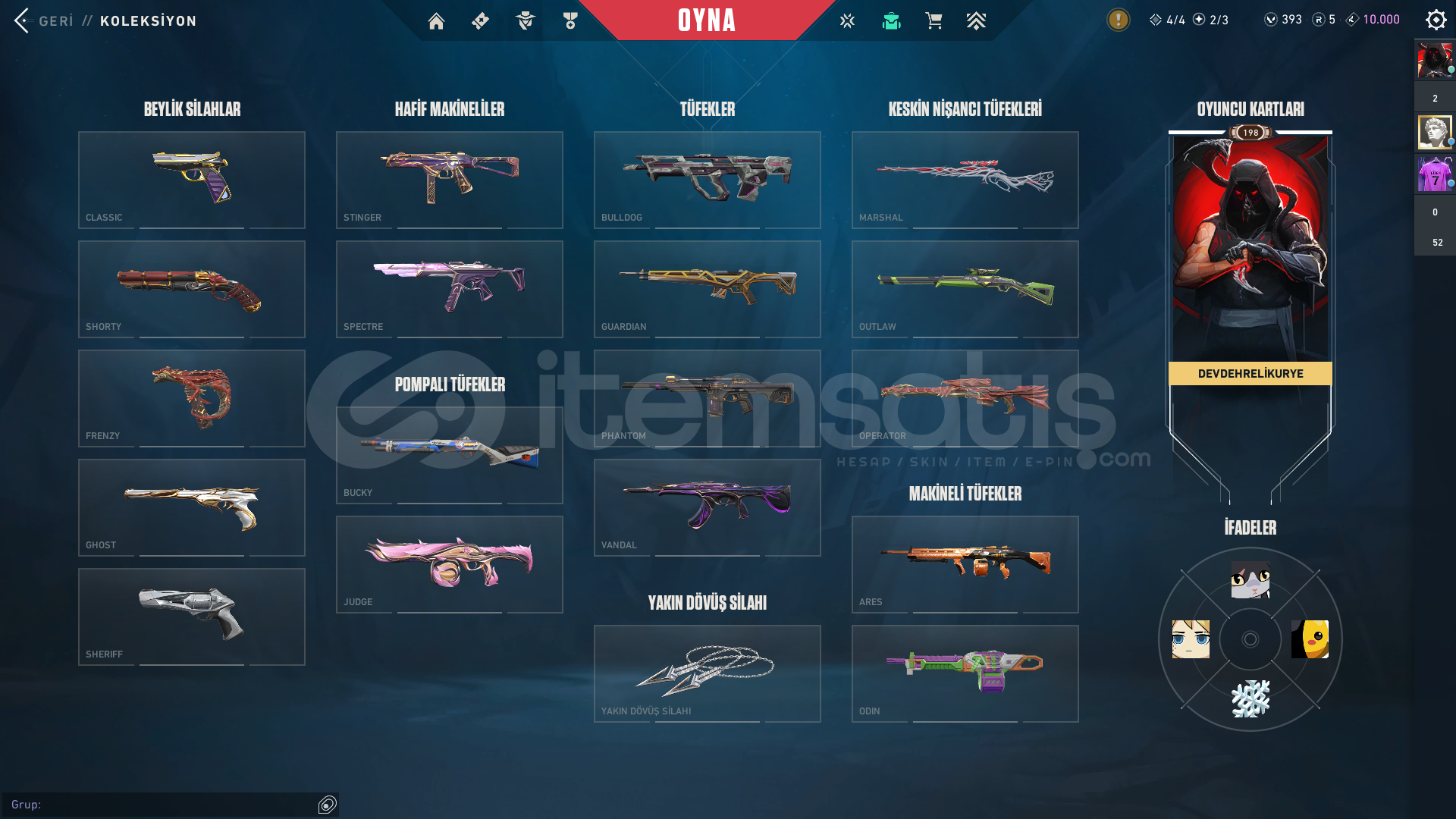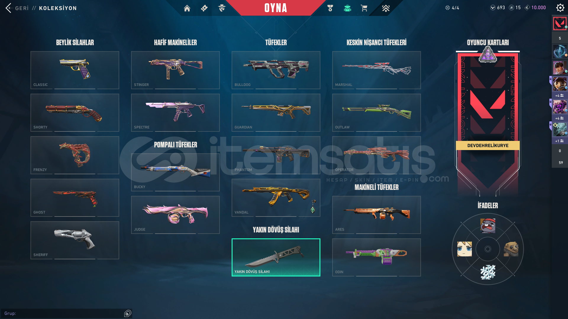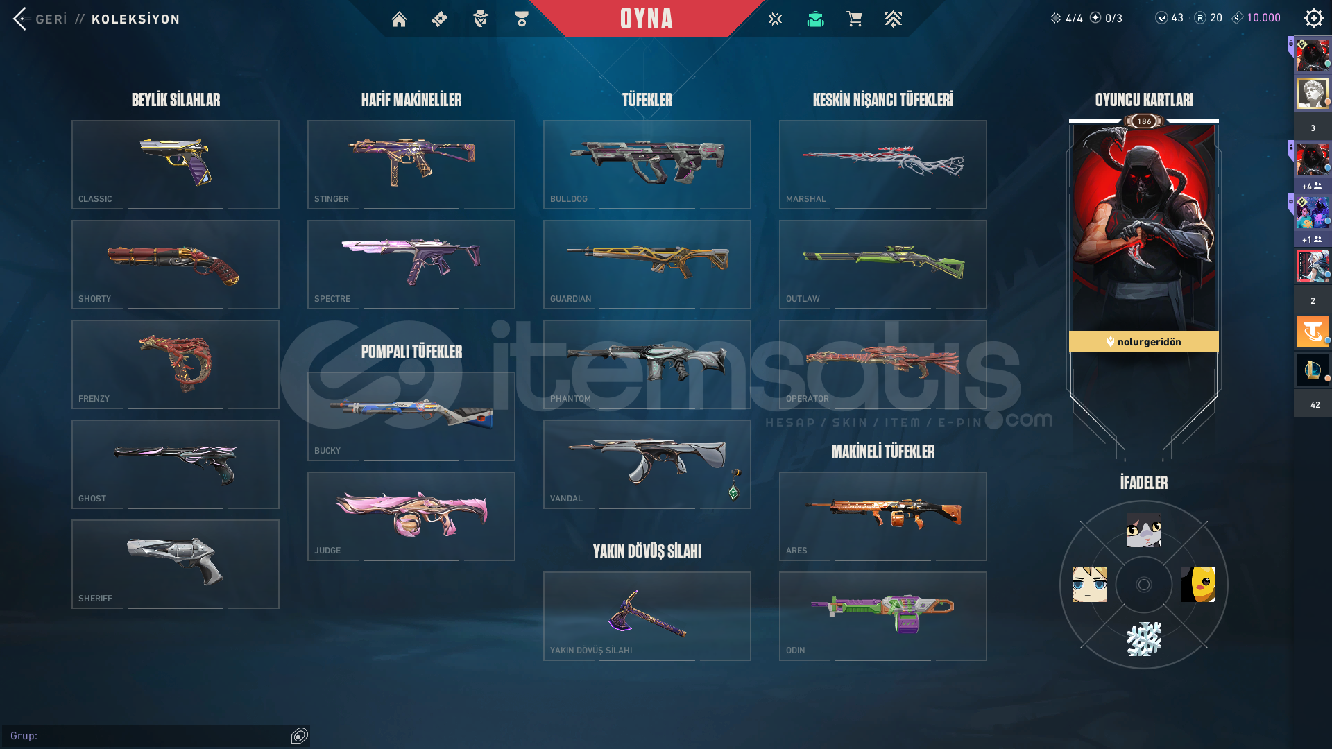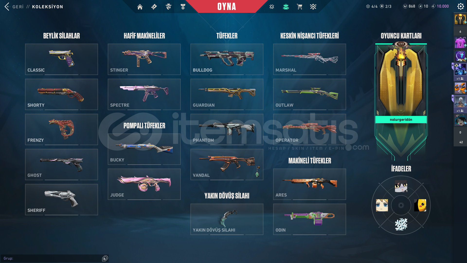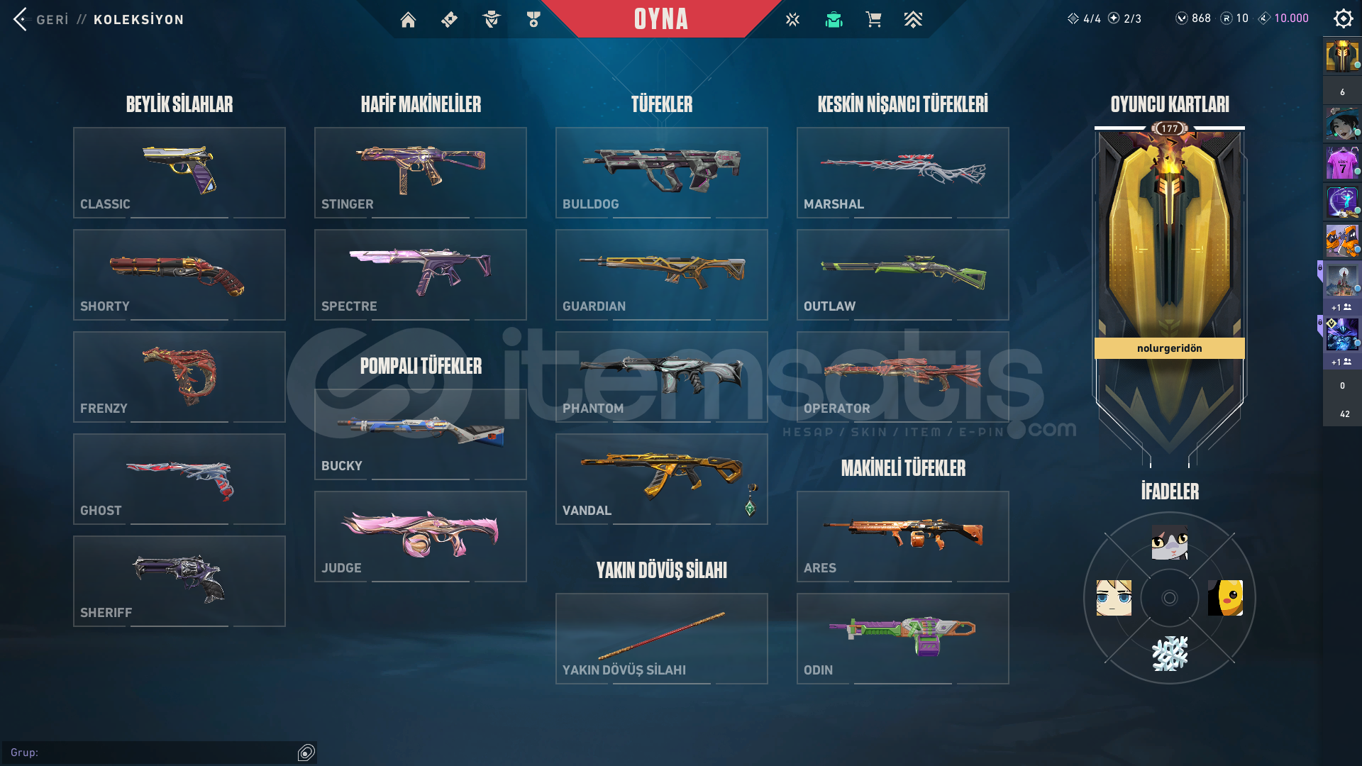 Vandallar: Ulupençe/Faz koruyu/Yağmacı/Yitik/Asil/Cesur yürek/Evrim/champions 2025 Phantom:Yağmacı/Kaos Classic:Asil Ghost:Fatih/Gaia Sherrif:İyon/Yağmacı Frenzy:Ejder Shorty:Oni Spectre:Işık muhafızı Judge:Sırçiçeği Bulldog:Protokol Guardian:RGX Bıçak:Yağmacı karambit/Ruyi sopası/Seri Balta/Uzaylı avcısı/ Kronomi bıçak Marshal:Gaia Outlaw:RGX Operator:Ejder Odin:Blastick hesabım fulldur alıcısına hayırlı olsun pazarlık düşünülür