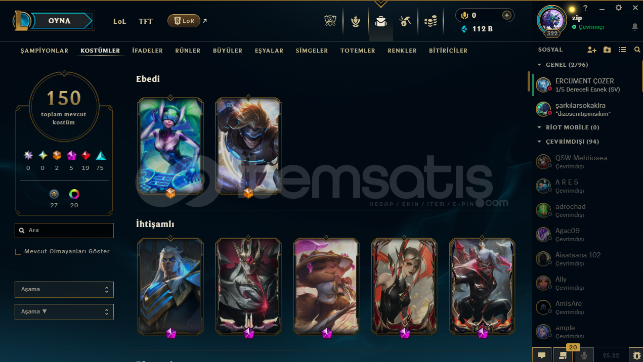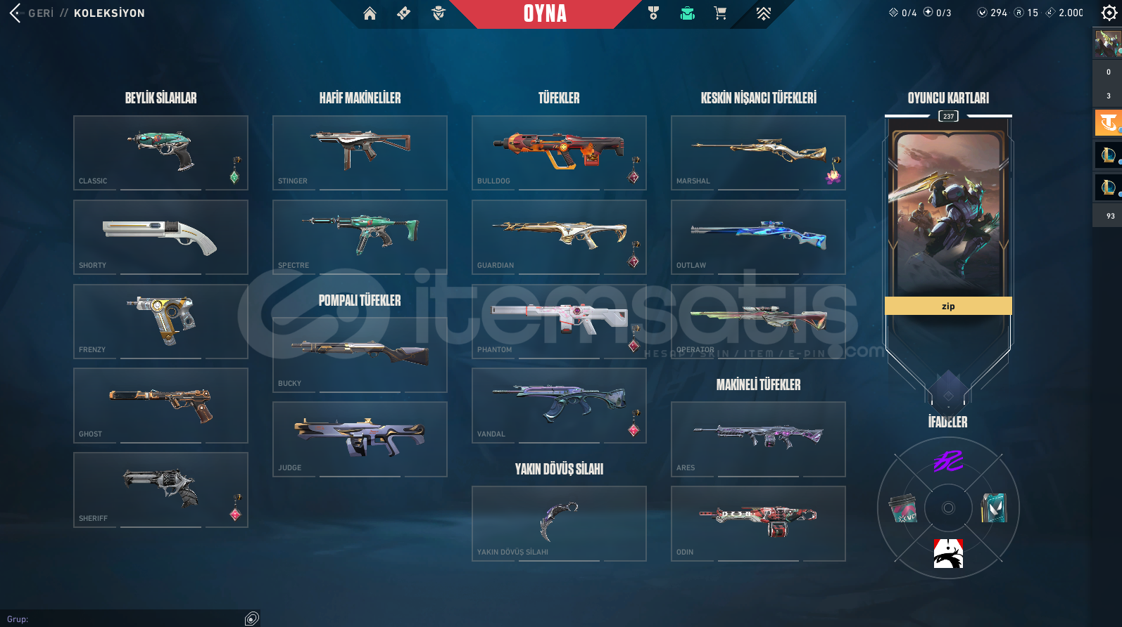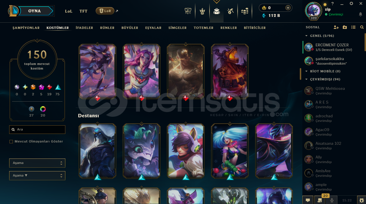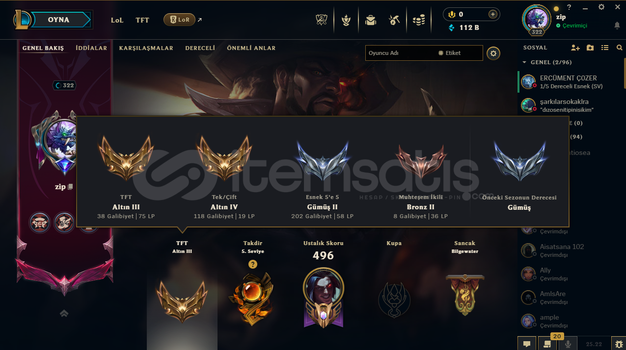 VALORANT RANKI: ÖLÜMSÜZLÜK(İMMORTAL) 1159 SKİN (ALTIN AFET BIÇAK DAHİL)320 UĞURLUK233 SPREY214 KART138 UNVANLOL:150 KOSTÜM171 ŞAMPİYON(HEPSİ AÇIK)20 RENK PAKETİ213 PROFİL İKONU34 TOTEM165 İFADE112K MAVİ ÖZTAKDİR SEVİYESİ 5ESNEK: GÜMÜŞ 2 | TEK ÇİFT: ALTIN 4 | TFT: ALTIN 3 | MUHTEŞEM İKİLİ: BRONZ 2YENİ TFT KARTI ALINDI VE FULLEND...