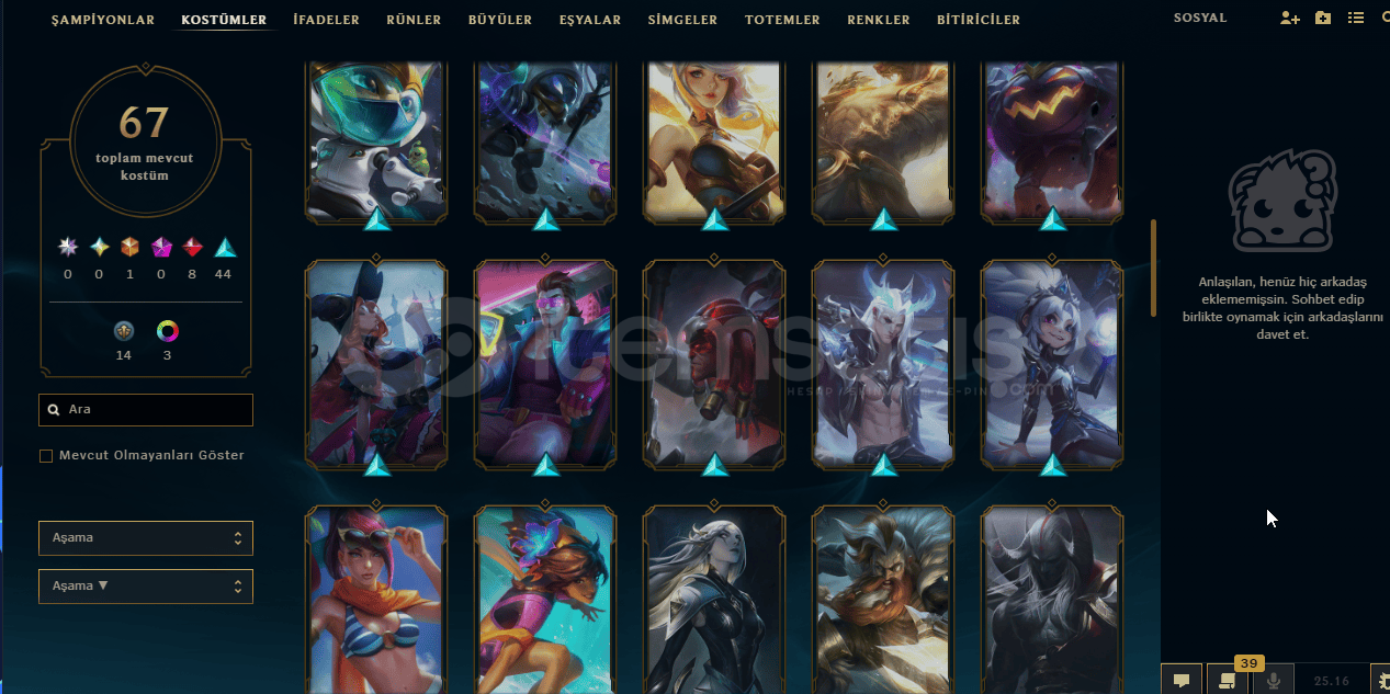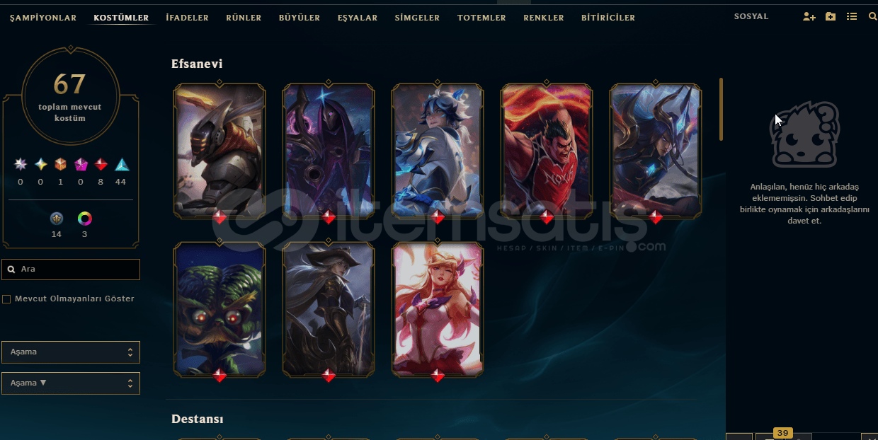 LoL-327lvl 1 Ebedi 8 Efsanevi 44 Destansı 14 Hatıra (67 Skin)