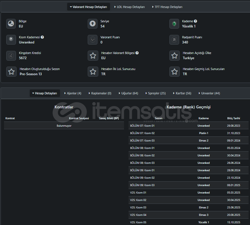 Valorant TR Sunucu Yücelik 1 skinsiz hesap 340 Radyanit Reyna - Raze - Cypher - Skye