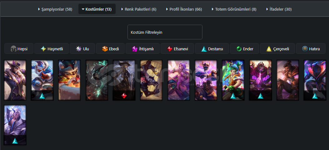 Lol demir2 düşük elo kostümlü Vahşi Batılı Ashe - Kardan Adam Yi - Arcade Riven - Üç Erdem Shen Takdir/Turnuva - Arş Hükümdarı Zed - Ruh Çiçeği Yone - Şanlı Twisted Fate - Boz Warwick Takdir/Turnuva - Mutlu Cin Teemo - Boz Warwick Takdir/Turnuva + Renk Paketleri - Orta Çağlı Twitch Takdir/Turnuva + Renk Paketleri - Lotus Çiçeği İrelia - Üç Erdem Malzahar Takdir/Turnuva - Üç erdem Akshan Takdir/Turnuva