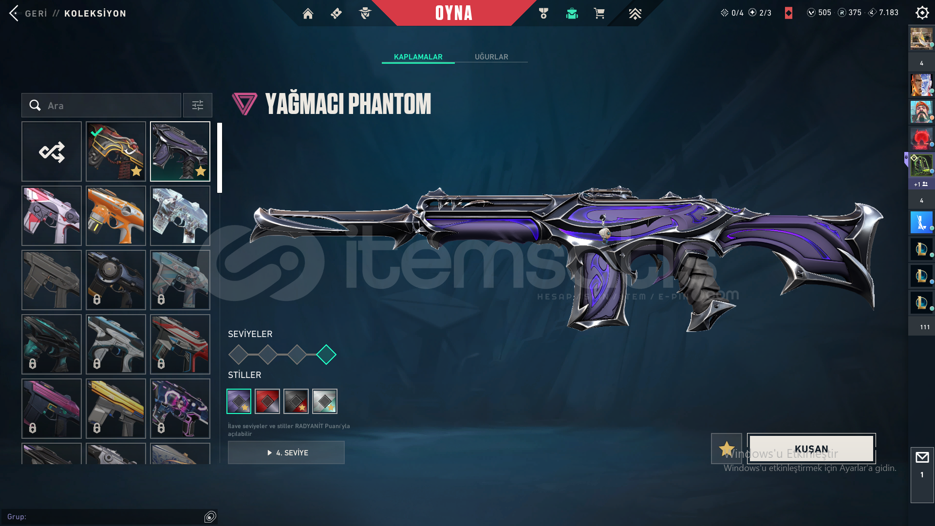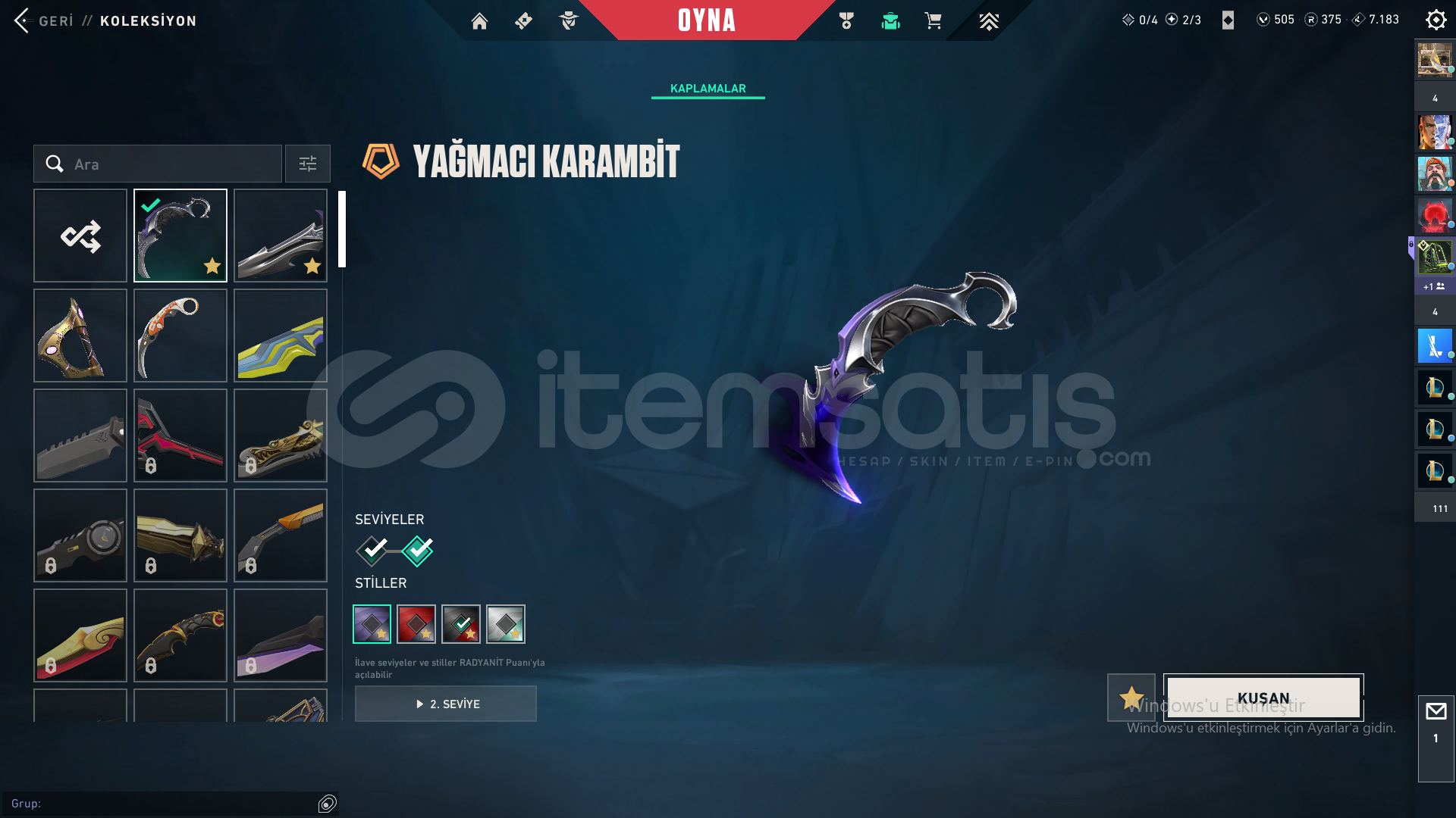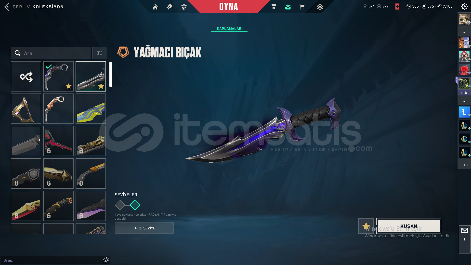Yağmacı Vandal Asil VandalOni PhantomYağmacı PhantomKış Harikası PhantomAnomali SheriffYitik SpectreKöken OperatorŞenlik JudgeYağmacı BıçakYağmacı Karambit3 Adet BattlePassHesap 205 Leveldir.