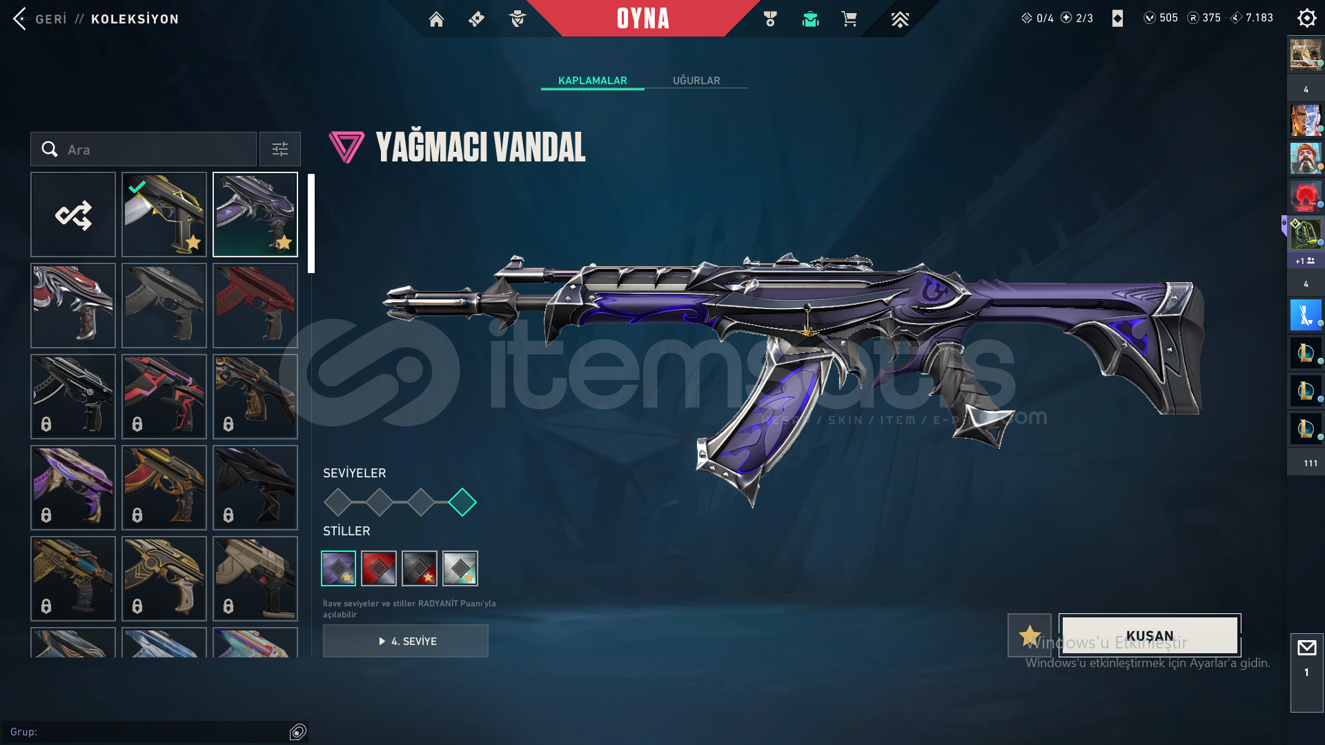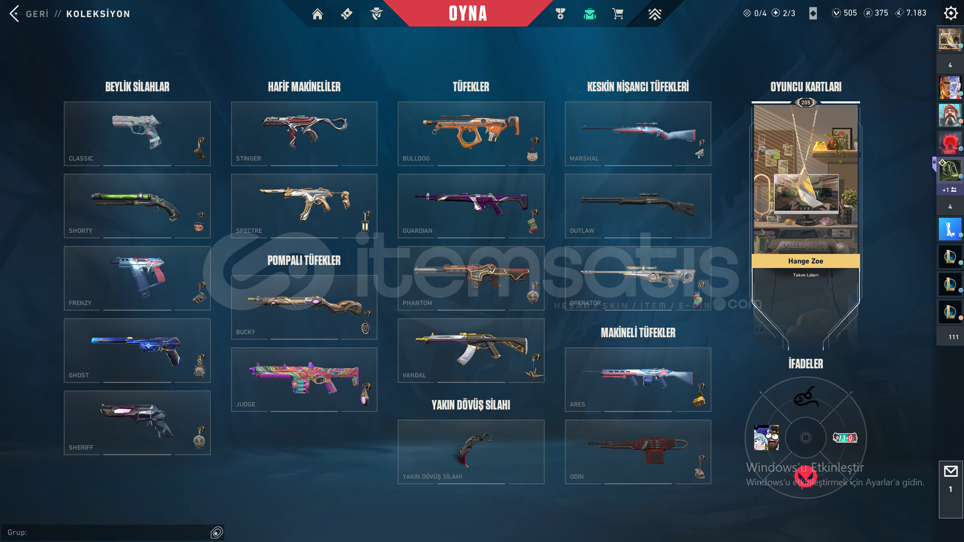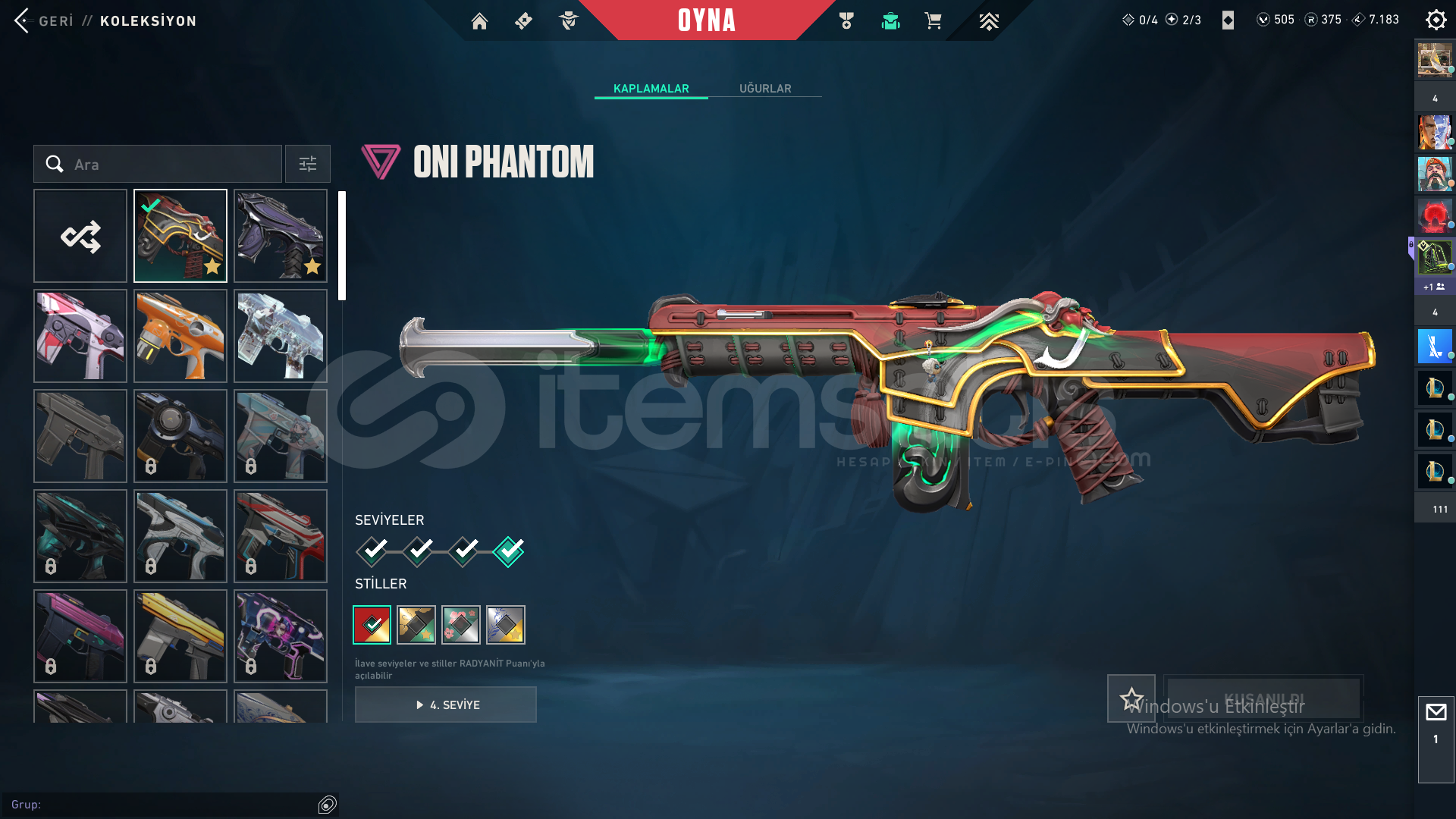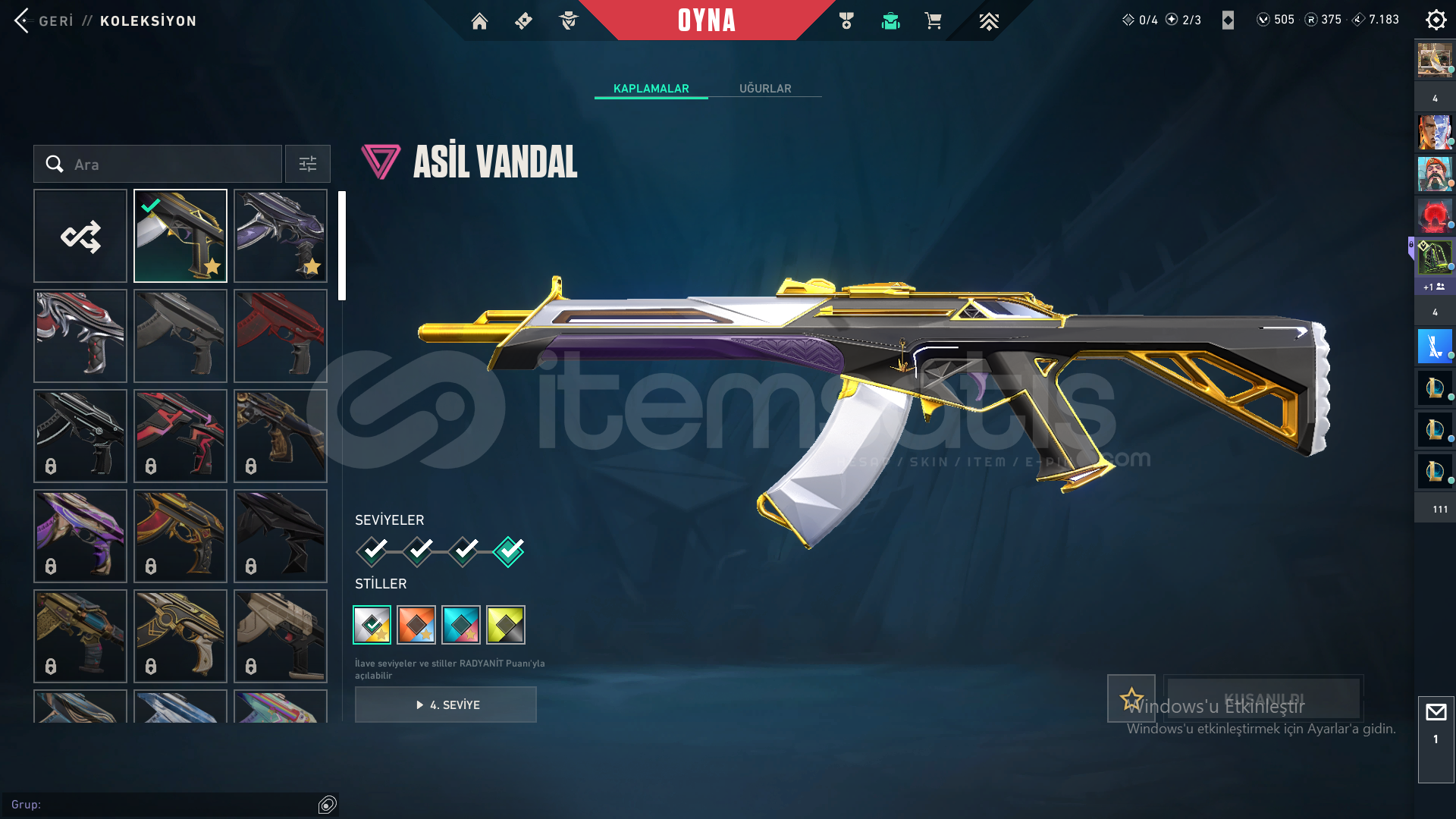 Yağmacı Vandal Asil VandalOni PhantomYağmacı PhantomKış Harikası PhantomAnomali SheriffYitik SpectreKöken OperatorŞenlik JudgeYağmacı BıçakYağmacı Karambit3 Adet BattlePassHesap 205 Leveldir.