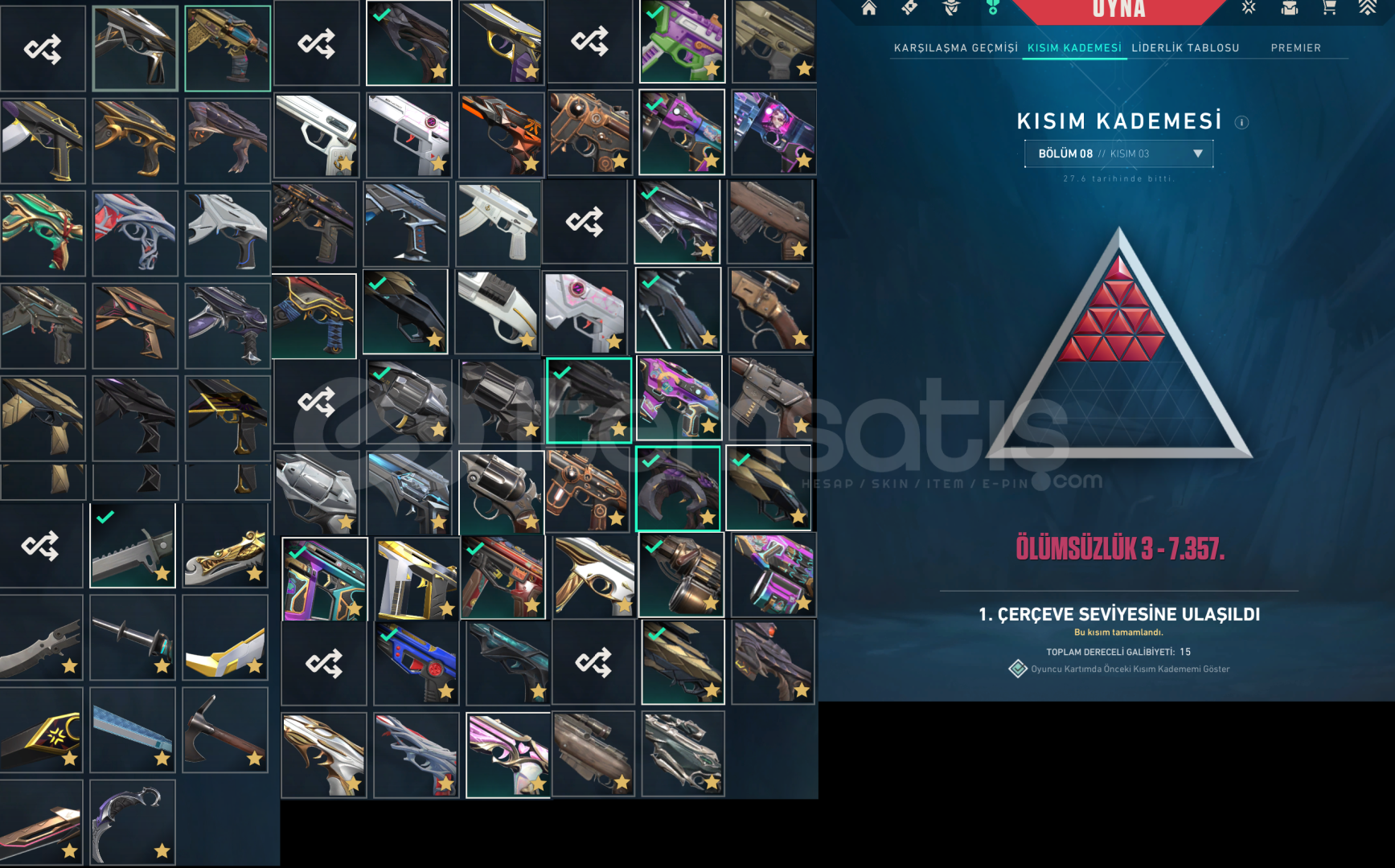 72+ adet satın alınmış kaliteli skinler bulunmaktadır.Pass ile birlikte 150 den fazla skin vardır.Peak olarak İmmortal 3 bitirdi 1 senedir unrankeddir elosu yüksektir..Satış sonrasında da yardımcı olurum.