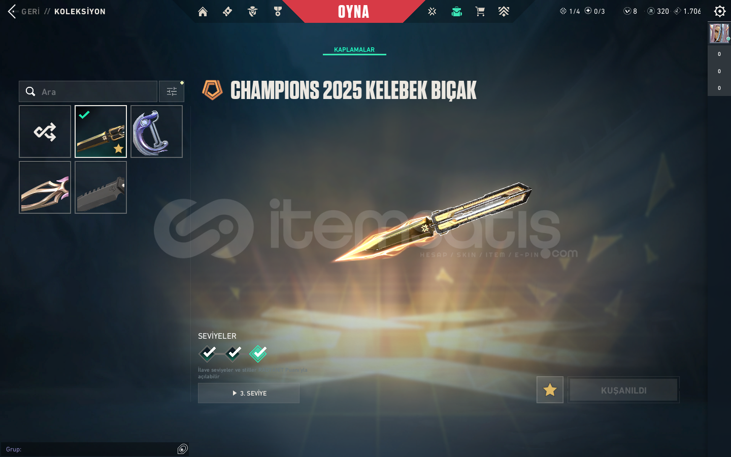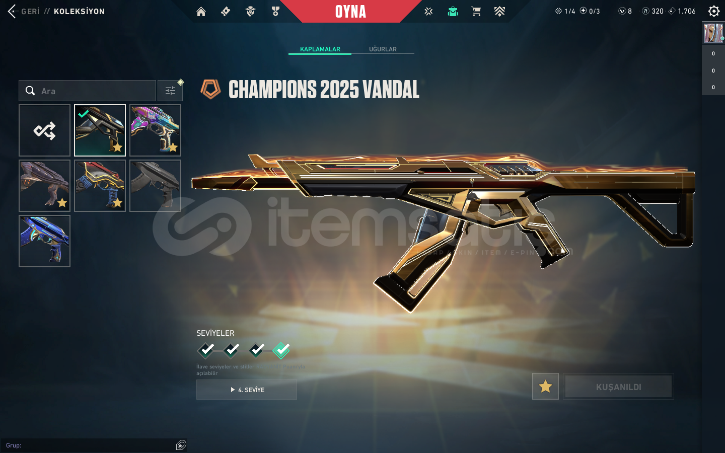 300 SeviyeEn Yüksek Dia EloOni VandalÖzel Harekat PhantomChampions 2025 VandalChampions 2025 KelebekYağmacı Odinİyon OperatörKaosun Başlangıcı SheriffEjder VandalDelipop VandalSpectrum ClassicSır Çiçeği Kunai