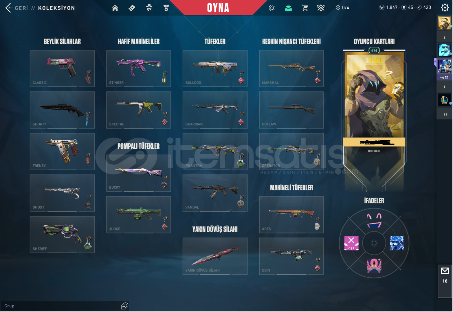 HESAP peak 401 rrdır ŞUAN immortal 2 FULLL ARTI FULL HERŞEY VAR!!! motor alıcam acil ihtiyaçtan dolayı satılıktırVANDAL 6 yükseltilebilirPHANTOM 5 yükseltilebilir skin varYağmacı phantom ve yağmacı Vandal görselde çıkmamışgörselde 14 TANE BIÇAK VAR GORSELDEKİLER HARİÇ 2 TANE DAHA BATTLE PASS VAR VE BATTLE PASS'DEN BİR TANE DAHA GELİCEK TOPLAM 15 BIÇ...