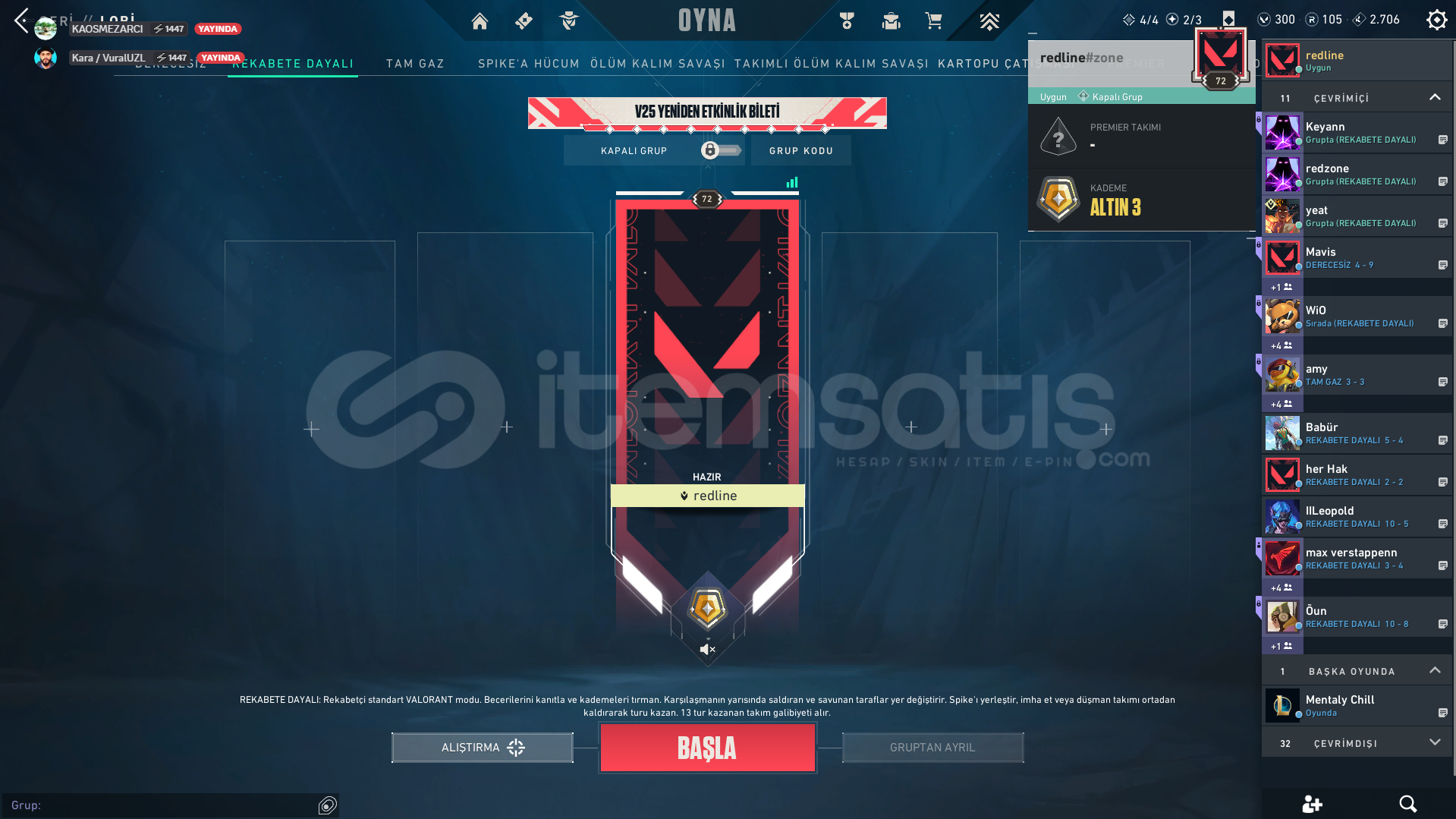 (KENDİ ŞAHSIMA AİT VALORANT HESABIMDIR, ÇALMA VB. SÖZ KONUSU DEĞİLDİR. OYNAMADIĞIM VE HIZLICA ELDEN ÇIKARMAK İÇİN UCUZA SATIYORUM. MAİLLİDİR, HIZLILIK VE GÜVEN ESASTIR.)İÇİNDEKİLER:CYRAX VANDALKAOSUN BAŞLANGICI PHANTOMUZAYLI AVCISI BIÇAĞI72 SEVİYEALTIN 3300VP MEVCUT... TR İLETİŞİM İÇİN BURADAN YAZMANIZ YETERLİDİR.PAZ...