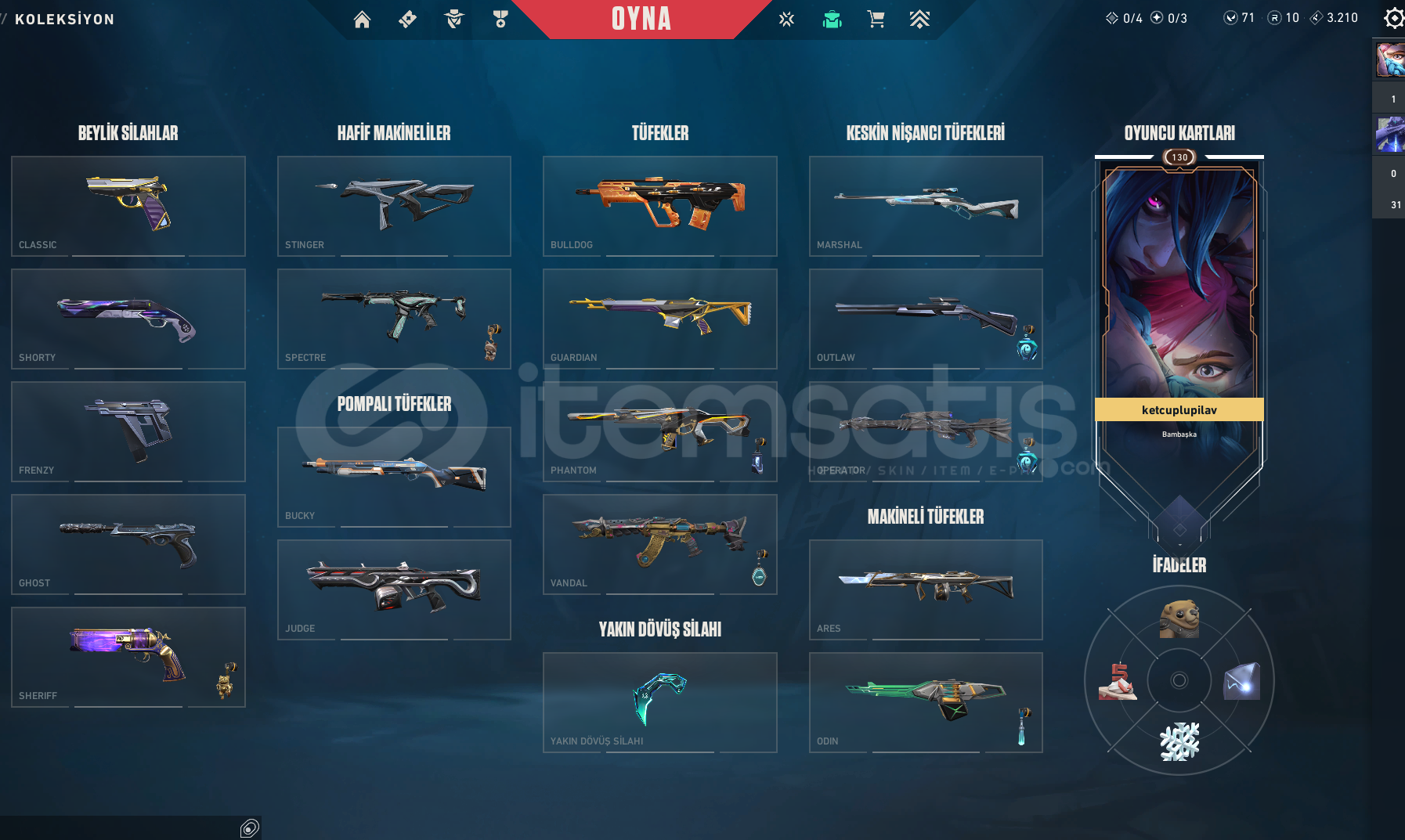 Full + Full Plat görmüş hesapVANDAL: Arcane,Yitik,Anomali,Kuronami,Yağmacı,CyraxPhantom: 2024 Champions,Şimşek,OniBıçak: VCT 2025,Arcane,Kuronami,Champions 2024,EX.O,RGX Karambit, RGX Kelebek,Cyrax,Şimşek,Asil karambitSheriff: Seri Tetik,İyonGhost: Cesur Yürek,Cyrax,SihirpunkFrenzy: ŞimşekClassic: Asil,YitikSpectre: Yağmacı,ŞimşekGuardian: Cyrax,AsilStinger: CyraxAutlaw: ŞimşekOperatör...