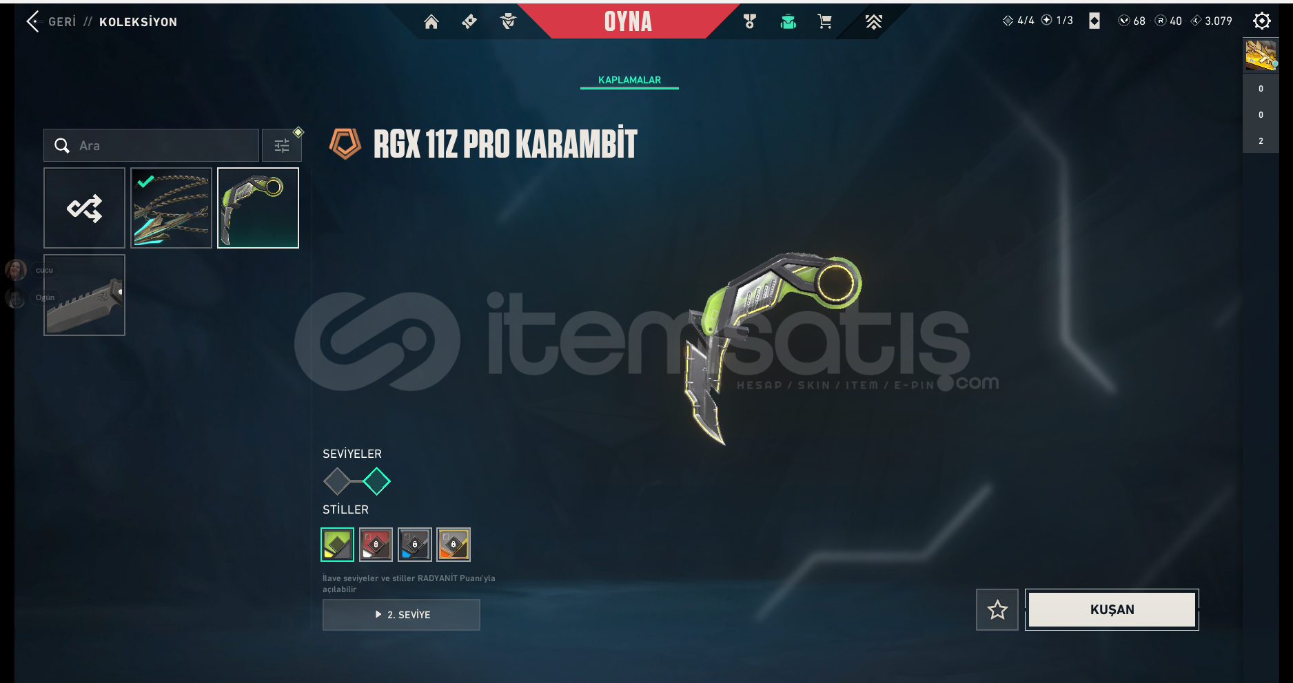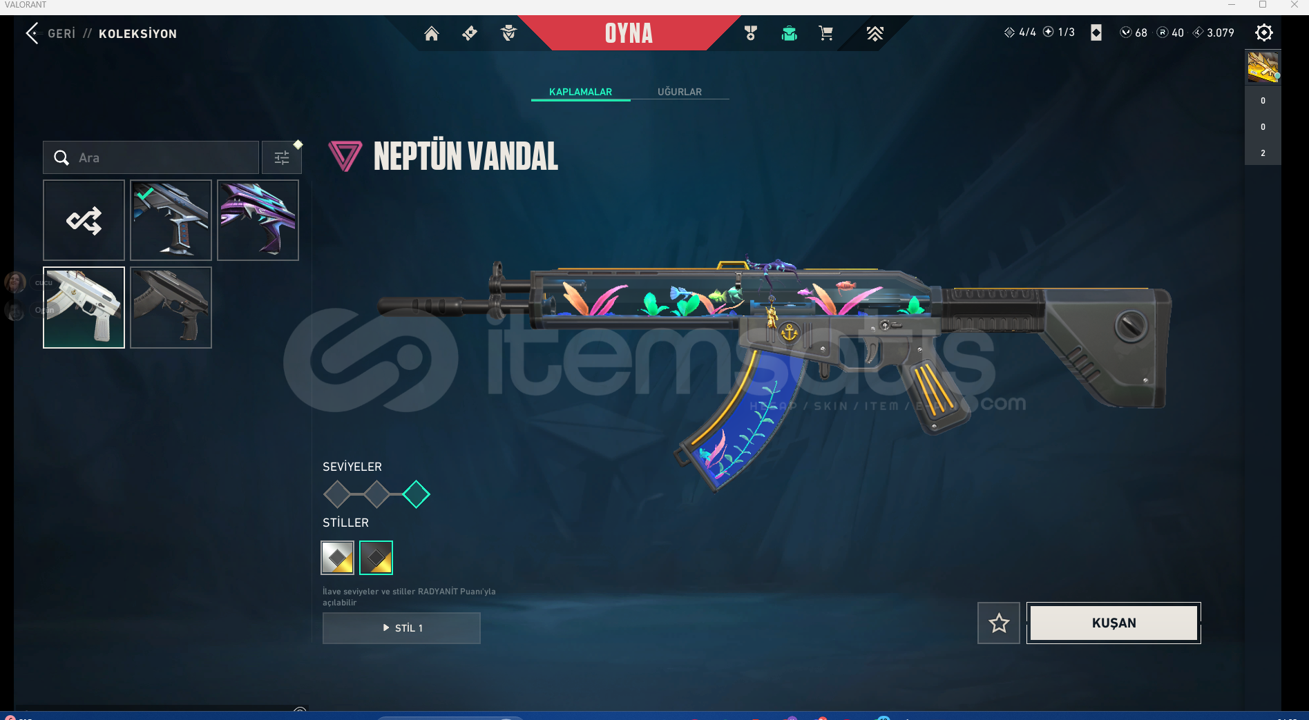protokol şerif 2475 vp - neptün vandal 1775vp - kuronami vandal 2375 vp - sihirpunk phantom 1775 vp - ışık muhafızı operatör 2175 vp - yıldızparçalayan bıçak 5350 vp en pahalı bıcaklardan - rgx karambit 4350 vp - battlepass 1000 vp  Bu skinlere sahiptir altın 1 mainlik uygun fiyatları skinleri sağlam hesaptır