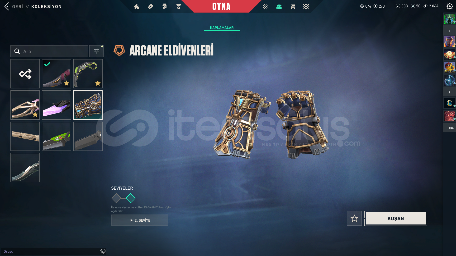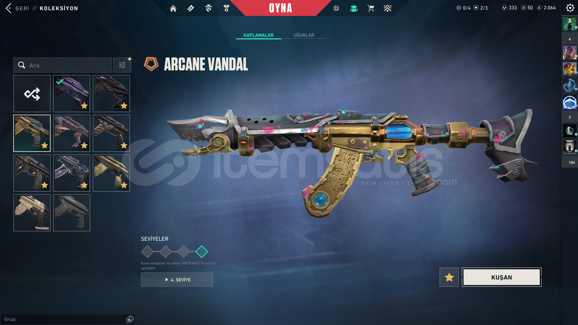 Hesap içinde onlarca skin var içinde bir daha gelmeyecek olan ARCANE VANDAL VE Vİ'NİN ELDİVENLERİ ile oyunda rakiplerinize görünüş olarak üstünlük kurabilirsiniz. 10k TL ÜSTÜ HESAP