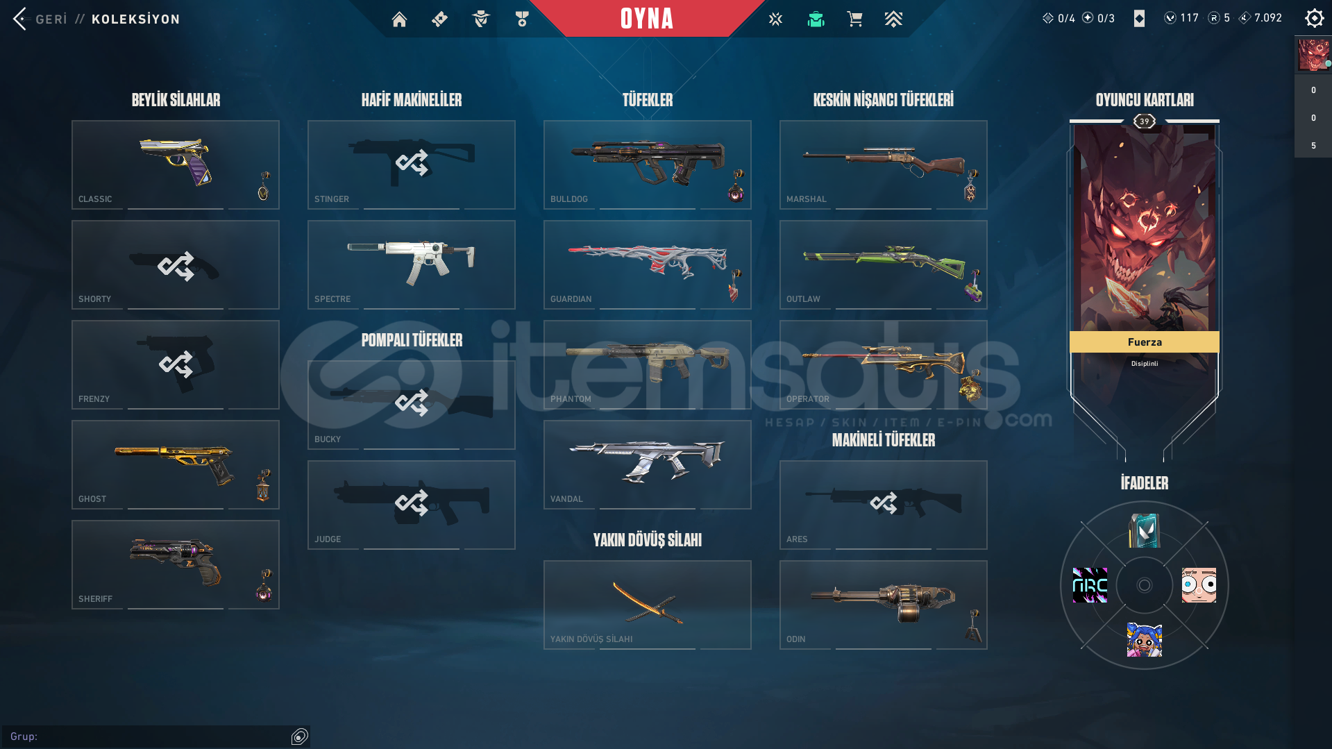 TR Mainlik Dolu Hesap! Hesabın rankı aktif DIA 1 BIÇAKLAR EX.O KILICI RGX 11Z PRO KARAMBİT KAOS GÜRZÜ VANDAL Kaosun Başlangıcı Vandal Kuronami Vandal EX.O Vandal PHANTOM Kaosun Başlangıcı Phantom Özel Harekat Phantom Oni Phantom Kaosun Başlangıcı Bulldog TABANCALAR Asil Classic Faz Koruyucu Ghost Kaosun Başlangıcı Sheriff SPECTRE Kaosun Başlangıcı Spectre Neptun Spectre NİŞANCILAR RGX Outlaw Seri Tetik Marshal Cesur Yürek Operator Seri Tetik Odin Gaia Guardian